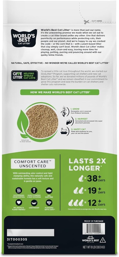 Comfort Care Cat Litter - 8 lbs of Quick Clumping & Long-Lasting Odor Control ‹ › ‹ › ‹ › ‹ › ‹ › ‹ › ‹ › ‹ › ‹ › ‹ › ‹ › ‹ › Comfort Care Cat Litter 8 lbs of Quick Clumping & Long-Lasting Odor Control Features: Outstanding Odor Control: Natural unscented litter ensures your cat's litter box remains fresh with long-lasting odor protection. Quick Clumping & Easy Scooping: Fast-acting formula eliminates hassle by creating tight clumps for easy scooping—no chiseling or scraping required. Flushable - Septic Safe: A lightweight, flushable litter that is tested and proven safe for septic and sewer systems, making cleanup a breeze. Lightweight & 99% Dust Free: Naturally free of silica dust, this litter minimizes tracking and offers lower mess, ensuring fresh and easy breathing for both you and your feline friend. Pet, People, and Planet Friendly: Made from whole-kernel corn, this product is free from harmful chemicals, artificial perfumes, and clay dust. Proudly made in the USA, it is safe for you, your cat, and the environment. Benefits: Easy cleanup with exceptional clumping ability. Long-lasting odor control keeps your home fresh. Flushable design reduces waste and is eco-friendly. Dust-free formula protects respiratory health for both pets and humans. Safe for all life stages of cats, providing peace of mind. Why Choose Comfort Care Cat Litter? Transform your cat care routine with Comfort Care Cat Litter, a superior product designed to simplify litter box maintenance while ensuring a fresh environment. With its remarkable odor control and quick clumping capabilities, you'll never have to fear unpleasant smells or messy cleanups again. Flushable for easy disposal and 99% dust-free for a healthier home atmosphere, this litter does it all. Join countless satisfied pet owners who prioritize their cat's happiness and wellbeing. Choose Comfort Care Cat Litter for an exceptional litter experience—order now for a cleaner, fresher home! Shipping Free & Fast Shipping - We offer free shipping to most of the USA with a normal delivery time of 3-7 days. However, due to the current situation, additional delivery time (up to 3 weeks) may be required for some items. Alternative Carriers - We may use alternative carriers (e.g. USPS, FedEx, UPS, etc.) to ensure your package arrives safely and on time. Due to the use of multiple carriers, we are unable to provide a tracking number automatically. Handling Time - Orders are processed and shipped within 1-2 business days of receiving cleared payment. Shipping Restrictions - Shipping to Alaska, Hawaii, Puerto Rico, Guam, and other US territories may incur shipping charges or delivery restrictions. Please contact us before ordering, or your order can be refunded/cancelled. State Restrictions - There may be restrictions based on your state of purchase. For example, certain items may not be shipped to California due to state regulations. Contact for Tracking Updates - If you require tracking updates or have any concerns about the delivery of your order, please feel free to contact us, and we will be happy to assist you. Return 30-Day Hassle-Free Returns - We want you to be completely satisfied with your purchase. If you are not, you can return the item within 30 days of receiving it for a full refund or exchange. Easy Return Process - To start a return, simply contact us and we will provide you with a prepaid return shipping label and detailed instructions. Restocking Fee - There are no restocking fees for returns. However, the buyer is responsible for return shipping costs if the return is not due to a seller's error. Refund Processing Time - Refunds will be processed within 5 business days of receiving the returned item in its condition. Payment We accept all major credit cards, PayPal, and Apple Pay for your convenience. Your payment information is secure and encrypted to ensure a safe and seamless transaction. Please complete your payment within 3 days of purchase to avoid any delays in shipping. Feedback Your feedback is extremely important to us. We strive to provide the best products and customer service possible. If you are satisfied with your purchase, please take a moment to leave us a positive review. If you have any concerns or issues with your order, please contact us before leaving negative feedback. We are committed to resolving any problems and ensuring your satisfaction. Contact Us If you have any questions or concerns, please feel free to out to our customer support team. You can contact us through the eBay messaging system. We are available Monday to Friday, 9:00 am to 5:00 pm EST, and we will do our best to respond to your inquiry within 24 hours. Buy it now and enjoy a pleasant shopping experience! Type: Clumping Litter