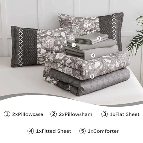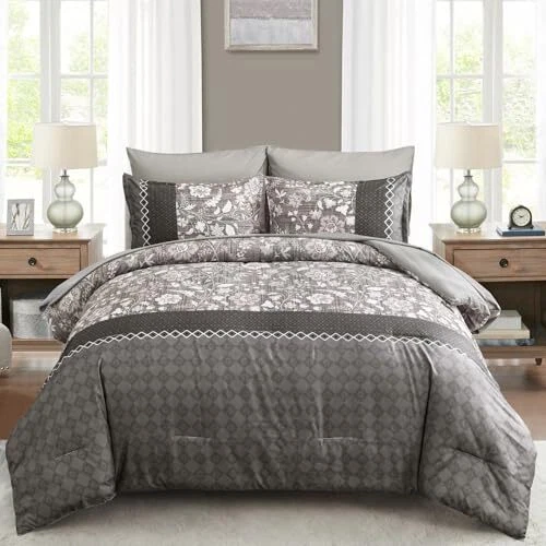 Return Policy Fast Delivery Trusted seller Grey Comforter Set Queen, 7 Pieces Bed in a Bag Floral Geometric Patchwork Soft Microfiber Comforter Bedding Set withComforter, Flat Sheet, Fitted Sheet, Pillow Shams,Pillowcases Product Description 【7 PIECES QUEEN BED IN A BAG】: Grey floral geometric patchwork comforter bed in a bag queen with 1 Comforter 90" x 90" + 2 Pillowcases 20" x 26"+ 1 Fitted Sheet 60"x 80"+14"+ 1 Flat Sheet 90"x 102"+ 2 Pillow Shams 20"x 30". 【BOHEMIAN FLORAL GEOMETRIC PATCHWORK PATTERN】: Gray boho floral geometric patchwork design, can be matched with any style of room, bring noble and elegant visual experience, the best gift for family and friends ! 【SOFT MICROFIBER BEDDING SET】: Grey comforter queen size made of high quality and lightweight microfiber, fluffy and soft to the touch, light and breathable, bringing you the ultimate tactile enjoyment of your skin and providing you with a healthier quality of sleep all year round. 【EXQUISITE WORKMANSHIP】: Queen bed in a bag comforter size set is simple elegant bedding, several invisible stitching prevent the filling from shifting or leaking out,the firm stitching ensures it will last for years to come. 【EASY CARE】: High-quality fabric is not easy to tear, machine wash in the gentle cycle with cold water, do not bleach, keep the original color after washing. Shipping Returns Payment Shipping Shipping is FREE to all addresses other than APO/PO boxes in the lower 48 states. All our stock ships from US-based warehouses. Shipped via USPS or UPS (depending on location and package weight) Unless stated otherwise, all orders will ship within 24-72 hours of your payment being processed. Check our feedback to see the great reviews of FAST shipping we offer. Returns Seller does not accept returns Payment We currently accept payment via eBay managed payments only. Once payment is cleared, we will dispatch your shipment within 1-3 business days. Please refer to the "Shipping" tab for more information regarding shipping speed to your destination.