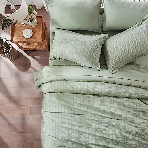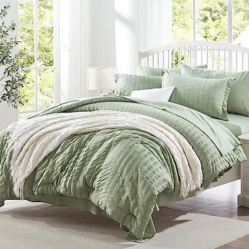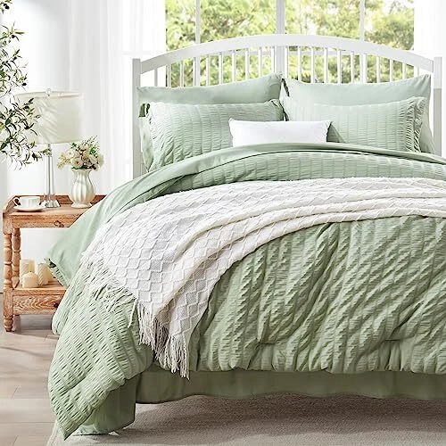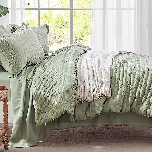 Return Policy Fast Delivery Trusted seller Queen Comforter Set 7 pieces, Sage Green Seersucker Bed in a Bag with Comforter and Sheets, Lightweight Bedding Sets with 1 Comforter, 2 Pillow Shams, 2 Pillowcases, 1 Flat Sheet, 1 Fitted Sheet Product Description BED IN A BAG: 's bedding comforter sets include 1 sage green queen comforter (88"x88"), 2 Pillow Shams 20"x26", 1 Flat Sheet 90"x102" , 1 Fitted Sheet 60"x 80"+14" and 2 Pillowcases 20"x30". deep elastic pocket fitted sheet fits up to 14", which wildly fits your mattress bed. MORE THAN COMFORT: Our queen bedding comforter set is 100% microfiber . Incredibly soft fabric with 270 GSM filling keeps you warm and cozy for all seasons, which feels smooth and skin-friendly. More durable and breathable than ordinary materials. Let you have a fantastic sleeping experience. CHIC DESIGN: This bedding comforter & sets are designed with textured seersucker to add a sense of romance to your bedroom, creating an elegant style for your life, and enjoy this lightweight bedding set in every moment. EASY TO CARE: Machine wash on cold water separately. Gentle cycle. Tumble dry low. Do not bleach. Our bed comforter could withstand years of use with proper care. It may be flat when you first open it, and please allow a few hours for complete fluffing. BEST SERVICE: is committed to offering our customers the best service and premium products. Our dedicated team will try their best to solve problems ASAP! If you have any questions or concerns about our comforter set, please don't hesitate to contact us. Shipping Returns Payment Shipping Shipping is FREE to all addresses other than APO/PO boxes in the lower 48 states. All our stock ships from US-based warehouses. Shipped via USPS or UPS (depending on location and package weight) Unless stated otherwise, all orders will ship within 24-72 hours of your payment being processed. Check our feedback to see the great reviews of FAST shipping we offer. Returns Seller does not accept returns Payment We currently accept payment via eBay managed payments only. Once payment is cleared, we will dispatch your shipment within 1-3 business days. Please refer to the "Shipping" tab for more information regarding shipping speed to your destination.