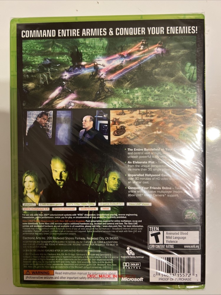 "Command & Conquer 3: Tiberium Wars" for the Microsoft Xbox 360 is a war-themed video game published by Electronic Arts. The game is rated T-Teen and falls under the genre of war games. Players can engage in strategic warfare and control their armies as they battle it out in the Tiberium universe. With real-time tactics and immersive gameplay, "Command & Conquer 3: Tiberium Wars" offers an intense gaming experience for fans of the series and those looking for a challenging strategy game.