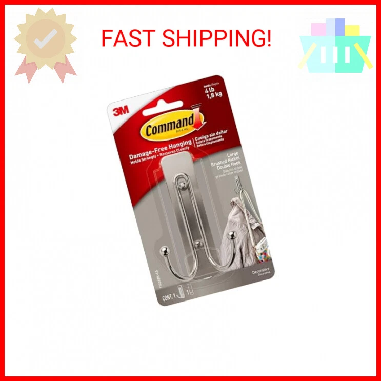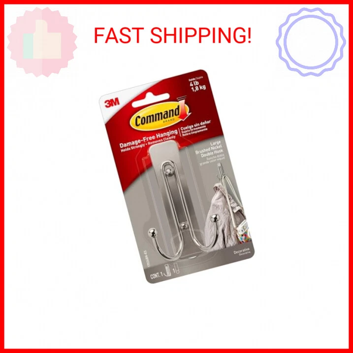 Command Large Wall Hooks, Damage Free Hanging Wall Hooks with Adhesive Strips, No Tools Double Wall Hooks for Hanging Decorations in Living Spaces, 1 Brushed Nickel Plastic Hook and 1 Command Strip - HOLDS UP TO 4 POUNDS: One package of the Command Large Double Wall Hooks includes one large wall hook and one large adhesive strip; each adhesive wall hook can hold up to 4 pounds - DAMAGE FREE HANGING: Wall hooks work without leaving holes, marks or sticky residue so you can move and rehang hats, keys, small bags, lanyards, college dorm decor or as a coat hook to hang lightweight outerwear - WORKS ON A VARIETY OF SMOOTH SURFACES: Adhesive wall hangers work on a variety of smooth surfaces, including painted walls, finished wood, painted concrete cinder blocks, laminate, glass, metal and tiles in your dorm or rental - SURFACE PREP: Clean with rubbing alcohol to remove grime and dust to allow the hanging hooks to bond to the surface; the indoor temperature must be between 50 degrees Fahrenheit and 105 degrees Fahrenheit - USAGE TIPS: Wait seven days after painting before using the Command Hooks to allow paint to cure; do not hang over beds or on wallpaper **wall hooks for hanging - EASY CLEAN REMOVAL: Lightly hold the top of the wall adhesive strips and slowly pull straight down towards the floor to remove the 3M Hooks holding college dorm decor and prevent damage of walls and surfaces Payments We accept the following payment methods PayPal Support Our dedicated customer support team is here to assist you from 9AM to 5PM Monday through Friday, excluding public holidays. Should you reach out to us and not recieve an immediate response, it's likely due to a higher-than-usual volume of inquires. We want to reassure you that your concerns are important to us, and we're working dilligently to get back to you. Expect a response by the next business day at the latest. Your understanding and patience are greatly valued as we strive to provide you with the best support possible! Shipping All orders are processed within 5 business days. Shipping estimates may be shown on this listing by eBay, and these are often not an accurate reflection of our shipping times. If we are experiencing a high volume of orders, shipments may be delayed by a few days. Please allow additional days in transit for delivery. If there will be a significant delay in shipment of your order, we will contact you via message. Shipping rates & delivery estimates Shipping is often free, but if charges for your order apply they will be calculated and displayed at checkout.