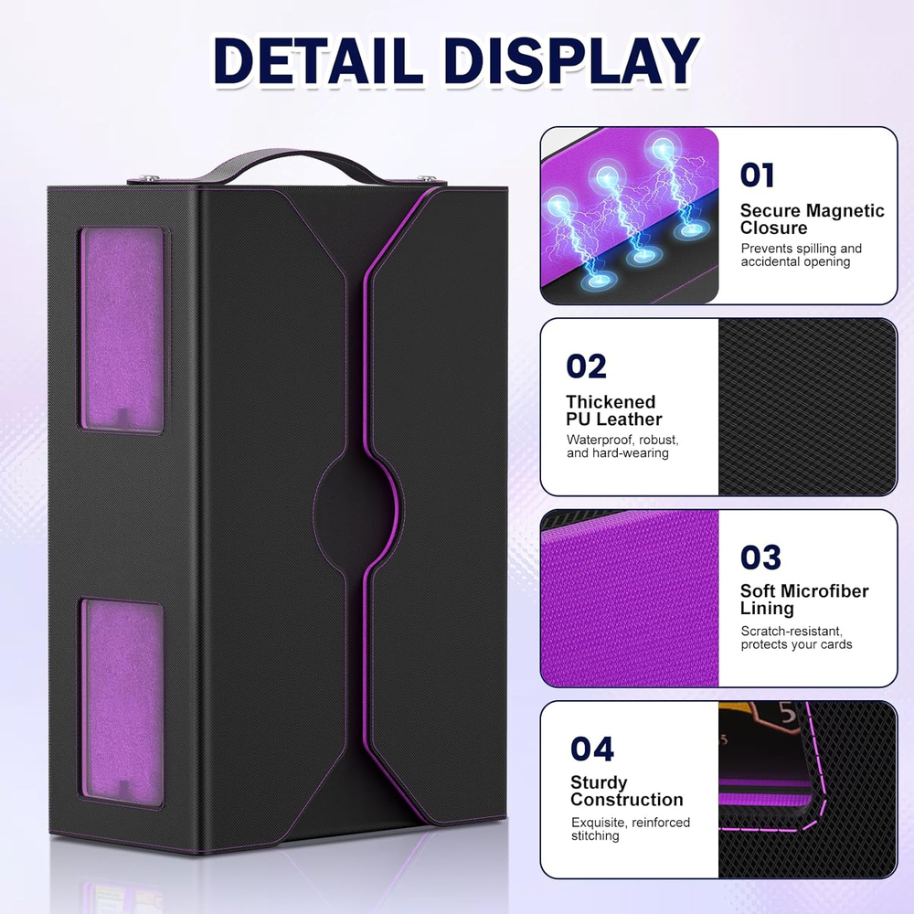 5-in-1 Modular Design: Features 4 removable card boxes and 1 large central storage box that doubles as a dice tray. Store all tokens and accessories, eliminate clutter from scattered boxes. Organize all your gaming gear in one portable case, a thoughtful gift for dedicated players Stylish and Portable with Display Windows: A sturdy, rivet-fixed top handle makes it easy to grab and go for game nights, tournaments, or travel. Each mtg deck box features a clear display window, comes with 4× 35PT magnetic acrylic card holders. Safely showcase your commander or rare cards for instant recognition and elegant display Magnetic Secure Closure: Each deck box attaches firmly with built-in strong magnets for smooth insertion and secure hold. Cards stay protected even when shaken or inverted, delivering maximum security for your valuable collection during transport All-Round Premium Protection: Constructed with thickened PU leather and reinforced stitching, waterproof, robust, and hard-wearing. The plush microfiber interior lining gently protects your cards from dust, scratches, and wear, keeping them in mint condition over time Ideal Gift for Card Enthusiasts: Designed for serious collectors, each card case holds 100+ double-sleeved cards, 140+ single-sleeved, or 240+ unsleeved cards to support growing collections. Includes 10 dividers for organization. With its massive capacity and luxurious look, it's the ideal gift for MTG, TCG, and sports card collectors Product description