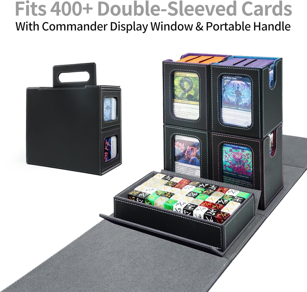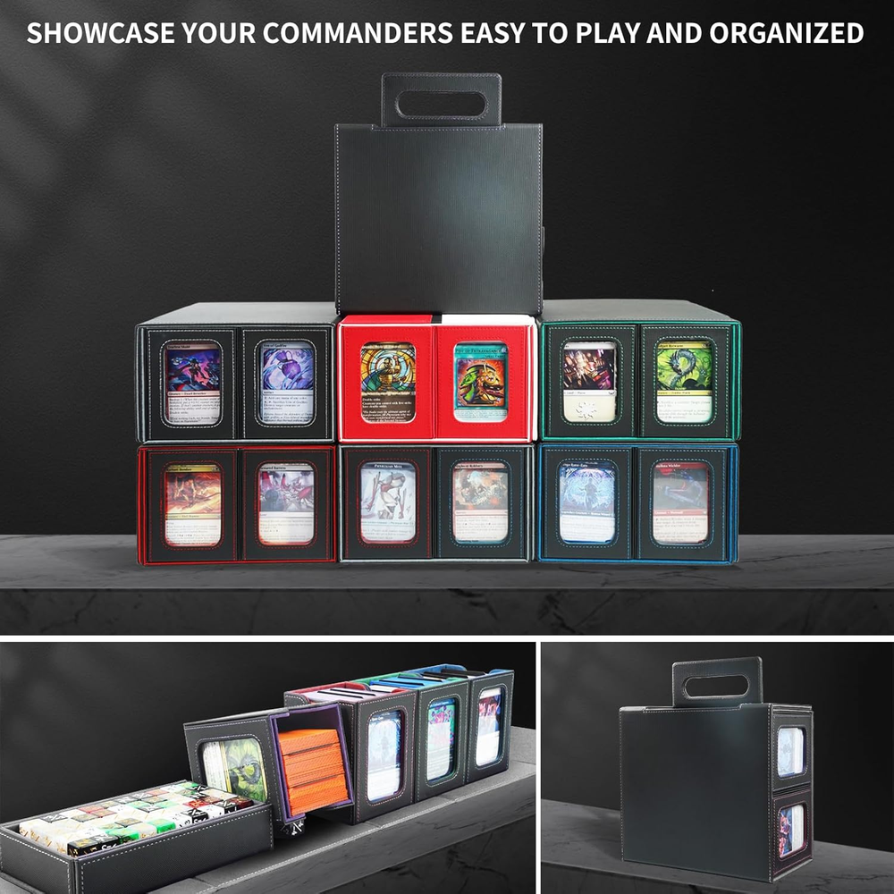 5-in-1 Commander Deck Box with Display Window:Patented modular design includes 4 removable deck cases, each with a transparent display window and rigid Toploader holder—perfect for showcasing your Commander or rare cards. This trading card organizer lets you quickly identify decks at a glance while keeping them safe and secure. Large Capacity – Card Storage Box for MTG & More:Fits 400+ double-sleeved cards, with each inner case holding up to 100 cards. Compatible with unsleeved, single-sleeved, and double-sleeved decks—ideal as an MTG card holder, EDH deck box, or storage solution for various trading card games and collectible card games (TCG/CCG). Extra Protection & Organized Deck Cases:Comes with 4 rigid Toploader holders for your most valuable cards and 8 colorful dividers to sort decks easily. This detachable modular card storage box keeps cards upright and prevents bending or damage—perfect for collectors and competitive TCG players. Premium Build with Strong Magnetic Closure:Crafted with waterproof PU leather, reinforced stitching, and a soft microfiber interior. Powerful magnets hold every component securely in place, making this a durable trading card storage solution and premium MTG card holder built to last. Oversized Dice Tray & Portable Handle:The large dice tray keeps tokens, counters, and dice neatly stored and doubles as a rolling tray during play. Combined with a sturdy, ergonomic handle, this deck box is designed for travel and game nights—a perfect gift for trading card collectors and TCG fans. Product description AFIING 5-in-1 Commander Deck Box — Modular Storage for Card Collectors Finally a deck box that actually fits double sleeves A premium multi-deck storage solution with transparent display windows, removable deck cases, and a portable handle for players who value both function and design. 5-in-1 Commander Deck Box with Display Window 5-in-1 Commander Deck Box with Display Window Store up to4 mtg deck box commander and one dice tray in a single organized system. Each removable case includes a transparent display window to showcase your favorite cards while keeping them safe and dust-free. Large Capacity & Flexible Fit Holds over 400 double-sleeved cards—ideal for trading cards, collectible decks, or custom sets. Each mini deck box fits up to 100 cards, keeping your decks separated and easy to access. Includes 8 dividers for easy sorting Keeps cards upright, secure, and protected from bending Built for Commanders, but perfect for any TCG — Magic, CCG, or collectible cards. Complete Protection & Organized Storage A large detachable dice tray stores dice, counters, and tokens Doubles as a rolling tray during gameplay The sturdy handle lets you carry your decks with ease — from home to tournaments Makes a p erfect gift for Magic Commander players, TCG collectors, or friends who love organized gaming setups. Each magic the gathering deck box comes with 4 rigid toploader holders for your most valuable cards and 8 dividers to keep decks sorted. The MTG deck box commander structure prevents cards from bending or scratching — a must-have commander box for serious Magic the Gathering fans and TCG collectors. Premium Build with Strong Magnetic Closure Crafted with waterproof PU leather, reinforced stitching, and a soft microfiber interior, this deck box MTG commander combines luxury with strength. The durable magnetic closure keeps each commander deck box securely in place. Built to last, it’s the ideal MTG deck box with dice storage for travel and daily use. Engineered for long-term use and premium feel: Waterproof PU leather exterior with elegant contrast stitching Soft microfiber interior to protect card sleeves Powerful magnetic seals on every lid for reliable security This isn’t just a storage box — it’s a display-worthy card vault. It can easily carry around with your The magnetic lid effortlessly flips open, revealing a sleek briefcase-style handle that lies flat for storage or pops out for easy carrying. It’s a genius feature—perfect for hauling a massive stack of cards with premium convenience. The ergonomic handle and deck box commander layout make this the perfect MTG commander deck box with dice storage for on-the-go players. Whether you’re heading to local game nights, tournaments, or conventions, AFIING’s magic the gathering commander deck box is designed for portability, style, and performance — a thoughtful gift for any MTG or TCG player. Let’s be real: this isn’t your budget deck box. It’s an investment, but every dollar shows in the rock-solid quality and smart design details that make it stand out.