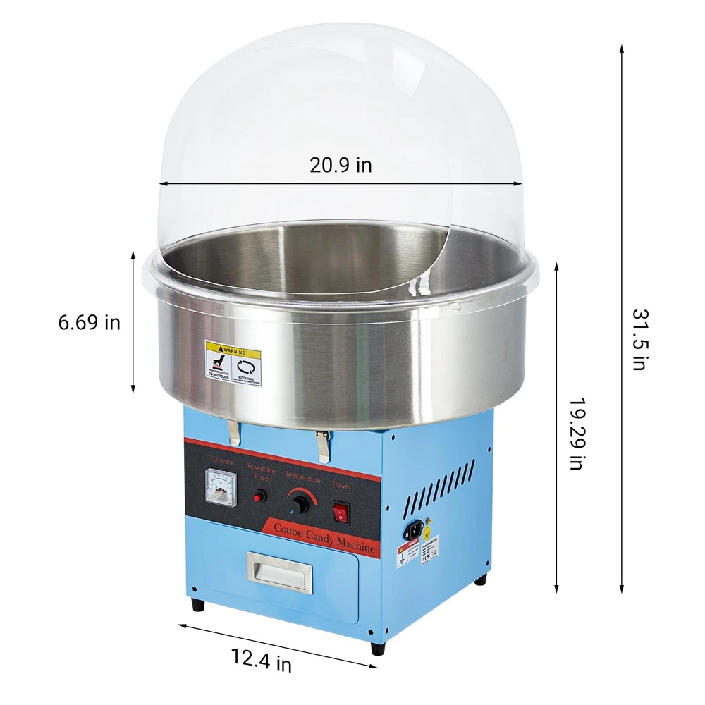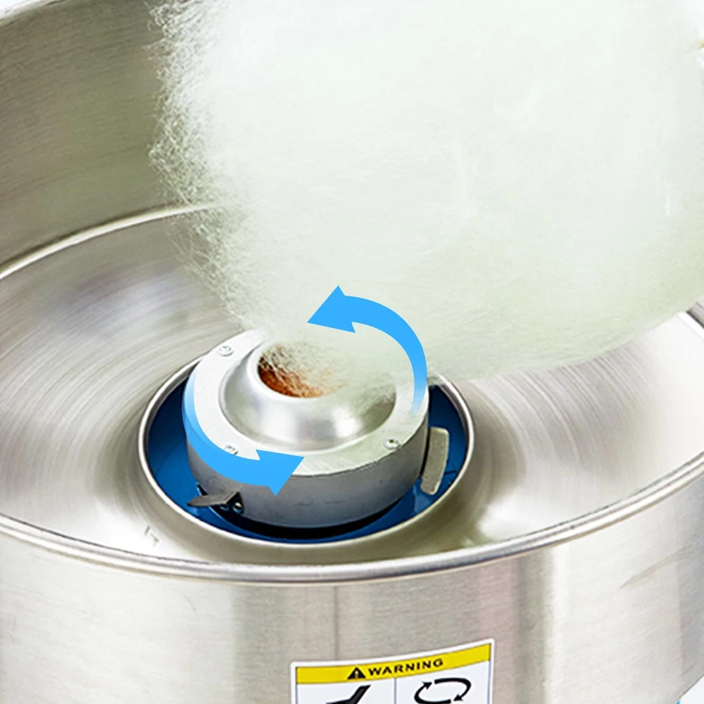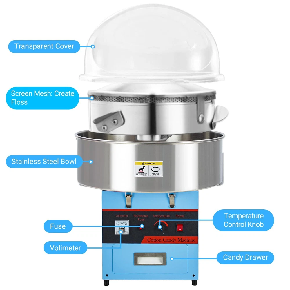【High Output Performance for Commercial Use】Meet the demands of high-volume cotton candy production with our powerful 980W Commercial Cotton Candy Machine. Its larger candy bowl not only ensures rapid production but also prevents blockages and shutdowns, allowing continuous operation for up to an hour. 【Precise Temperature Control】Experience the art of cotton candy-making with unmatched precision. Our electric cotton candy machine features advanced temperature control capabilities, including a voltage meter and an adjustable temperature knob that ranges from 149℉ to 473℉. 【User-Friendly Operation】Enjoy a hassle-free cotton candy-making experience with our user-friendly machine. Simply power it on, adjust the temperature according to your preferences, and let it warm up for about 5-6 minutes. Once ready, pour sugar into the spinning head, and start collecting the freshly spun cotton candy using the included sticks. 【Versatility for Creative Cotton Candy】Unleash your creativity with the versatility offered by our cotton candy machine. It accommodates a range of candy options, including traditional flossing sugars, milk sugars, fruit cubes, and even hard candies. This flexibility enables you to experiment with various flavors and textures, ensuring there’s something for everyone. 【Safe and Reliable Performance】Whether you're hosting a children's party or a large community event, you can count on the safe and reliable performance of this commercial cotton candy machine. Create sweet, fluffy treats that everyone will love, all while ensuring a secure environment for your guests.