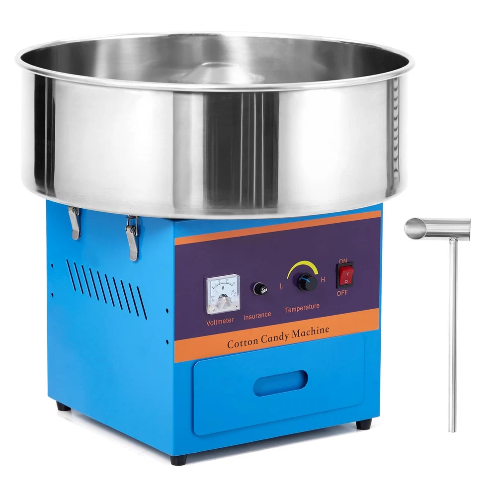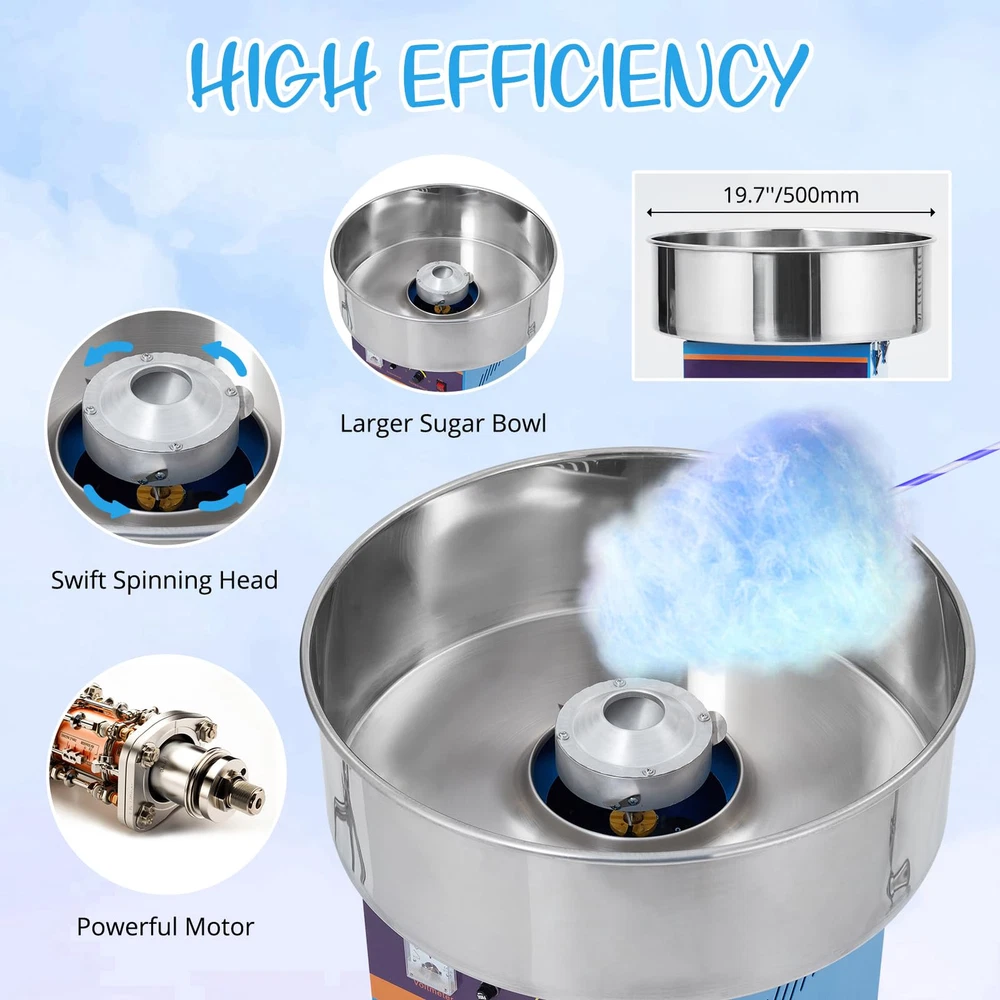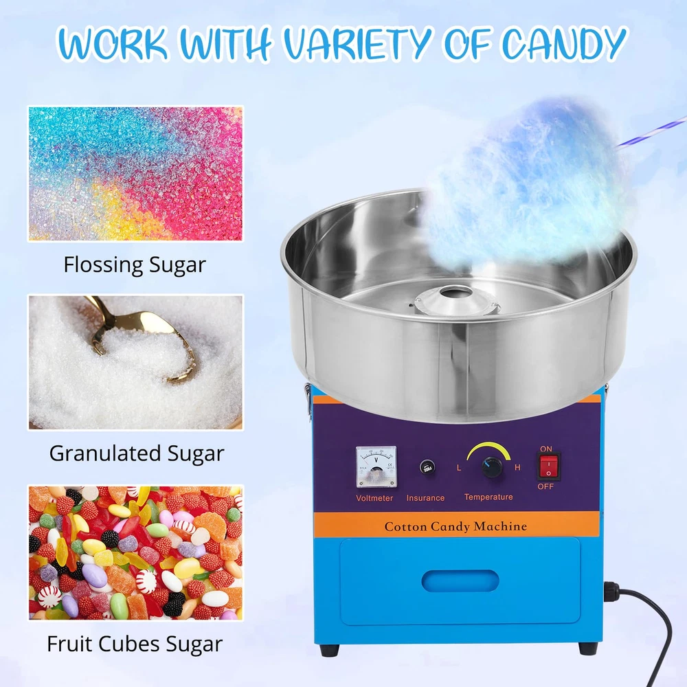 EASY-OPERATING PROCESS: This cotton candy maker is simple in structure and easy to install. All you need to do is to switch on the power, adjust the temperature, warm up for 3-4 minutes, then pour the sugar into the spinning head, and then just collect the cotton candy from the head with sticks. COMMERCIAL GRADE QUALITY: Our commercial cotton candy machine is equipped with 1000W heating power. The larger candy bowl ensures rapid cotton candy cones production for your large output demands. Perfect for commercial use or parties, wedding receptions, and even family and social gatherings. DIGITAL TEMP CONTROL: Unlike the common ones, our electric candy floss maker features a digital voltage display screen and a temp control knob. By changing the voltage, you can simply adjust the temperature from 149℉ to 473℉. Allowing you to try different flavored sugars with one machine. USER-FRIENDLY DESIGNS: This candy floss machine is equipped with a large drawer, which helps provide extra storage space for cotton candy cones/sticks or floss sugar packs. The sealing treatment components can prevent sugar flocs from falling into gaps. The sugar spoon as an extra offering is convenient for you to scoop and pour sugar, plus the ventilation holes on both sides are designed to facilitate heat dissipation. ENJOY YOUR COTTON CANDY TIME: This cotton machine allows you to use traditional flossing sugars, milk sugars, fruit cubes, or any of your favorite hard candies to make delicious cotton candies. The stainless steel bowl owns a large diameter of 20 inches, which is quite easy to be removed, making cleanup a breeze at the end of the event.