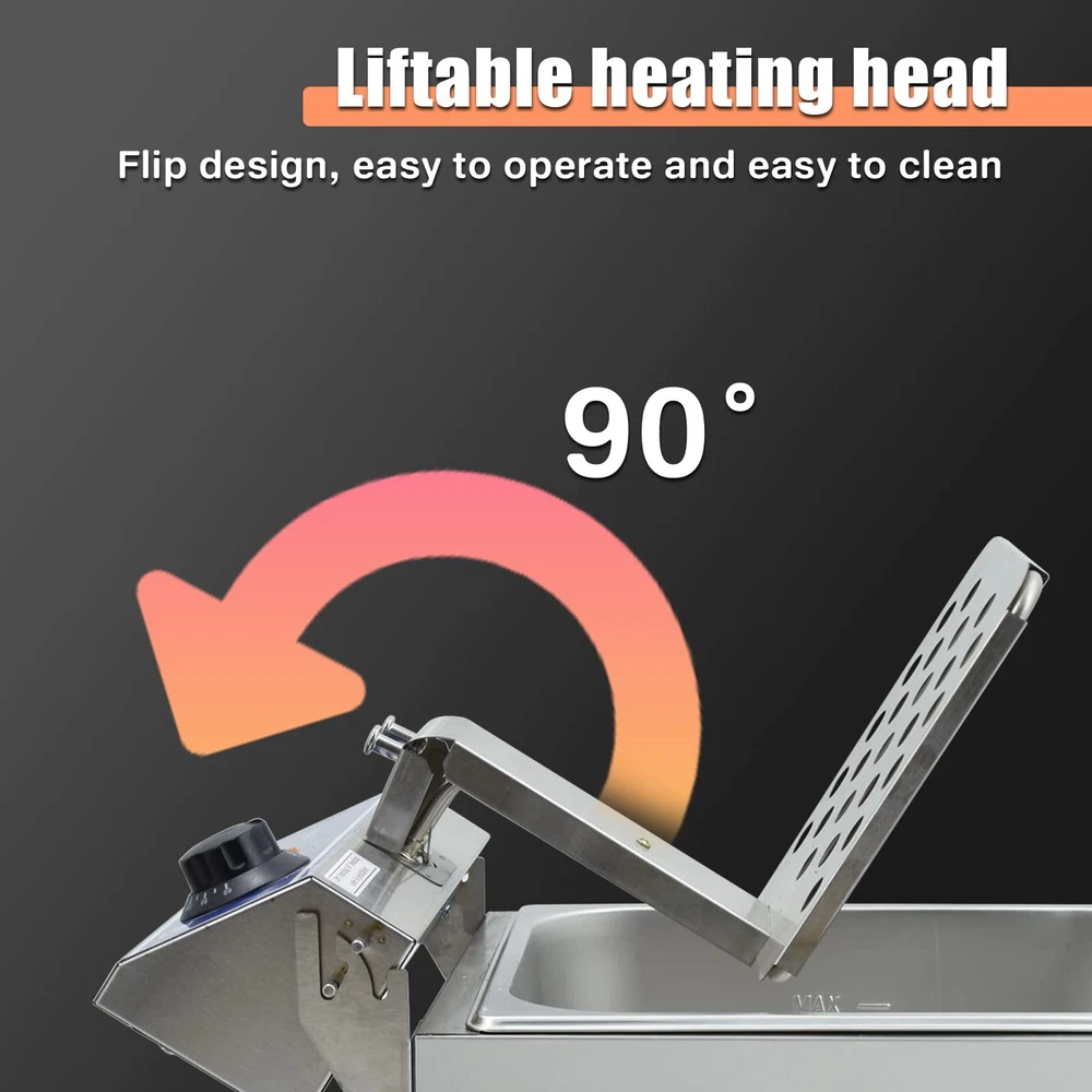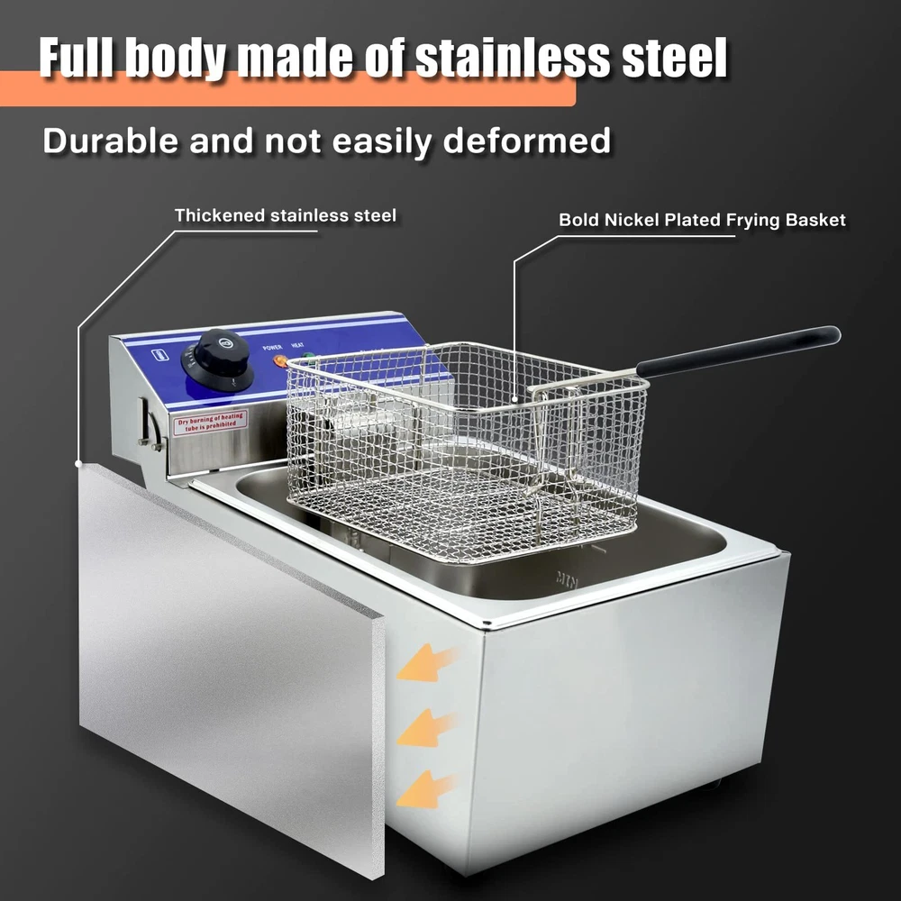 Specifications ・Product type: deep fryer ・Voltage: 110V 50Hz ・Power: 1500W ・Container Capacity: 10L ・Max oil capacity: 6 L ・Temperature Range: 50-200°C ・Product Dimensions: 30x28x45 cm(11.8x11x17.7") ・Basket Size: 18*21*10cm Product Description Commercial-stainless steel, stainless steel construction and heating tube ensure longer life span. The max temperature 200°C, but the deep fryer will produce heat loss in the work, the actual oil temperature is about 150°C Removable oil reservoir makes cleanup a snap and is easier to filter & leftover oil Food basket with carrying handles for ease of cleaning Single tank Comes with stainless steel fryer basket and plastic handles for preventing scald. Cover for preventing the boiling oil from splashing, and exteriors that don't get hot Varying temperature selection dials allows to deep fry your food perfectly. Immersion deep fryer featured with extended heating pipe heat up more quickly Comes with "reset protecting button for overheating". Simply press the reset button the next time you use it. ON/OFF switch and indicator lights to monitor the working procedure Perfect for commercial use, such as used in restaurants, fast food stands or home kitchen, can be used to fry french fries, chicken wings, chicken legs, fish, steak, etc Package Includes 1 X Deep Fryer 1 X Fryer basket 1 X Instruction Note 1. Please keep away from children. Never leave appliance unattended when it is connected to the power outlet. 2. To avoid a sudden power failure, it is recommended that the fryer should be plugged in a wall socket rather than a wiring plate type socket and the plugs are not allowed to plug in the same socket plate. 3. In order to avoid the product be scratched caused by transportation, there will be a protective film on the product. Please removed the protective film before use it. 【High quailty deep fryer】-Made up of food stainless steel, the commercial deep fryer is safe and solid. Distinctive features of this material lie in high impact, excellent corrosion, abrasion and low temperature resistance. 【Adjustable temerature control】-Deep fry at the right temperature with an adjustable thermostat(the temperature range is 50-200°C) for perfect frying results. You can set and enjoy the best flavor according to the food you fried. 【More safety】-The commercial fryer exterior basket with plastic handle lowers food into frying oil with the cover closed to prevent the boiling oil and food from splashing 【Fast heat up & Easy frying】-The commercial deep fryer features a 1500W heating element and an air filter to fry food quickly and to the perfect crisp. Clean oil filtration system for convenient deep frying, cost saving and simple oil storage. 【Wide use】-The freidora eléctrica de aceite is great for cooking French fries, onion rings, egg rolls, fried chicken and any other deep fried food. This fryer is perfect for commercial uses such as restaurants, supermarkets, fast food stands, snack bars or home use.