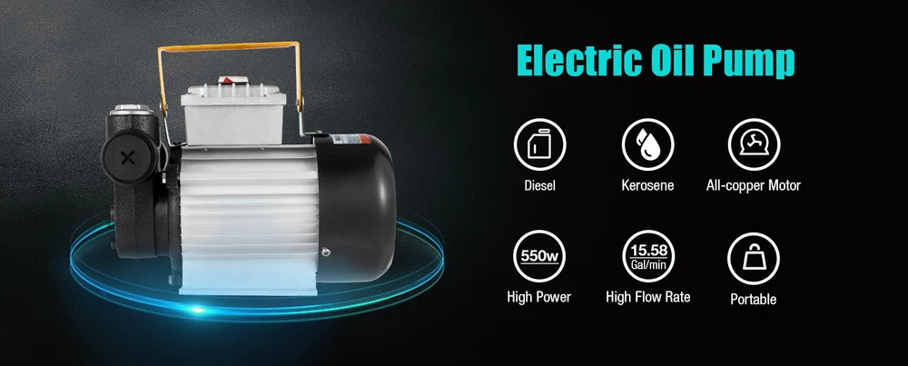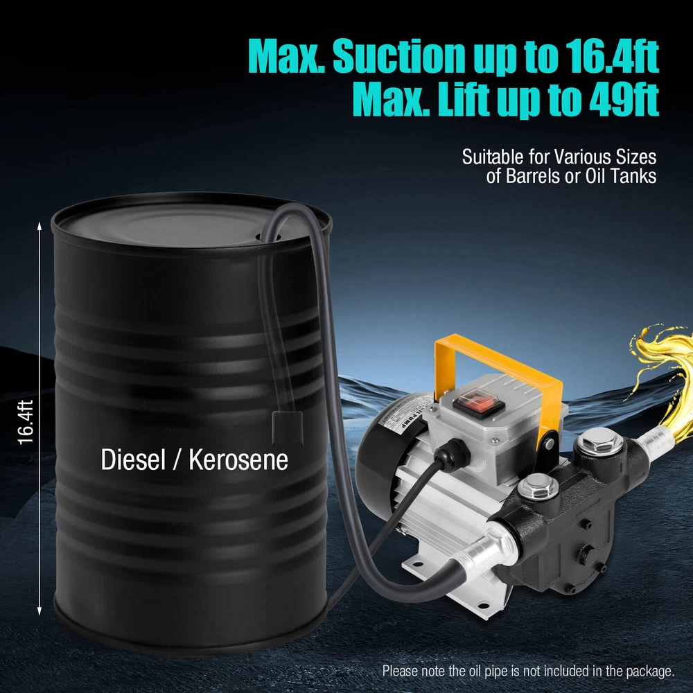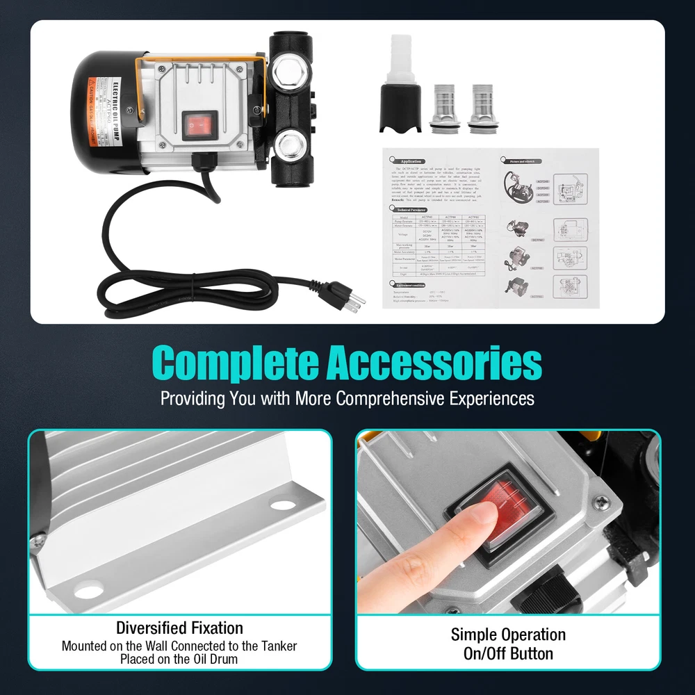 Specification Model: ACTP60 Process: Painting Color: Yellow, Silver, Black Material: Cast Iron, Aluminum Alloy, Copper Plug Standard: US Standard Motor: AC 110V 60Hz Flow Rate: 20-60L/5.28-15.85gal/min Power: 550Watts Self Priming Max. Speed: 3300rpm Suction Height: 5m/16ft Max Lift: 15m/49ft Commercial Electric Oil Transfer Pump For Fuel Self-priming 60L/Min 16GPM 110V Description The electric oil pump with a portable handle can make it easier for you to take it to the workplace. The powerful power of 550W can help you finish your work quickly and well. It is a "self-priming" electric oil pump, which means you do not need to fill the water pump before the first use. It will be a good helper for enterprises, mines, construction sites, fishing boats, pleasure boats, and small refueling points. Key Features High-quality Material: This product adopts an high-quality full copper coil, and cast iron structure. High-quality materials and painting process make it has the performance of anti-corrosion, anti-rust, and strong pressure resistance, thus can effectively extend the service life of the product. High Safety: The purple copper coil movement can improve the sealing, moisture-proof, and dust-proof, thus can ensure the efficient, low temperature, and safe operation of the motor. In addition, the waterproof switch protection cover and anti-breaking wire terminal can also better protect your use safety. Economical and Practical: This product uses a self-starting system and is able to work and cycle continuously, which improves your working efficiency effectively. This product comes with its own self-priming pump and bypass valve, so you don't need to buy these accessories separately. Low Noise: The precision alloy parts inside the product can effectively soundproof and reduce noise. It can create a quiet working environment for you. Easy to Carry: The portable ergonomic handle makes it easier to carry. And the lightweight product weighs only 19.84 lbs, allowing you to take it outdoors to work as you wish. Strong Power: It has a flow rate of up to 15.85gal and is capable of lifting water up to 16 feet. With a power of up to 550w and a speed of up to 3300RPM, our engine can produce a lot of power to help you get the job done fast and well. Easy to Clean: The built-in filter makes the blades not easy to accumulate dust and easier to clean. And the surface of the product is smooth to clean, you just need to use a wet rag to wipe it gently. Easy to Operate: All you need to do is connect the hose and accessories and plug it in, then it's ready to work. The one-touch switch design also makes this product easier to start and stop. Powerful Heat Dissipation: The internal configuration of the heat dissipation port is equipped with a high-power fan to make it have the performance of efficient heat dissipation, which can effectively extend the service life of the product. Easy to Install: The product is simple in construction with an English manual and complete accessories, so you can quickly complete the installation. The compact size allows it to be mounted on a wall or quickly attached to a tanker truck, or placed directly on a drum. Details 6.15ft Power Cord: The 6.15ft long power cord can reduce the space distance limitation for you to place the device, allowing you to use it more freely. Stable Base: The outward extending base is very stable and can guarantee the machine will not shake during operation. Multi-layer Oil Seal: The multi-layer oil seal ring can lock the liquid very well, thus guaranteeing the machine works dryly. Thickened Cast Iron Pump Head: The thickened cast iron construction makes it have higher working strength, so it is ideal for fieldwork. Rubber Antifouling Dust Plug: With a special rubber antifouling dust plug, it can effectively block dust and dirt to avoid damage to the inside of the machine. Application The applicable medium of this product is diesel oil and kerosene. It is mainly used for refueling mining machinery, engineering machinery, construction sites, fishing boats, cruise ships, small refueling points, and other equipment, as well as refueling and transmission of automobile self-provided power supply. Specification Model: ACTP60 Process: Painting Color: Yellow, Silver, Black Material: Cast Iron, Aluminum Alloy, Copper Plug Standard: US Standard Motor: AC 110V 60Hz Flow Rate: 20-60L/5.28-15.85gal/min Power: 550Watts Self Priming Max. Speed: 3300rpm Suction Height: 5m/16ft Max Lift: 15m/49ft Inlet and Outlet Size: 2.5cm/1in Power Cord Length: 1.88m/6.16ft Maximum Working Pressure: 3Bar Accuracy of Flowmeter: ± 1% Single Counting Range: 0 ~ 9999L/0 ~ 2641.46Gal (4-digit Liter, Maximum 9999L/2641.46Gal, Last 1-digit Liter with Scale) Assembly Required: Yes Gross Weight: 9.65kg/ 21.27 lbs Net Weight: 9kg/ 19.84 lbs Product Size: 30*20*20cm/ 11.8*7.9*7.9 in Package Size: 30*25*23cm/ 11.81*9.84*9.06in Package Included 1 * Electric Oil Pump Transfer Fuel Diesel 1 * English Manual 1 * Filter 2 * Connectors Notes 1.The motor of this product is ordinary and not explosion-proof. Therefore, it is strictly prohibited to use gasoline and high ignition point media! 2. Please read the operating manual completely before use. And pay particular attention to the safety instructions included. 3. Our oil pump will be tested with diesel oil before leaving the factory, so some of the diesel remains in the machine, please use it after cleaning. 4. It is not allowed to transport gasoline, ethanol, non-ethanol, and second-cycle fuel. 5. Please make sure the power supply and oil pump voltage match before use. 6. The oil inlet pipe and joints must not leak to ensure the suction range. 7. Remember to install a strainer in the oil inlet pipe to avoid damage to the pump core due to hard debris being sucked into the pump cavity. The vane should always clear the surface dirt of the screen, otherwise, the screen will be blocked and the flow will be reduced and the pump will be damaged. 8. The oil