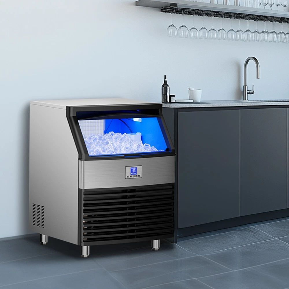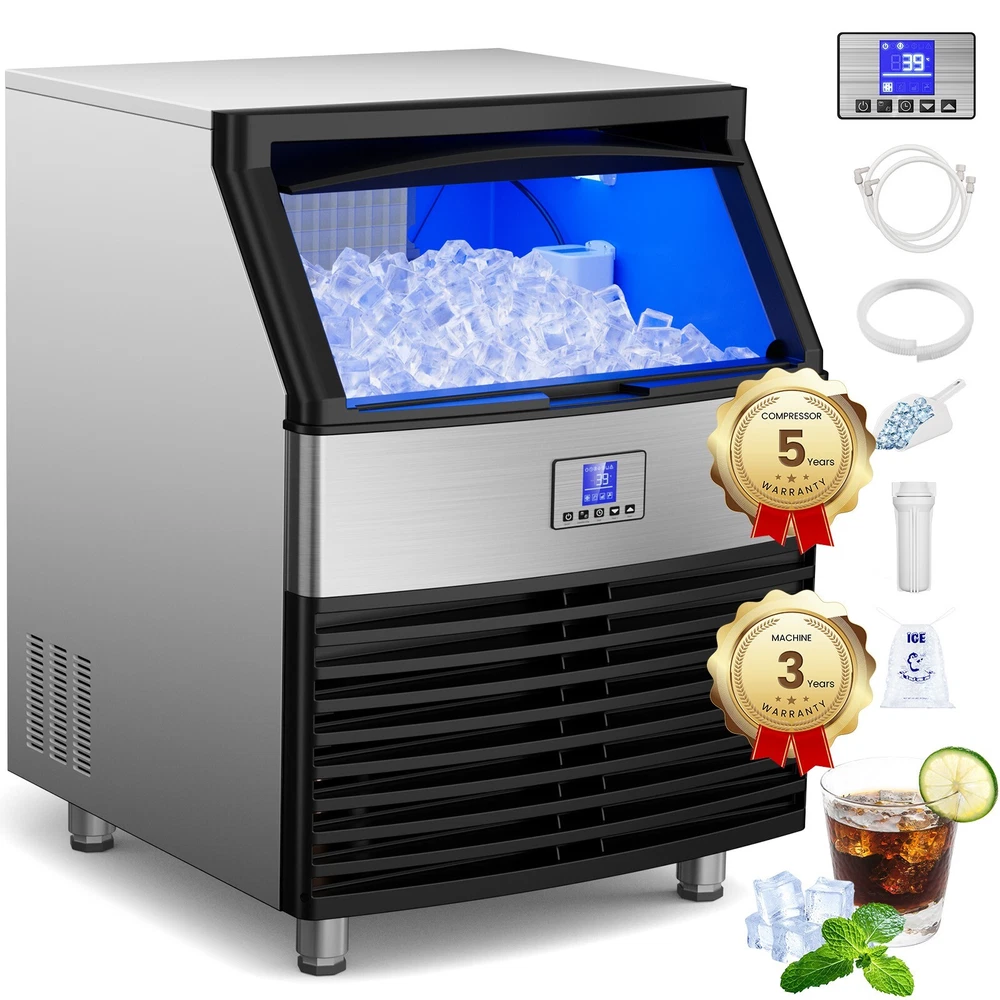 Description High-Performance Ice Production: With a capacity of 450 lbs per day, this two commercial ice maker efficiently meets daily ice needs. Each cycle produces 120 clear ice cubes in just 8-15 minutes, supported by a 50/110 lbs storage bin. The powerful compressor ensures maximum efficiency for continuous ice production. Extended Ice Preservation: Constructed with a thicker layer of polyethylene insulation, this stainless steel ice maker maintains ice freshness for up to 8 hours by blocking external heat, preventing ice from melting and keeping it frozen longer. Multi-Function Control Panel: The control panel displays ambient temperature to ensure optimal ice-making efficiency. It includes a timer function for pre-scheduling ice production, an automatic shut-off when the bin is full, and a blue light feature to reduce odors and improve ice quality. Users can easily adjust ice thickness and monitor production in real time. Versatile, User-Friendly Design: The freestanding design includes adjustable feet to level the unit on uneven surfaces. With no tap water restrictions, it can be conveniently installed in various locations. Suitable for both freestanding and built-in use, this ice maker is perfect for busy restaurants, offices, and casual gatherings. Outstanding customer service team: Our dedicated support team is made up of experienced professionals who are well equipped to deal with any post-purchase issues or questions. They have the knowledge and expertise about commercial ice makers and can provide reliable assistance and solutions. Be sure to leave the ice maker upright for at least 24 hours before using it.