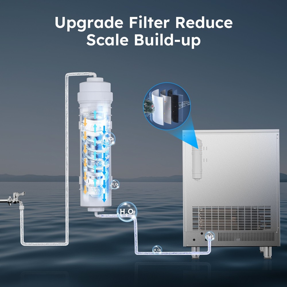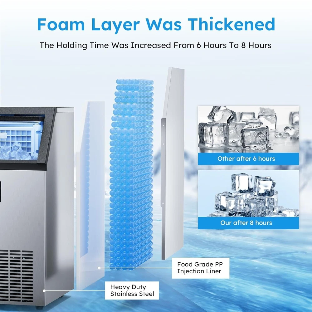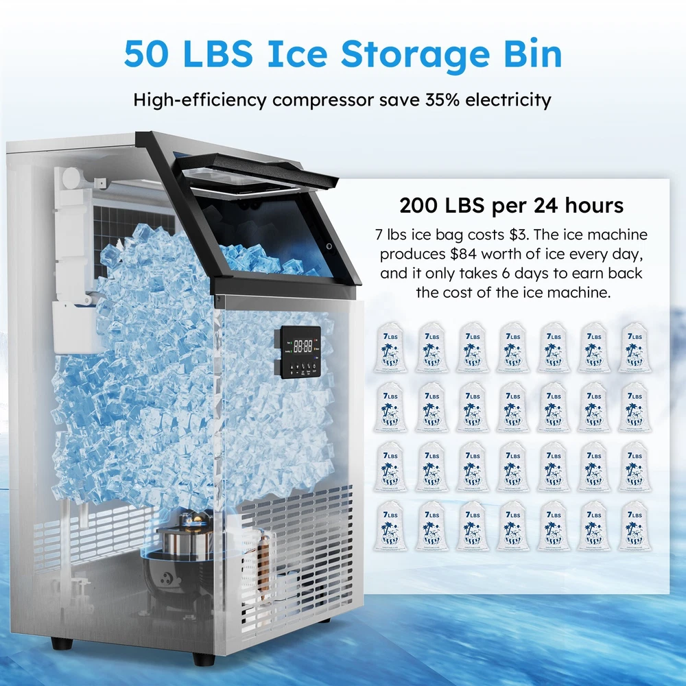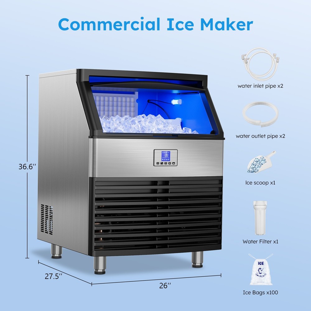 Description Commercial Ice Maker Machine 450lbs/24h; 200lbs/24h with LargeStorage Bin, Tap Water Freestanding Ice Machine with Stainless Steel Ice Scoop Ice Bucket, Ice Maker Machine for Home Bar Restaurants Bar Ice Making Capacity: 450lbs/24h; 200lbs/24h(For choice options) Voltage:115V, 60Hz Longest preset time: 24H Storage Capacity: 50lbs ; 12 0lbs Ice Number/Cycle: 55pcs clear ice cubes; 55pcs clear ice cubes Material: Stainless Steels Application: Home Bar Coffee Food Shop Ice cube size: 0.87”x0.87”x0.87”/2.2x2.2x2cm Intelligent LCD Panel: Ice Maker Commercial is equipped with an LCD panel Uniqueness: Compact Size Large Capacity Large Industrial Ice Machine Quick Ice Maker: Commercial ice machine adopts advanced freezing technology to produce 150~200lbs ice every 24 hours; Each cycle takes only 8-15 mins to generate 96 pieces of ice; Comes with 50lbs storage bin and an extra 2-liter ice storage bucket for additional storage Quiet & Energy-Saving: This commercial ice maker features an upgraded compressor that helps save 35% on electricity with quiet operation; 20% thicker insulation layer effectively insulates for up to 8 hours; Enjoy high efficiency and low noise operation Advanced User Experience: The freestanding commercial ice maker boasts a convenient control panel with intuitive buttons; Enjoy one-touch automatic cleaning, 24h reservation, and effortless adjustment of ice cube thickness by "Ice Thickness" buttons for precise cycle regulation; The stainless steel ice machine automatically stops making ice at the set temperature and time to prevent over-freezing or melting; Additionally, the self-cleaning function efficiently eliminates interior dirt buildup, ensuring that you always receive clean and fresh ice cubes Promotes Clean Lifestyle: Troubled with dirt accumulation on the inside of the under counter ice machine? Ice maker commercial solves this problem with one-touch self-cleaning function, water filter in the inlet pipe, and a food-grade PP injection liner interior that creates a safe and clean ice-making environment Excellent Service: Do not hesitate with any inquiries about the ice maker machine; Our outstanding support team, knowledgeable about commercial ice machines, is here to provide reliable assistance On Feb 18, 2025 at 03:29:54 PST, seller added the following information: