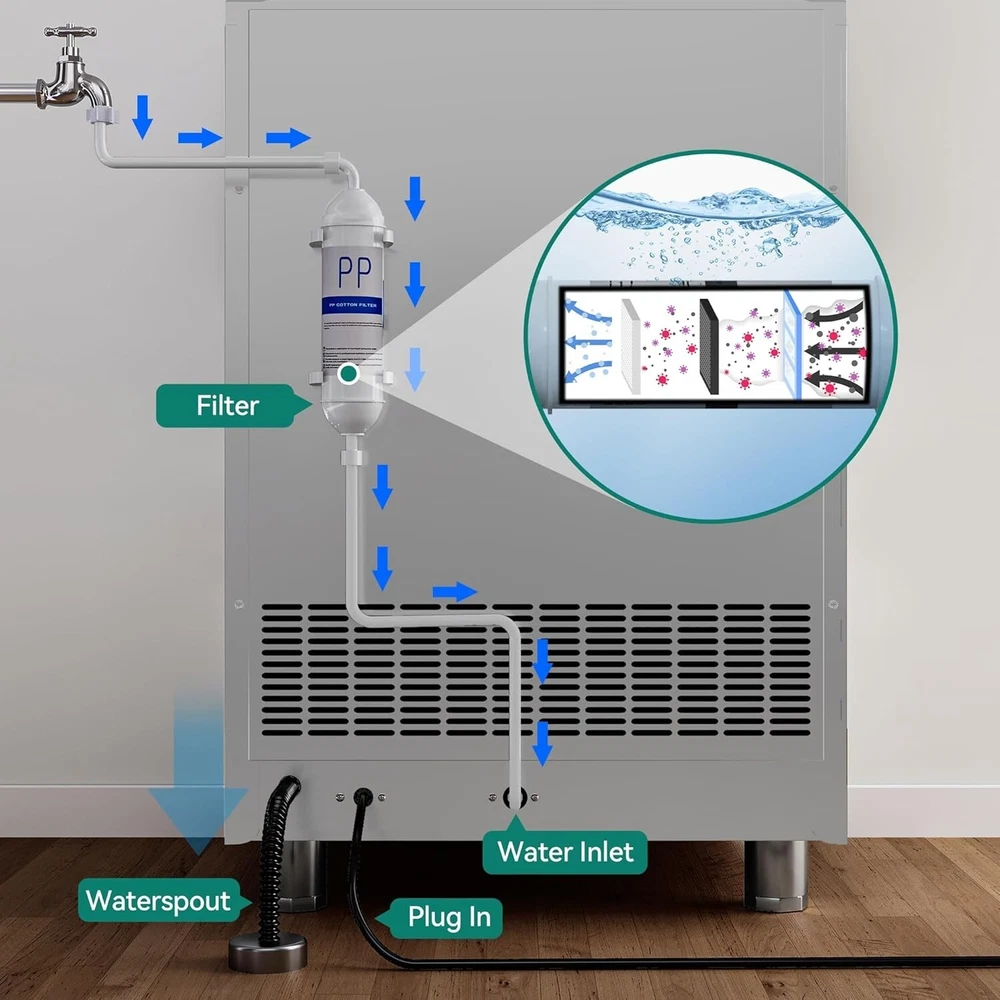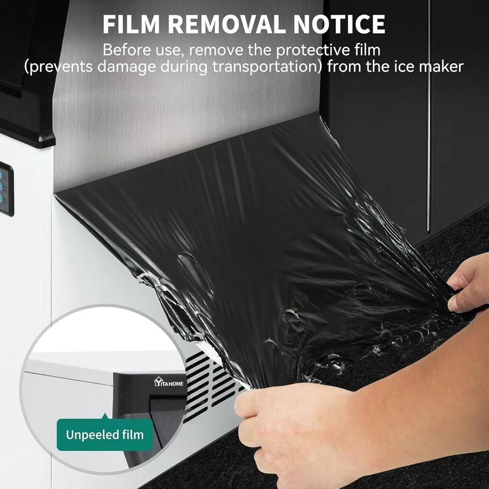 Description Upgraded Commercial Ice Maker Machine 300LBS/24H 350LBS/24H 450LBS/24H with 120lbs Storage Bin, Stainless Steel Ice Scoop, Blue Light, Freestanding Ice Machine for Home, Restaurants, Bars Ice Making Capacity: 300lbs/24h; 350lbs/24h; 450lbs/24h (For choice options) Voltage:115V, 60Hz Longest preset time: 24H Storage Capacity: 100lbs ; Ice Number/Cycle: 126pcs clear ice cubes Material: Stainless Steels Application: Home Bar Coffee Food Shop Size: 28"D x 26"W x 37"H Ice cube size: 0.87”x0.87”x0.87”/2.2x2.2x2cm Intelligent LCD Panel: Ice Maker Commercial is equipped with an LCD panel Uniqueness: Compact Size Large Capacity Large Industrial Ice Machine 300~450lbs/24h High Efficiency : Never run out of ice again with the commercial freestanding ice maker; It can produce up to 300lbs/350lbs/450lbs of ice in 24 hours, store up to 100lbs of ice and make 126 clear and hard ice cubes every 8-15 minute cycle; Say goodbye to trips to the store and always have fresh ice on hand. Ice cubes maded by this light ice maker is 0.87”x0.87”x0.79”/2.2x2.2x2cm, which is larger. And the thickness of the ice cube can be adjusted by changing ice making time Quality Certifications: Our ice makers under counter passed the ETL certification with its heavy duty stainless steel shell surface, cyclopentane foaming layer, food-grade pp liner, high quality compressor, copper tube, water filter and powerful fans, ensuring a continuous supply of healthy ice for you and your customers. The premium water filter can turn tap water into pure water, making ice clear. Food-grade PP injection liner interior grants a safe and hygienic ice-making environment Electricity Saving and Quiet: The highly efficient CFC-free upgraded compressor allows the the commercial ice machine to save up to 35% on electricity, quickly driving up the freezing system and providing you with a constant supply of freshest ice at amazingly high efficiencies. In addition, it operates quietly, providing you with a comfortable environment. The ice maker is perfect for keeping drinks at the ideal temperature for offices, homes, restaurants, bars, hotels, parties and hosting EXTENDED COOLING TIME: The ice maker machine commercial is equipped with a 20% thicker cyclopentane insulation layer, delivering excellent insulation performance by blocking external heat. The insulation time is extended from 6 hours to 8 hours, effectively preventing ice cubes from melting. Built in Blue Light, this ice making machine improves the maintenance time of ice, slowing down the speed of ice melting. Designed with flip cover, it is easy to facilitate ice fetching with given ice scoop ADVANCED INTELLIGENT EXPERIENCE: Compared with ordinary ice maker machines, operations can be solved in this smart LCD control panel, adjusting the ice thickness, one key cleaning, 24-hour reservation, defrosting, reminders and other functions can be realized with one poke, simple operation while bringing the upgrade of appearance and advanced intelligent feeling of use. With reminders functions, you can easily know about ice full or water shortage EXPERIENCED SUPPORT TEAM: Before first using, please keep it upright for 24h and read the instruction manual. With Malfunction reminders and comprehensive instruction manual, small problems can be easily solved. And our dedicated support team consists of experienced professionals who are well-equipped to handle any post-purchase issues or questions. They have the knowledge and expertise about commercial ice machines and can provide reliable assistance and solutions
