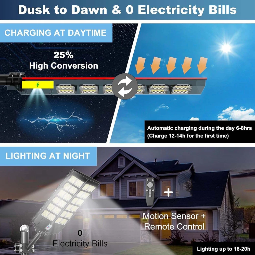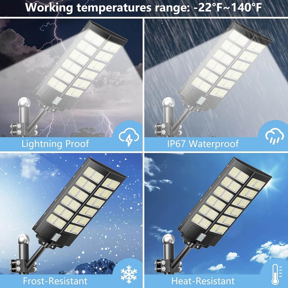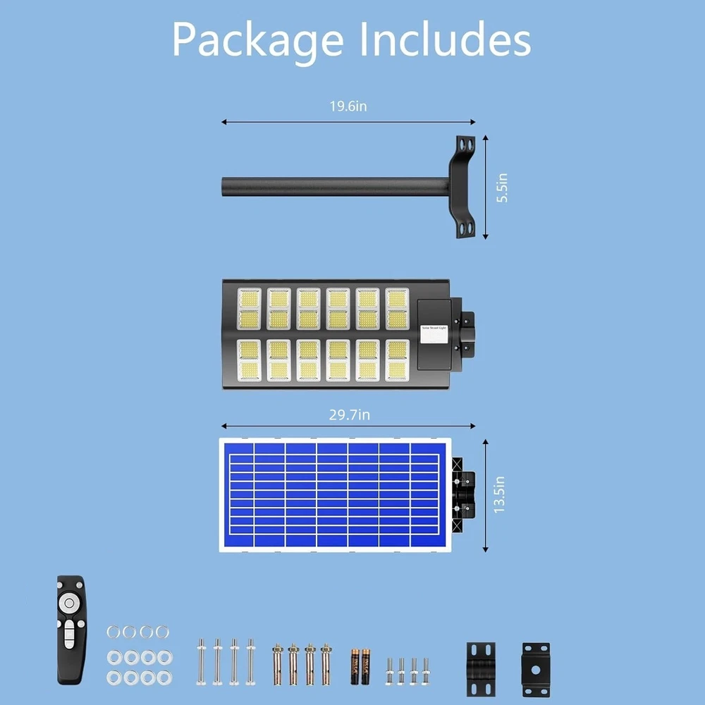 【Exceptional Efficiency & Illumination】This solar street light features a 25%+ light-to-electricity conversion rate, providing impressive efficiency. With a charging time of 6-8 hours, it delivers bright illumination for 16-20 hours, ensuring long-lasting brightness throughout the night. 【Powerful Illumination & Wide Coverage】Benefit from the superior brightness of 960pcs high brightness 5730LED beads. The wide angle design offers a 240° coverage, enhancing visibility and creating visually stunning outdoor environments. 【Robust and Weatherproof Design】With an IP67 waterproof rating, this solar street light is designed to withstand various weather conditions. Its durable, heavy-duty construction ensures long-term usage and reliable performance. 【Intelligent & Motion-Sensing Operation】Enjoy hassle-free operation with automatic functionality. The solar street light turns on at dusk and off at dawn, while its human radar sensor adjusts brightness levels intelligently. It shines at 100% full brightness when people are close and conserves energy at 30% brightness when people leave. 【Efficient Solar Panel & Reliable Battery】The 6V/30W polycrystalline solar panel efficiently harnesses solar energy, providing consistent power to the street light. With a large capacity battery of 35000mah, reliable performance is ensured throughout the night. 【Easy Installation & Peace of Mind】Mount the solar street light effortlessly on walls or tiles, or opt for pole installation (pole not included). The package includes all necessary installation hardware tools. Additionally, enjoy peace of mind with a 1-year warranty and exceptional after-sales service. Brand:‎PFCTART Color:Black Style:Modern Light fixture form:Wall Room Type:Outdoor Product Dimensions:34*8*75cm Specific Uses For Product:‎Yard Indoor/Outdoor Usage:‎Outdoor Power Source:‎Solar Powered Special Feature:‎Waterproof, Motion Sensor, Water Resistant Control Method:Remote Light Source Type:‎LED Finish Type:outdoor light Number of Light Sources:1 Voltage:‎6 Volts Shape:‎Trapezoid Lighting Method:Dusk to dawn, motion sensing Item Weight:‎4.2KG Number of Items:‎1 Wattage:‎3000 watts Controller Type:Remote Control Unit Count:1.0 Count Brightness:120000 Lumen Mounting Type:Wall Mount Shade Color:Black Fixture Type:‎Non Removable Assembly Required:‎Yes Manufacturer:PFCTART Country of Origin:‎China Finish types:outdoor light Maximum Compatible Wattage:3000 Watts Special Features:‎Waterproof, Motion Sensor, Water Resistant Batteries Included?:Yes Wattage:‎3000 Watts Color Temperature:7000 Kelvin Average Life:‎50000 Hours Included Components:‎1 * Mounting bracket, 1 * Set of mounting accessories, 1* Remote control(Including batteries), Manual, 1* Solar powered street light
