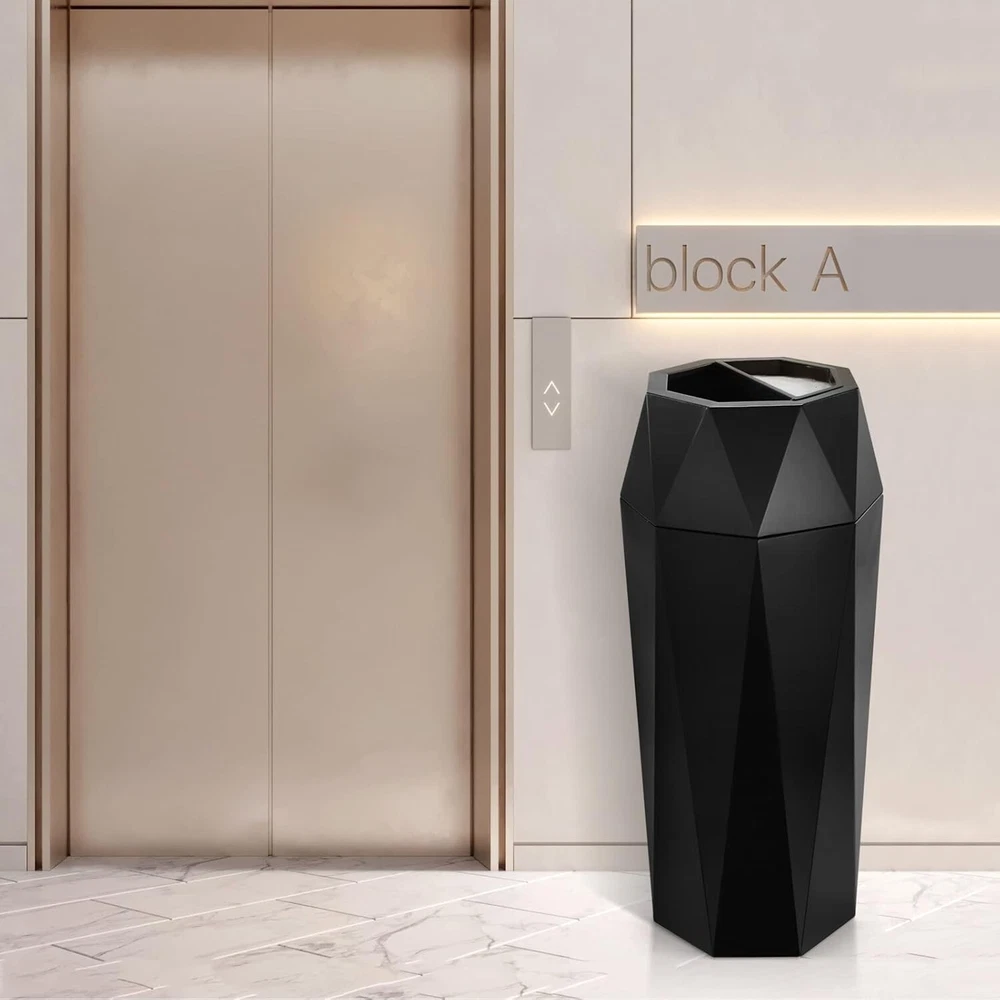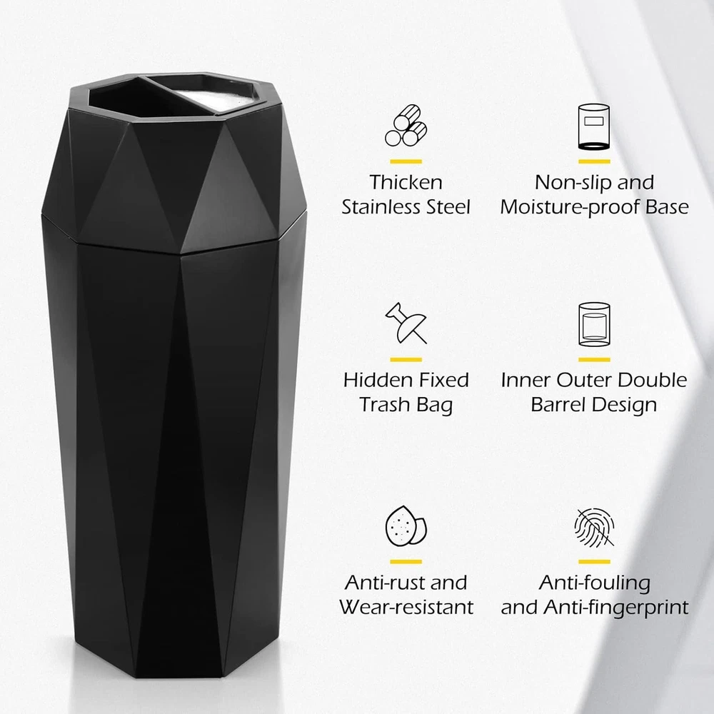 Commercial Trash Can Outdoor Garbage Can with Lid Indoor Large Trash Bin Stainless Steel Industrial Waste Container Black Stylish Trash Can Commercial- European diamond shape design commercial trash can, the angular open top design and the bottom surface of the garbage can with lid is glazed non-slip and moisture-proof treatment. Widely used in high-end shopping malls, hotels or office buildings. 13 Gallons Stainless Steel Trash Can- The outdoor trash can with lid is 13 gallons, high inches and diameter is inches. The 13-gallon trash bags in the supermarket can be perfectly used for our big trash bin. The large-capacity commercial waste container can definitely satisfy your daily needs. Garbage Bag Hidden and Fixed- The garbage bag can be fixed on the top of the inner stainless steel garbage can. It is easy and quick to replace the trash bag without lifting the inner trash can. The top cover makes the garbage bag better hidden, keeping the stainless steel trash bin with a clean and beautiful appearance. Durable and Sturdy- The industrial large garbage can is made of high-quality stainless steel, strong and durable; The thick galvanized inner barrel garbage cans have strong anti-corrosion and anti-rust capabilities. Metal trash can with lid, easy to clean. Suitable for Various Places- Covered trash can outdoor is suitable for residential or various commercial purposes. Stainless steel trash can be placed in office buildings, apartments, shops, supermarkets or hotels, which make the surrounding environment fresher and cleaner. Trash Can with Lid Commercial Trash Can with Lid; Open Top Stainless Steel Garbage Bin; Industrial Trash Bin with Ashtray.