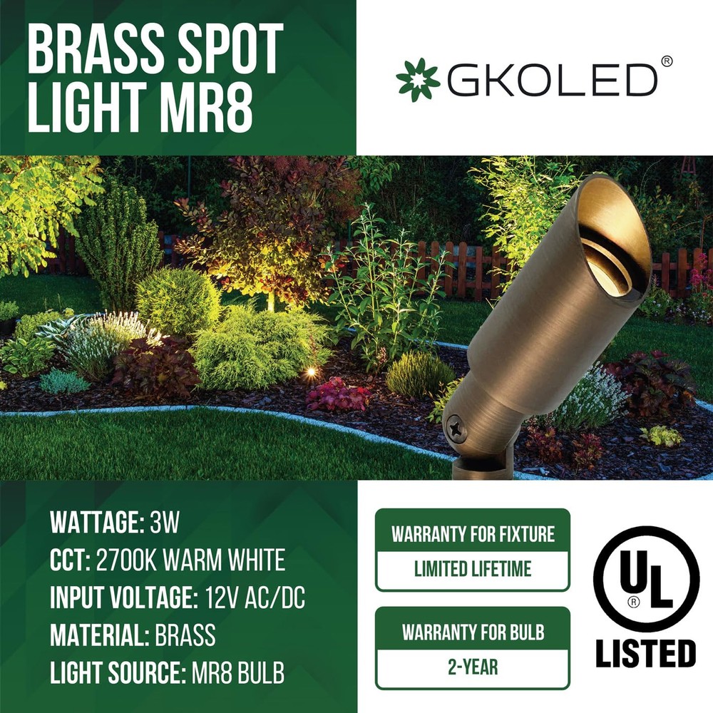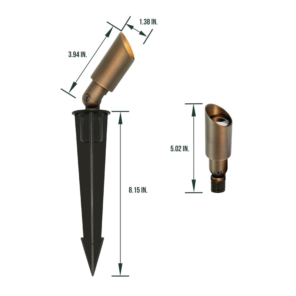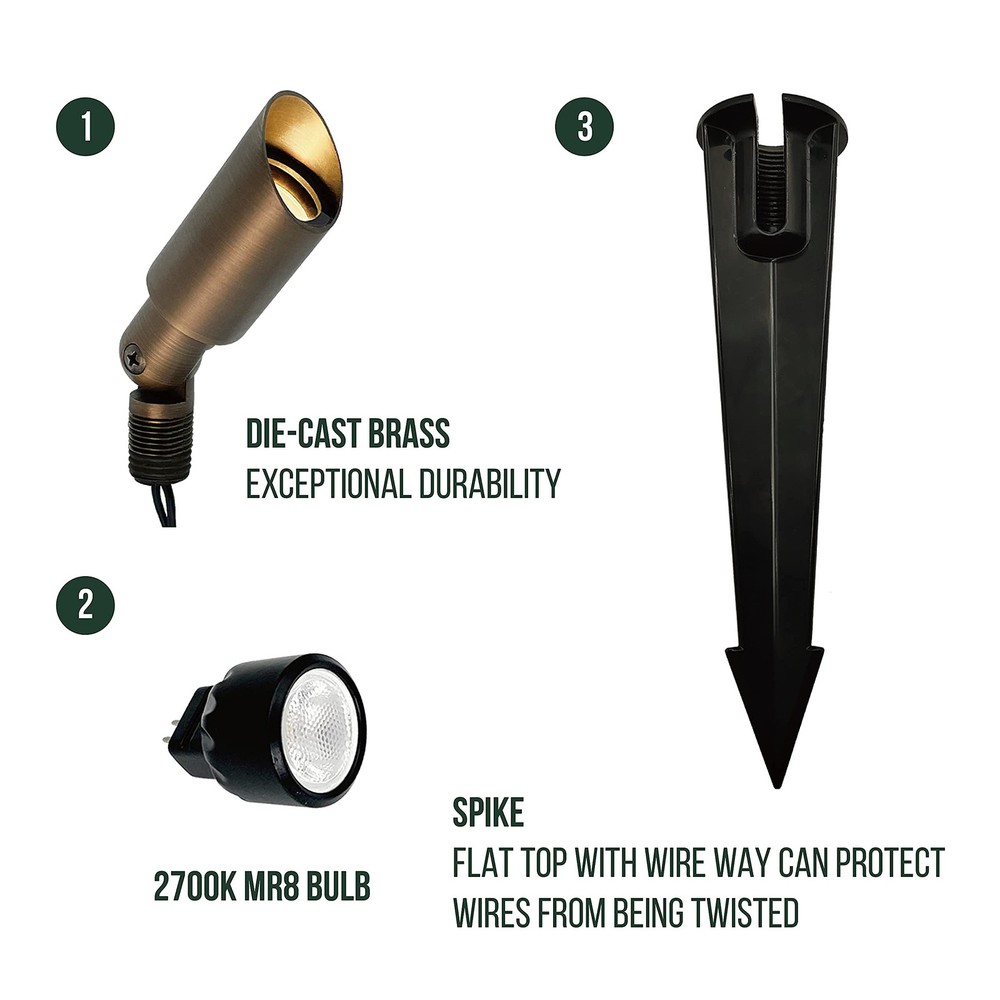 SOLID BRASS CONSTRUCTION: The complete housing is constructed of cast brass, instead of flimsy sheet brass. Exceptional durability from solid brass construction with antique brass finish, tempered flat glass lens, and high temperature silicone O-ring. Suitable for outdoor use in all weathers. MINI SIZE: Compared with ordinary size spotlights, this mini size spot light is more suitable for small-scale landscapes which don't need too much light. It blends into the environment easily and provides more precise lighting. This light makes your house exquisite and beautiful. SAFE LOW VOLTAGE LANDSCAPE LIGHTING: This light operates with safe 12V low voltage power and is compatible with most outdoor low voltage landscape lighting kits and systems. Extra low voltage transformer required for installation (NOT INCLUDED with this fixture). EASY INSTALLATION: Insert the ABS ground spike into the suitable position on ground. It also comes pre-wired with 36 inch direct burial low voltage wire cable that does not require addition piping to install. This product is covered for lifetime.The bulb is covered for 2 years from the date of original purchase.