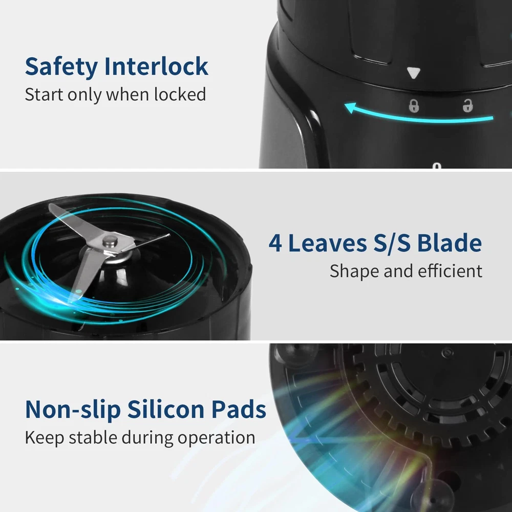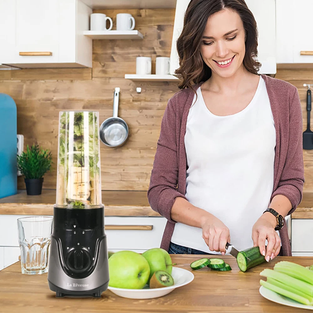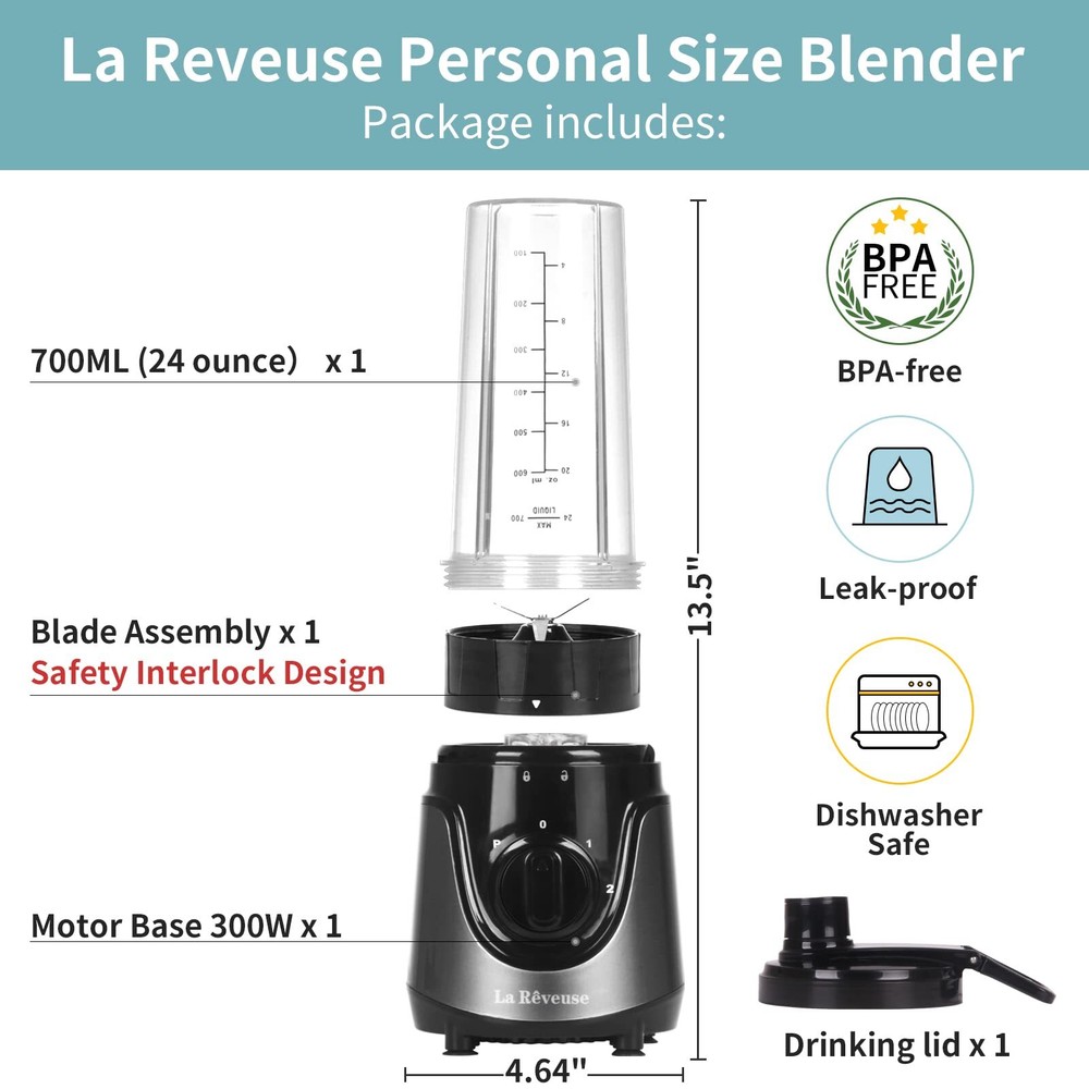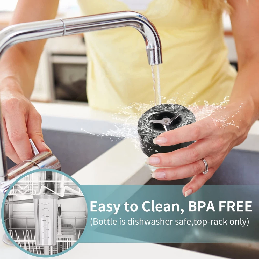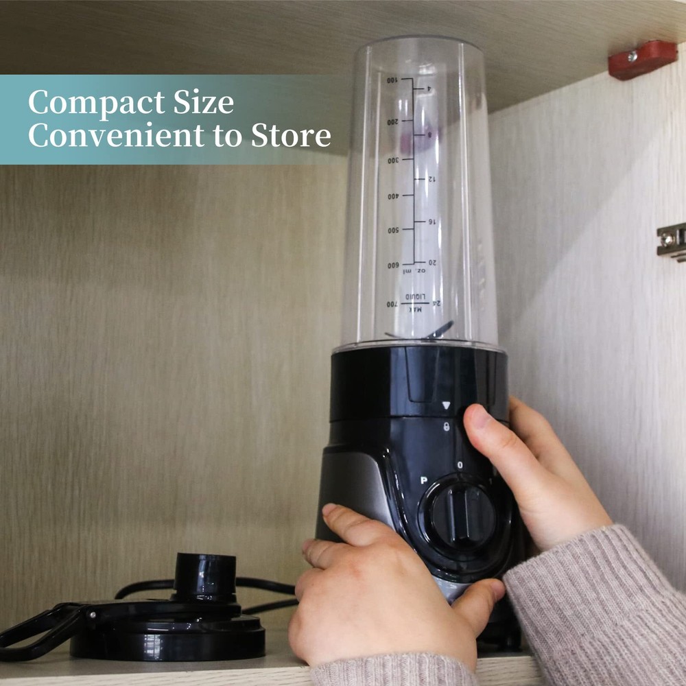 SIMPLE TO USE - Easy operation with 2 speeds and pulse function,just twist the bottle to lock and switch the knob to start TO GO CONVENIENCE - 24 oz BPA-free trave bottle with drinking lid, great for home,office,class and travel with on the go portability EFFICIENT - 4 Leaves high speed stainless steel blade,strong enough to crush vegetables and fruit easily. A small blender great for making smoothies,shakes,baby formula and morning protein drinks VERSATILE - 300 Watts single serving personal blender can be used for blending, mixing, pureeing, grinding.Great choice for holiday season for friends, let your friends enjoy delicious shakes, smoothies, juices, even make baby food with ease COMPACT DESIGN - Sleek design easy to collect,which fits nicely in the corner of your counter.Great size for office use. The cup is dishwasher safe