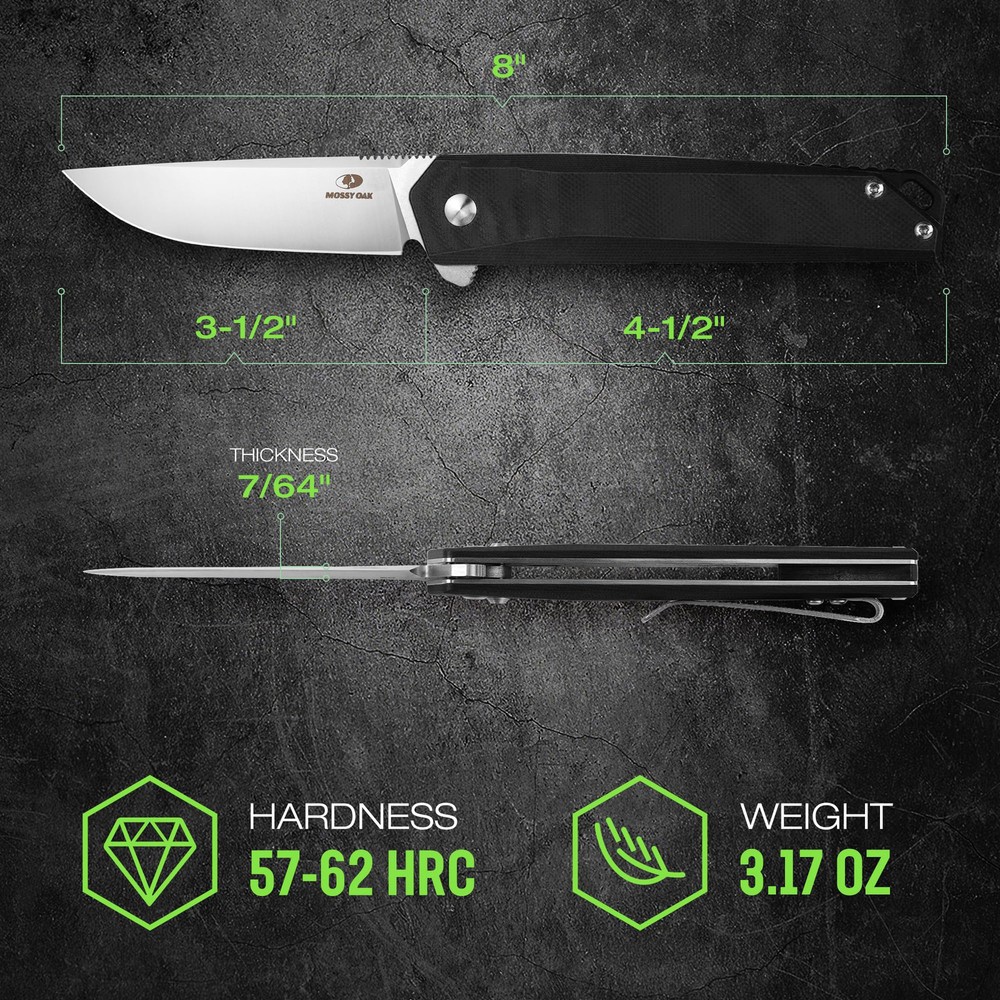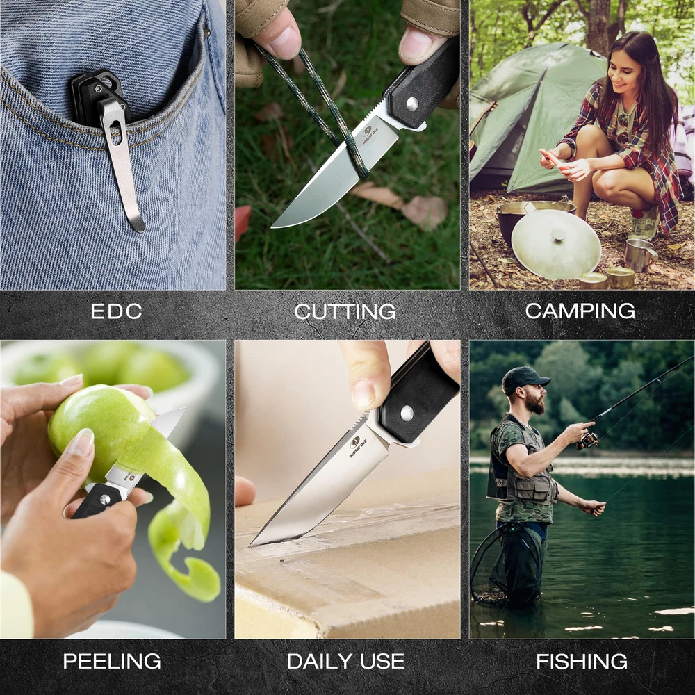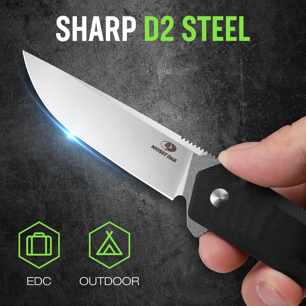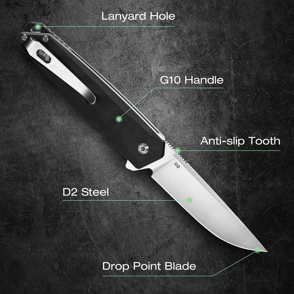 Note: Not an axis-lock knife D2 Steel Pocket Knife: The folding knife is made of premium D2 steel for exceptional durability and long-lasting sharpness The drop point blade is CNC-machined for an even edge and precise cutting angle Dimensions: Drop Point Blade length: 3-1/2 inch; Blade thickness: 7/64 inch; handle length: 4-1/2 inch; overall length: 8 inch; folded length: 4-1/2 inch; weight: 3.17 oz Stylish G10 Handle with Belt Clip: The G10 handle provides a comfortable grip and balance, with ergonomic handle grooves that are non-slip for use The handle comes with a belt clip for easy daily storage and use The end of the knife has a rope hole for easy carrying User-Friendly Design: The lock mechanism is designed for effortless closing, while the anti-slip groove on the back of the blade provides a secure and comfortable grip Multifunctional Knife: A versatile folding knife that can be used for outdoor camping, hiking, kitchen tasks, cutting fruits, and daily housework It makes an excellent gift for fathers, husbands, and friends