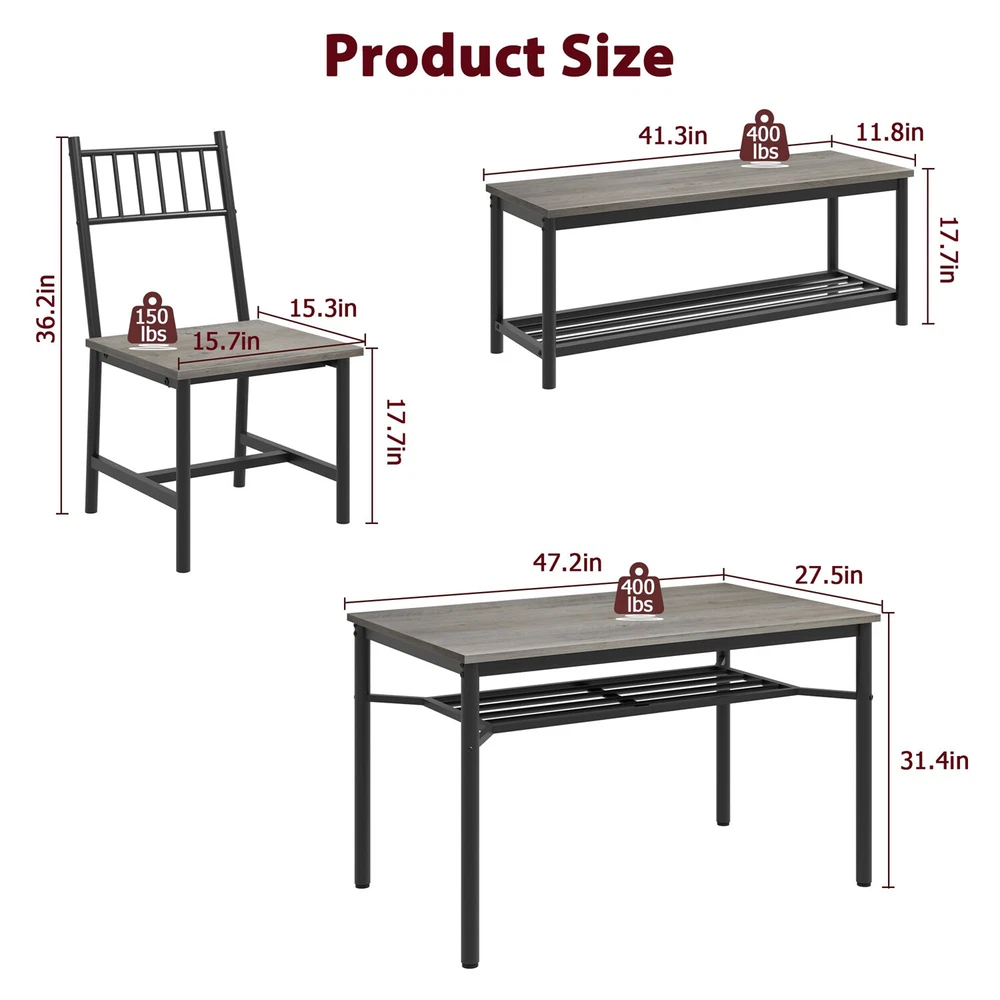 COZY STRONG BENCH AND CHAIRS: This farmhouse kitchen table chair sets with bench made of premium MDF board and solid steel, which features a sturdy frame for a long lifespan. The use of metal pipes with a larger diameter makes the kitchen bench and chairs more stable and comfortable than other products. The Upgraded Dining Bench and Dining Chairs seats with thick MDF board, keep you comfortable all dining time. DURABLE & STURDY FRAME WITH STORAGE RACK: This 47.2” large dining table set with bench, offers a longer service life and more excellent stability. With the premium MDF Board top, the overall durability would be significantly increased. The table and bench of the large built-in storage rack are perfect for holding wine, snacks, food trays, magazines, and much more. SPACE-SAVING DESIGN: 2 dining chairs and a bench can be hidden under the kitchen table to save space and create a tidy atmosphere. It is an excellent solution for small spaces, such as condos, kitchens, dining rooms, studios, or apartments. EASY TO ASSEMBLE AND MAINTAIN: All the assembly hardware and tools come with this kitchen table set. With illustrated instructions, this rustic kitchen table and chair set can be assembled within 45 min without effort. The water-resistant top is bright and clean with just a light wipe of water, making it convenient and easy to clean. It is a perfect choice for your home. Dimensions: Table 47.2” L x 27.5” W x 31.4” H / Chair 15.7” L x 15.3” W x 36.2” H / Bench 41.3” L x 11.8” W x 17.7” H BEST AFTER-SALES SERVICE: Thank you for your support and trust in our luxurious dining table set. We have a professional after-sales customer service team. If your kitchen table set arrives damaged or missing part, please feel free to contact us. Our customer support team will address your concerns within 24 hours. Get and enjoy this functional kitchen table set today! Why Are Our Dining Table Set with 2 Cozy Chairs and Bench Worth Choosing? 1. High quality material that is authentic to the touch and sturdy enough to last for many years. Made of MDF board offers incredible structural strength and durability. 2. A beautiful vintage kitchen table set for the living room, dining room, kitchen, that will fit perfectly into a variety of décor styles. 3. Sturdy and Durable Frame: Constructed of high-grade MDF board and thickened steel frame and pipe wall, this small kitchen table with bench is long-lasting and you can count on it to be a favorite for years to come. The seat panels of the chairs and bench can load over 300 lbs. Large Sturdy Tabletop 2 Cozy Chairs Sturdy Frame with Large Storage Rack Specifications Color: Rustic Gray Material: Metal/MDF Board Dimensions: Table 47.2” L x 27.5” W x 31.4” H / Chair 15.7” L x 15.3” W x 36.2” H / Bench 41.3” L x 11.8” W x 17.7” H Max. Load Capacity: Table 150 LBS / Chair 300 LBS / Bench 300 LBS Package includes: 1 x Dining Table /2 x Chairs/1 x Bench /1 x User's manual Payment Delivery details Terms of sales About us Contact us Payment We accept payment either via PayPal or any of the following credit cards; Visa, MasterCard, Discover, and American Express. Wishing you a happy life! Delivery details We will provide you with the tracking number on the same day or the next day, and transport your package through UPS, DHL, FedEx and other courier methods. If you have any questions, please feel free to contact me and I will do my best to help you solve the problem. Wishing you a happy life! Terms of sales We offer a one month free return and exchange service, and you don't have to bear any losses. We will provide multiple solutions for you to choose from. If you have any questions, please feel free to contact me and I will do my best to help you solve them. We offer a two-year warranty period. If you have any quality issues with the product you purchased within two years, please feel free to contact me. I will provide you with a free replacement service. If you have any questions, please feel free to contact me. I will do my best to help you solve the problem. Wishing you a happy life! About us We are committed to becoming the best eBay seller, with high-quality suppliers, providing the most sincere service, including pre-sales and after-sales service, to give you a satisfactory shopping experience. If you have any questions, please feel free to contact me, and I will do my best to help you solve the problem. Wishing you a happy life! Contact us If you encounter any problems, please contact me by email at the first time, I will provide you with a solution as fast as possible so that I can give you a satisfactory shopping experience, wish you a happy life! Brand GRVEE Number of Items in Set 4 Set Includes Chairs, Dining Table, Stools Seating Capacity 4 Room Dining Room Item dimensions L x W x H 47.2 x 27.5 x 31.4 inches Item Depth 47.2 inches Item Weight 78.5 Pounds