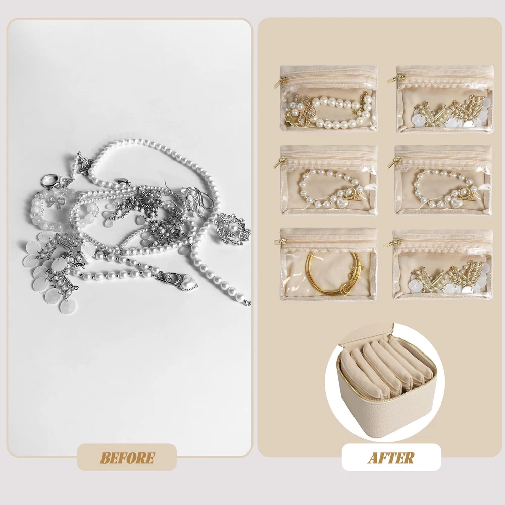 Travel Jewelry Case, Small Travel Jewelry Box with 6 Velvet Jewelry Bag Mini Pouch, Portable Travel Jewelry Organizer for Rings Earrings Necklaces, Beauty Gifts for Women Girls (Beige) - Buy Now with Fast Shipping! Travel Jewelry Case, Small Travel Jewelry Box with 6 Velvet Jewelry Bag Mini Pouch, Portable Travel Jewelry Organizer for Rings Earrings Necklaces, Beauty Gifts for Women Girls (Beige) Product Details Color: Beige Brand: WATANIYA HOME Material: Leather Style: Modern Special Feature: Portable Product Dimensions: 5.51"D x 5.51"W x 3.39"H Target Audience: Women Shape: Square Finish Type: Unfinished Inner Material: Faux Leather Color: Beige Brand: WATANIYA HOME Material: Leather Style: Modern Special Feature: Portable Product Dimensions: 5.51"D x 5.51"W x 3.39"H Target Audience: Women Shape: Square Finish Type: Unfinished Inner Material: Faux Leather Number of Compartments: 8 Jewelry Storage Type: Jewelry Case Manufacturer: Shenzhen lechen times Culture Communication Co., L Occasion: Travel Mounting Type: Table Top Part Number: JB01 Item Weight: 11.3 ounces Country of Origin: China Item model number: JB01 Finish: Unfinished Special Features: Portable Included Components: box Batteries Included?: No Batteries Required?: No Date First Available: May 29, 2024 Key Features ✅ Quality Materials: This travel jewelry case set includes a size 5.1x 5.1x 3.3 inches supple PU leather jewelry box, 6 pcs velvet zipper jewelry bags, removable zipper head ✅ 6 Velvet Zipper Pouches: These mini pouches are well made and handy for packing all the jewelry you needed in travel. The soft touch velvet ensures that your jewelry won't get scratched and the clear front makes it easy to see what is inside ✅ Safe & Organized Storage: The travel jewelry organizer hold several individual zippered jewelry bags to keep your jewelry organized. Much more secure as zipper keeps things from falling out.It's also nice to keep necklaces in a different pouch to prevent tangling ✅ Multiple Use Scenarios: Do you like to plan your outfit and jewelry for each day in advance of your trip? You'll love the mini pouches in this jewelry box that neatly hold a lot of jewelry! The box itself could be used as a jewelry box at home. During the business trip, you just take a few pouches in your toiletry bag or suitcase for the plane ✅ Beauty Gift for Her: The jewelry organizer will be a decent gift for giving her on any occasion. Such as Christmas gift, Mother's Day gifts, Valentine's Day gifts, 6, 8 year old girl birthday gifts, anniversary gifts ,bridesmaids gifts for mother, lover, best friends, sister, wife Product Description