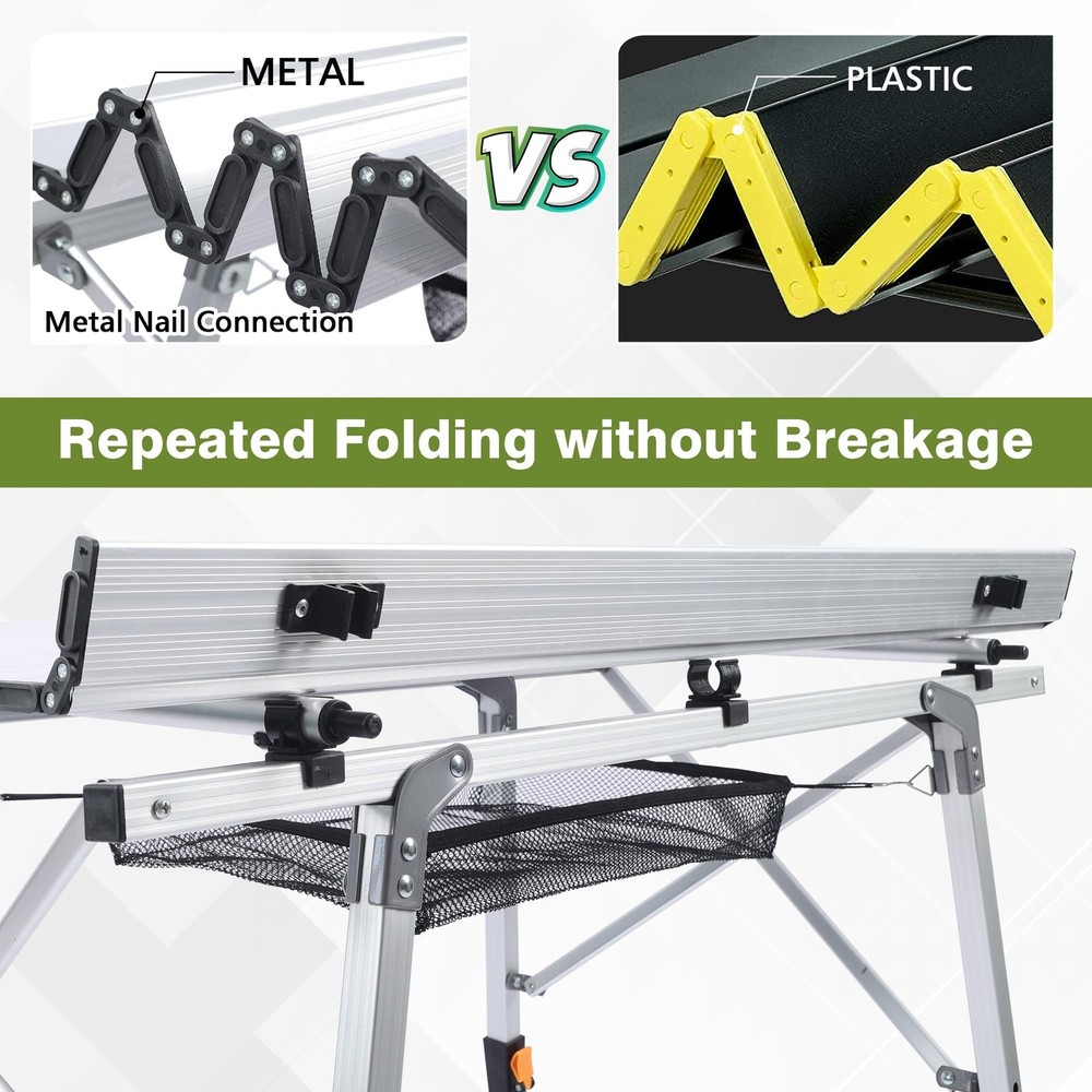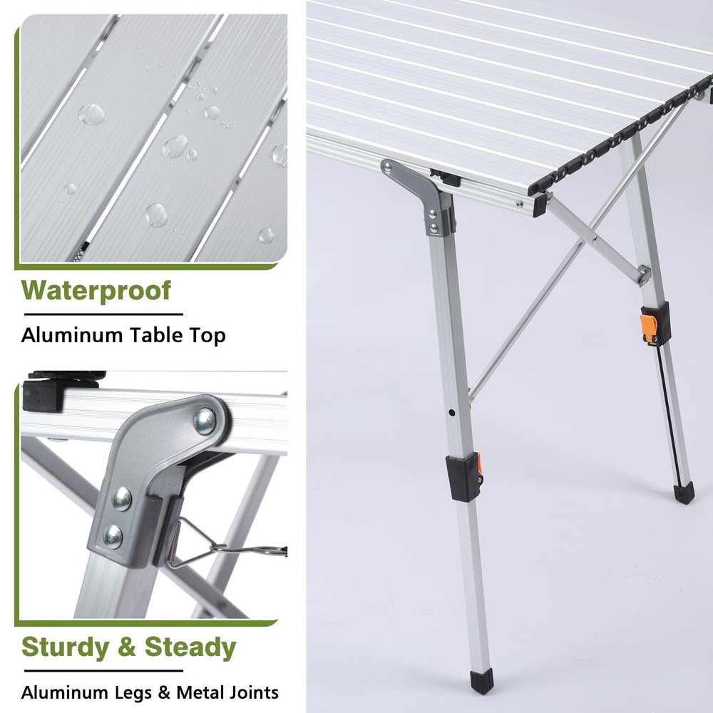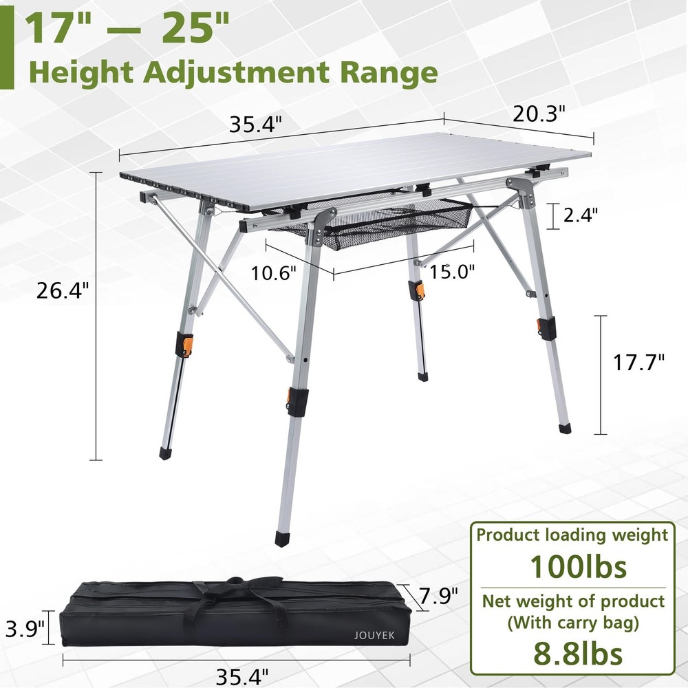 Folding Outdoor Camping Table with Adjustable Legs, Lightweight Aluminum Roll Up Camp Table with Carrying Bag, Mesh Storage Organizer, for Cooking, Picnic, Beach, Backyards, BBQ, Party Product Details Brand: JOUYEK Product Dimensions: 35.4"D x 20.3"W x 26.4"H Maximum Weight Recommendation: 1E+2 Pounds Color: White Product Care Instructions: Wipe with Dry Cloth Brand Name: JOUYEK Model Name: JO-FCT-9053 Included Components: Assembly Guide, Mesh storage bag, Portable bag, Table Leg, Tabletop Model Number: JO-FCT-9053 Manufacturer: JOUYEK UPC: 721545979971 Item Type Name: Folding Camping Table Item Height: 26.4 inches Frame Material Type: Aluminum Top Material Type: Aluminum Product Care Instructions: Wipe with Dry Cloth Base: Metal Is Stain Resistant: No Material Type: Aluminum Handle Material: Aluminum Seating Capacity: 4 Base Type: Leg Is Foldable: Yes Number of Items: 1 Frame Joint Type: Hinge Unextended Seating Capacity: 4 Tilting: No Is Customizable?: No Is Electric: No Is the item resizable?: Yes Item Dimensions D x W x H: 35.4"D x 20.3"W x 26.4"H Item Weight: 8.8 Pounds Tabletop Thickness: 0.1 Inches Extended Length: 35.4 Inches Item Width: 20.3 Inches Ground To Item Distance: 17.7 Inches Base To Top Distance: 26.4 Inches Maximum Weight Recommendation: 1E+2 Pounds Recommended Uses For Product: Leisure, Dining Indoor Outdoor Usage: Outdoor Specific Uses For Product: camping, outdoor cookouts, picnic, beach, backyards, BBQ, party Tools Recommended For Assembly: Screw Driver Color: White Shape: Oblong Table Design: Dining Table Furniture Finish: Aluminum Leg Style: Straight Leg Top Color: silver Handle Finish Type: Powder Coated Base Color: White Handle Color: White INDIVIDUAL LEG ADJUSTABLE HEIGHTThe folding table designed with individual telescoping aluminum legs for different heights starting at 17.7" to 27.5" to fit uneven ground. STURDY & STABLEJOUYEK aluminium table tops feature special heavy-duty metal screws that connect each panel by means of a hinge design. This is much stronger and more durable than elastic cords or plastic nail connections. The heavy-duty construction and sturdy joints make the foldable camping table can support 100 pounds of weight. LIGHTWEIGHT & PORTABLEUltra-compact aluminum camping table, made of high quality aluminium and weighs only 9lbs. This foldable table is easy to install or fold into the included carry bag, which Ideal for camping and outdoor cookouts! EXTRA STORAGE SPACEAn additional mesh table storage basket is provided underneath the tabletop for easy access to your belongings at all times. It can also be easily removed when you don't need it. SUITABLE FOR MULTI-PERSON PARTIESThe camping table spacious enough to comfortably seat four to six adults. The heat-resistant and waterproof aluminum tabletop can be sanitized with a quick scrub and rinse, so it is perfect for a picnic table for cooking and dining.