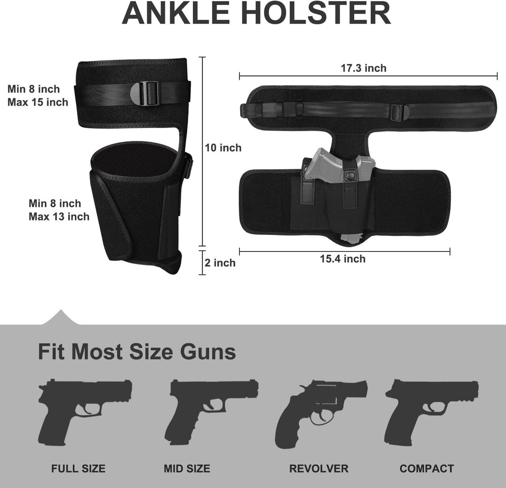 Ankle Holster Leg for Glock 43 42 36 26 19,M&P Bodyguard,Ruger LCP LC9,Sig Sauer Hand Orientation Ambidextrous Material Foam, Neoprene, Metal Style Modern Color Black Closure Type Snap EXTREMELY COMFORTABLE - We use a neoprene band that is comfortable even when worn against your skin unlike elastic bands. A foam pad behind the gun protects your ankle from pressure points. COMPATIBLE WITH A WIDE RANGE OF GUNS - Our elastic holster is compatible with a wide range of guns from micro pistols to subcompact, compact, and revolvers. Ruger LCP 380 LC9 EC9S, Sig P238 P365 P938, Kimber Micro 9, S&W M&P Shield 9mm Bodyguard 380 Special .380 Revolver, Glock 26, Glock 27, Glock 30, Glock 42, Glock 43, Taurus G2C G3C G2S PT111, Walther PPK22 PPS, Bersa Thunder .380, Springfield XDs, Beretta Nano APX PX4, SCCY CPX-II and Similar Sized.