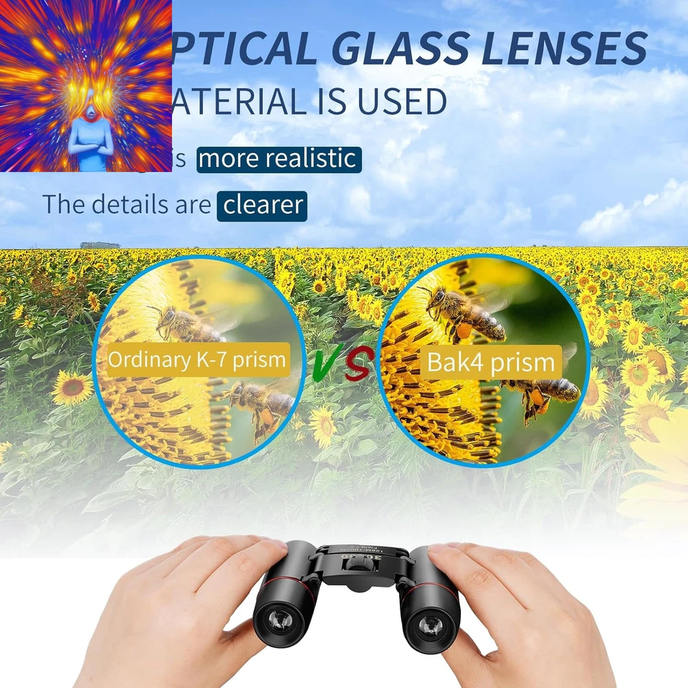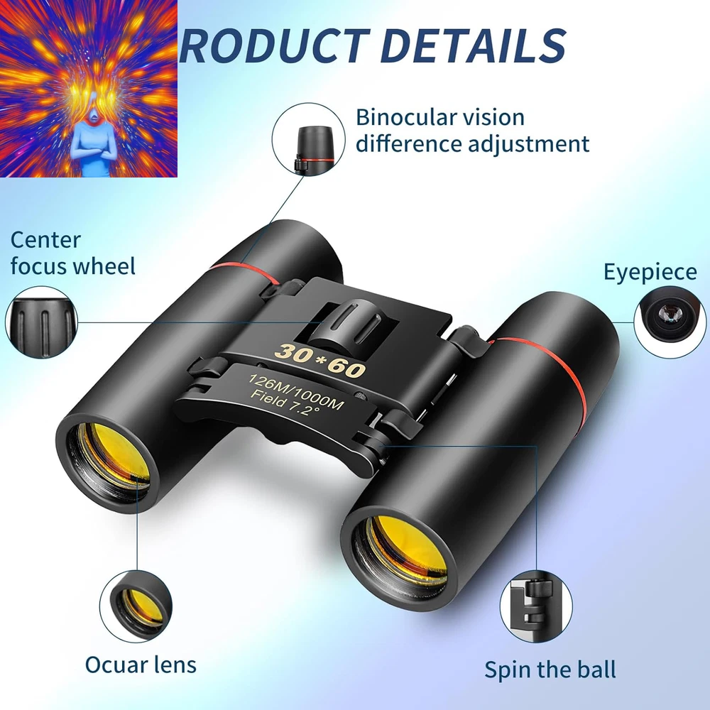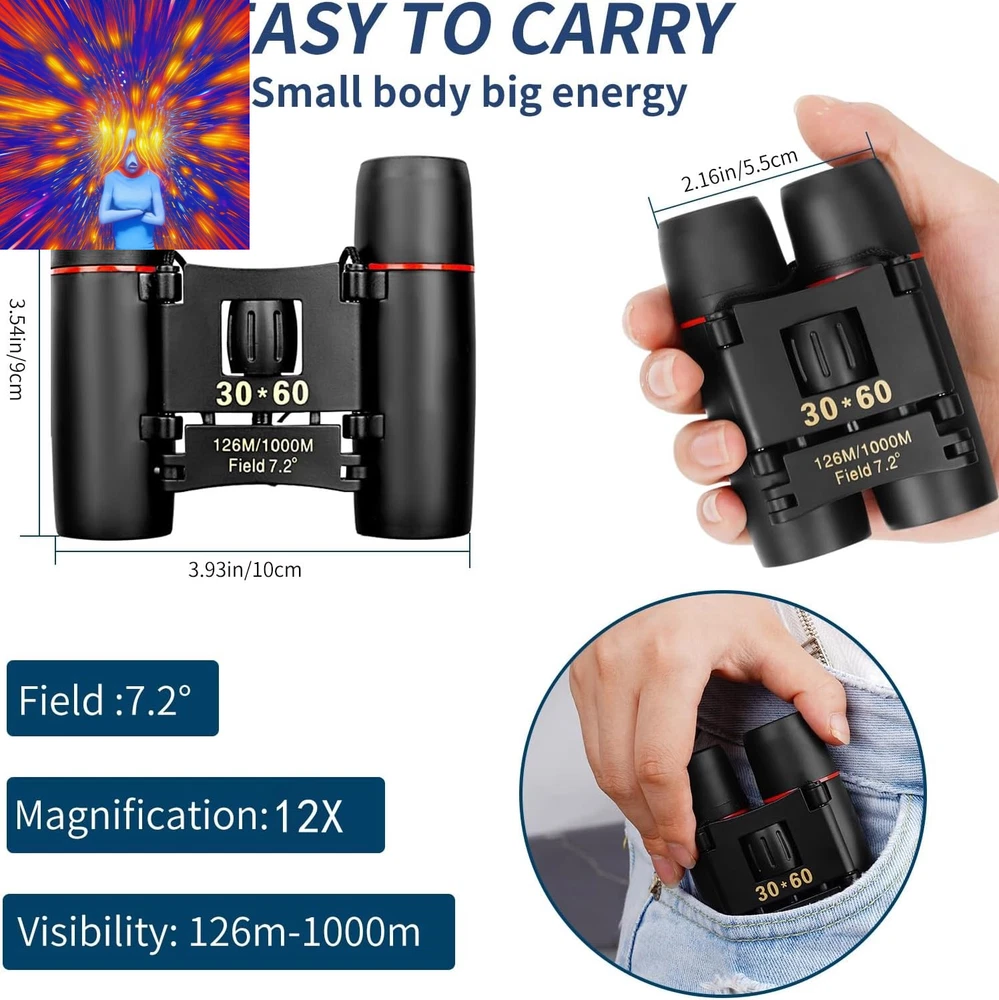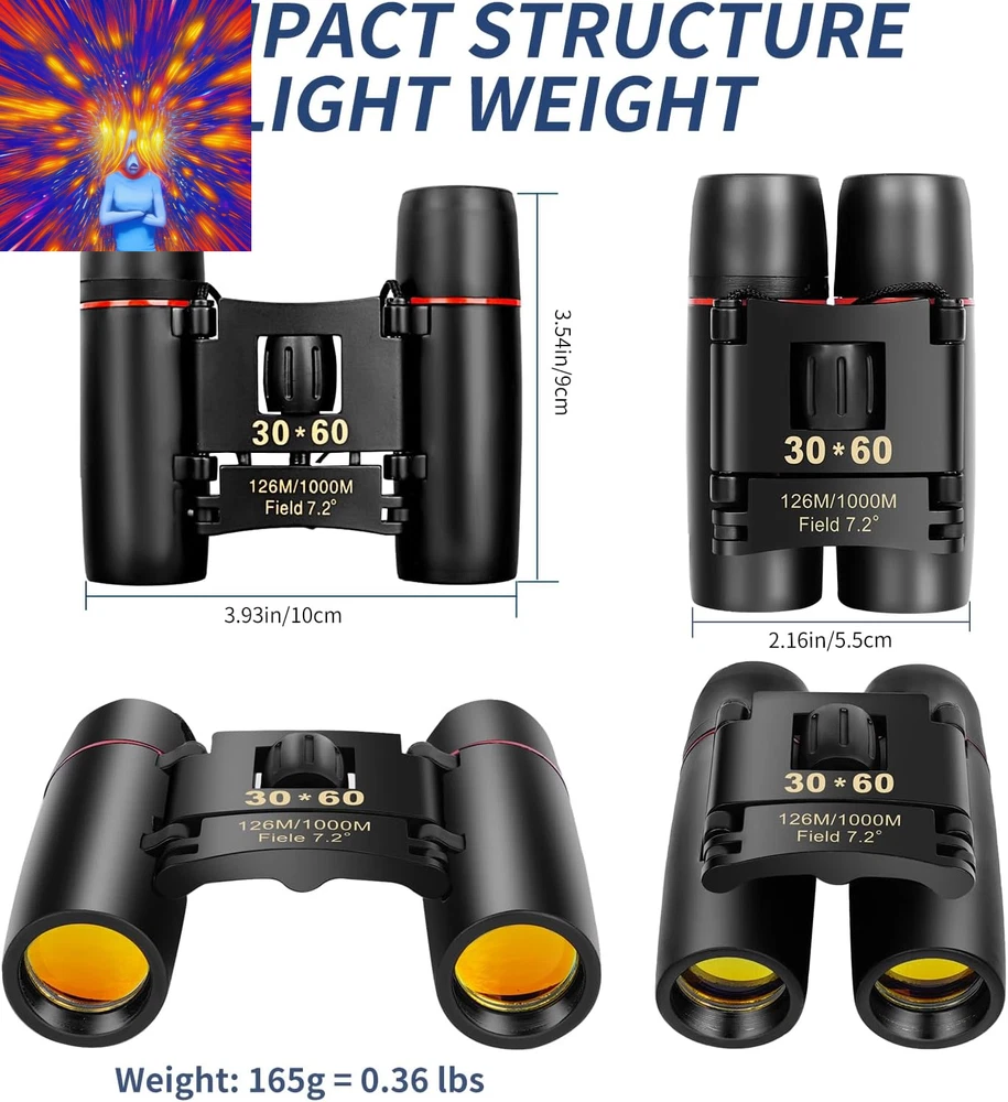Store New Arrivals Add to Favorite View Feedback Contact Compact Binoculars, HD Mini Portable Outdoor Binoculars, Pocket Lightweight Folding Binoculars for Adults and Children Bird Watching Hunting, Watching Shows, Traveling and Tourism,... Description Age Range Description Adults and children Zoom Ratio 12 multiplier_x Special Feature Fog Proof, Portable, Lightweight, Foldable, Compact Design Color Black Size Map Compact Material Type Aluminum, Plastic, Metal, Rubber Coating FMC Multilayer Broadband Green Coating Item Dimensions L x W x H 3.9"L x 2.1"W x 3.54"H Specific Uses For Product Hiking and Outdoors, Bird Watching, Concert Item Weight 5.82 Ounces Exit-Pupil Diameter 1.75 Millimeters Age Range (Description) Adults and children Prism Type Roof Prism Magnification Maximum 12 x Objective Lens Diameter 21 Millimeters Water Resistance Level Water Repellent Focus Type Center Focus 【Suitable for Adults and Children】 - Mini compact binoculars are only 5.3 ounces, breaking away from the traditional large construction. They are small enough to fit in a pocket or travel bag. The binoculars come with their own neck strap, cleaning cloth and carrying case. You can use them anywhere, anytime without being tied down. 【Wide and Clear Field of View】- Professional Ultra Wide Angle 30*60 Optical Binoculars with 12x magnification, using high quality Bak-4 prisms and optics for truer color reproduction and clearer observation images.126M/1000M large field of view provides maximum image brightness in low light and long distance conditions, allowing you to get amazingly clear details from birdwatching, wildlife, and exploring. 【Wide Application】- Compact binoculars are suitable for adults and children, bird watching, hunting, concerts, opera, theater, performances, opera houses, plays, shows, travel, hiking, camping, sporting events. The binoculars are made of high quality material and non-slip design, which ensures the pocket binoculars are durable, non-slip, shockproof and waterproof for outdoor activities. 【Sturdy and Non-Slip】- The powerful binoculars body is an aluminum alloy frame with non-slip armor made of high quality rubber, which ensures a comfortable grip and provides excellent resistance to impacts and drops. The fully sealed metal body is resistant to rain splashes (binoculars cannot be fully submerged in water), dust and debris. Perfect for outdoor activities such as bird watching, traveling, hunting and stargazing, as well as cruise ship rides. 【EASY TO USE】- The mini binoculars have a wide and smooth focusing knob for easy focusing, smooth center wheel and diopter adjustments, and come with a detailed operating guide that allows even novices to focus quickly. Children can also use it easily. Comes with a cord to hang around your neck. 【Great Gift】- Perfect for: opera, theater, performance, travel, hiking, wildlife, bird watching, soccer games, outdoor sports... It makes a great gift for birthdays, Mother's Day, Father's Day, Children's Day, Christmas. 【Package】:1*binoculars,1*clean cloth,1*manual,1*nylon bag,1*neck straps (installed) 【Lens Size】: Eyepiece: 12mm, Objective: 21mm Product Description Comact small binoculars Mini Portable Compact Binoculars These mini binoculars are made with all optical glass, multi-coated ultra-clear film FMC broadband, vivid and transparent colors, high light transmission, no chromatic aberration, clear images and easy to focus perfect for children, adults, opera, concerts, theater, shows, travel, safari, bird watching, astronomy, camping, hiking, outdoor hunting, watching shows, walking, rock climbing, soccer basketball and other outdoor recreational activities . It's also great for kids on family outings for hiking or camping. FMC Optical Green Film - Super Clear BAK4 Prism All Glass Optics binoculars are made with all-optical glass to reduce light loss and glare while providing superior detail and contrast. The multi-coated FMC optical green film and ultra-sharp BAK4 prisms provide vivid and transparent colors, high light transmission, no chromatic aberration, clear images and fast focus. Lightweight and compact portability You can hold it in your hand, put it in your shirt and pants pocket, hang it around your neck, pin it on your belt. Large wide-angle field of view The large 126m/1000m field of view helps you see clear faces up to 410 feet away, perfect for outdoor activities such as bird watching, hunting, hiking, climbing, driving, traveling, wildlife and landscape viewing. High-definition vision Binoculars with high-end lens coatings provide excellent high-contrast images and great color reproduction, so you can see every detail in any situation you encounter during birdwatching. High-quality detail display Sturdy and non-slip, the telescope body is made of aluminum alloy and high quality rubber. Daily protection against rain and splash (can't be immersed in water), coated with rubber for shock resistance, firm and comfortable grip, durable and suitable for outdoor carrying. Suitable for a wide range of scenarios Compact binoculars for adults and children These mini binoculars are made with all optical glass, multi-coated ultra-clear film FMC broadband, vivid and transparent colors, high light transmission, no chromatic aberration, clear images and easy to focus perfect for children, adults, opera, concerts, theater, shows, travel, safari, bird watching, astronomy, camping, hiking, outdoor hunting, watching shows, walking, rock climbing, soccer basketball and other outdoor recreational activities . It's also great for kids on family outings for hiking or camping. Gifts for kids, family, friends Perfect Gifts for Adults and Kids, men and women. Compact binoculars are an ideal gift for adults, children, concerts, opera, theater, performances, travel, hiking, camping, sporting events and bird watching. Surprising them with their favorite binoculars can help them broaden their horizons, and these high-performance comp