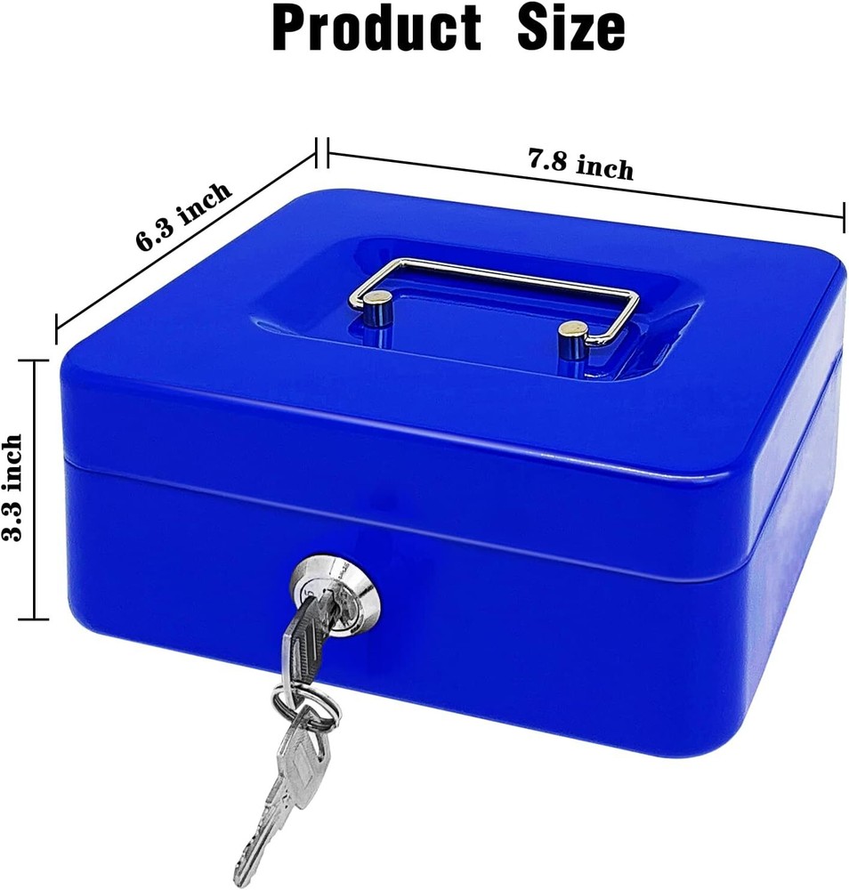 Steel Cash Box with Key Lock, Metal Small Money Blue - 7.8" x 6.3" x 3.3" Product Details Brand: PACOLO Product Dimensions: 5.9"D x 3.1"W x 4.7"H Lock Type: Key Color: Blue - 7.8" x 6.3" x 3.3" Material: Alloy Steel, Metal Special Feature: Key Lock Mounting Type: Floor Mount Control Type: Key Control Included Components: Stainless Steel, Alloy Steel, Plastic, Metal Water Resistance Level: Not Water Resistant Chamber Depth: 5.9 Inches Manufacturer: PACOLO Part Number: Steel Cash Box with Key Lock Item Weight: 1.72 pounds Country of Origin: China Item model number: Steel Cash Box Style: Classic Special Features: Key Lock Batteries Included?: No Batteries Required?: No Brand: PACOLO Product Dimensions: 5.9"D x 3.1"W x 4.7"H Lock Type: Key Color: Blue - 7.8" x 6.3" x 3.3" Material: Alloy Steel, Metal Special Feature: Key Lock Mounting Type: Floor Mount Control Type: Key Control Included Components: Stainless Steel, Alloy Steel, Plastic, Metal Water Resistance Level: Not Water Resistant Size and Color: Exterior dimensions: 7.8 inch x 6.3 inch x 3.3 inch; Four colors(Black, White, Red, and Blue) are available for you to choose from. Key Lock: This cash box has a key lock to keep valuables safe. The key is easy to operate and can be opened with one hand. Removable Tray: This cash box has a removable tray with six compartments for excellent coin organization and a layer underneath the tray for storing cash and checks. Highly Quality: This solid steel cash box does not fear knocks and shocks.Suitable for storing bills, coins, checks, and receipts. The lock box is lightweight with a convenient handle, so you can take it anywhere and hide it easily. Wide Application: This money box with a key is suitable for indoor or outdoor small businesses, commercial supermarkets, stores, lockers, cabinets, and family use. It is also a perfect gift for your friends and family for birthdays, Mother’s Day, or Christmas. Suitable for storing bills, coins, checks, and receipts.