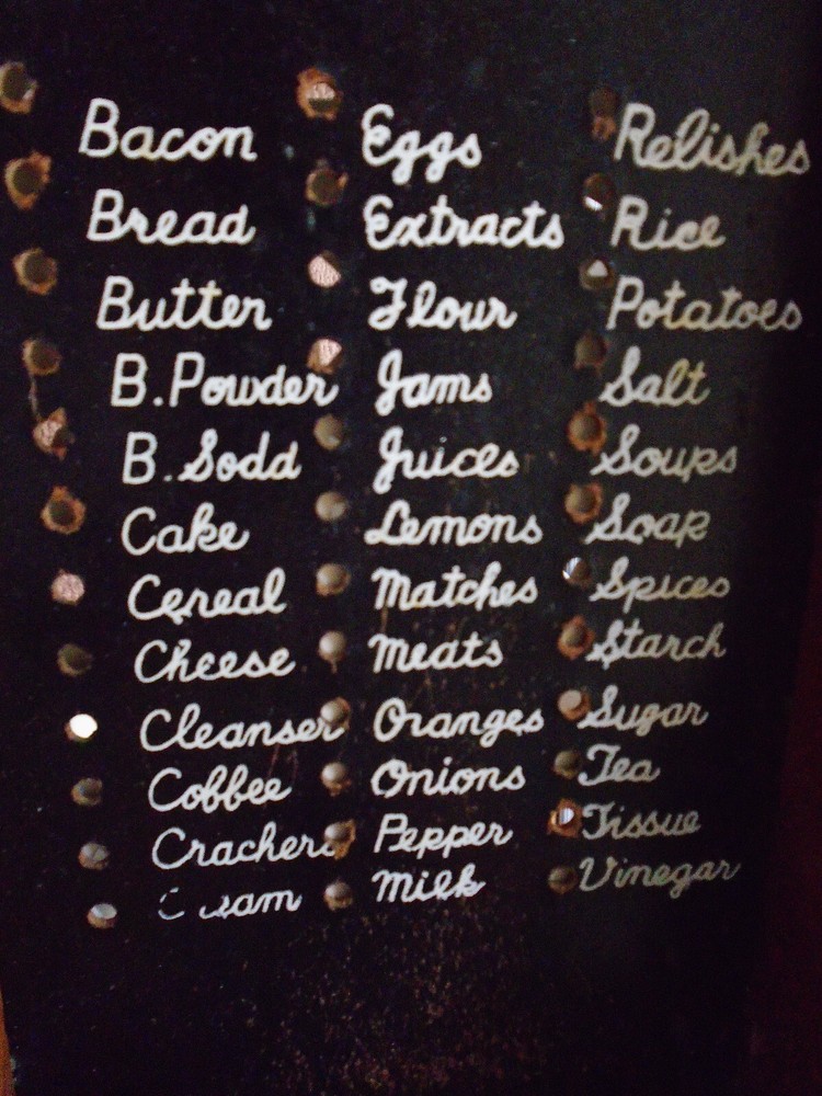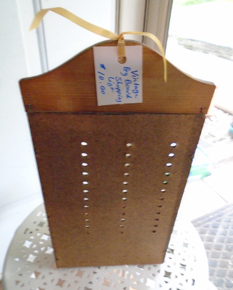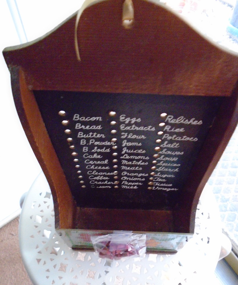 What a cute item!! (Estate item from local East TN estate). Has little red pegs so that you can mark what you are out of. So when you make your shopping list, you won't forget anything. Also has an acrylic front for slipping coupons etc into so you don't forget to take those with you. Really Sweet Mid-Century Item. Measures 11.25" tall x 5 5/8" wide x 2 1/8". CONDITION: Very minor signs of wear use and age. There should be 12 red pegs and there are just 11. One is lost. Overall good condition. From smoke free home . My Inv. I N 4B - Item # 3593