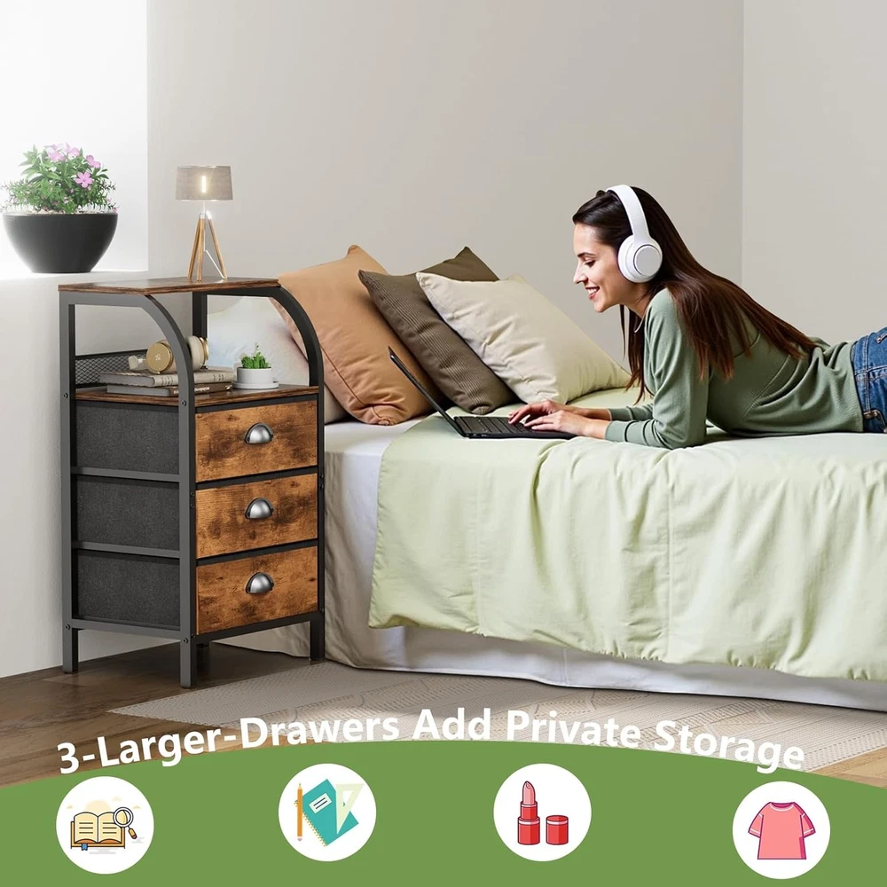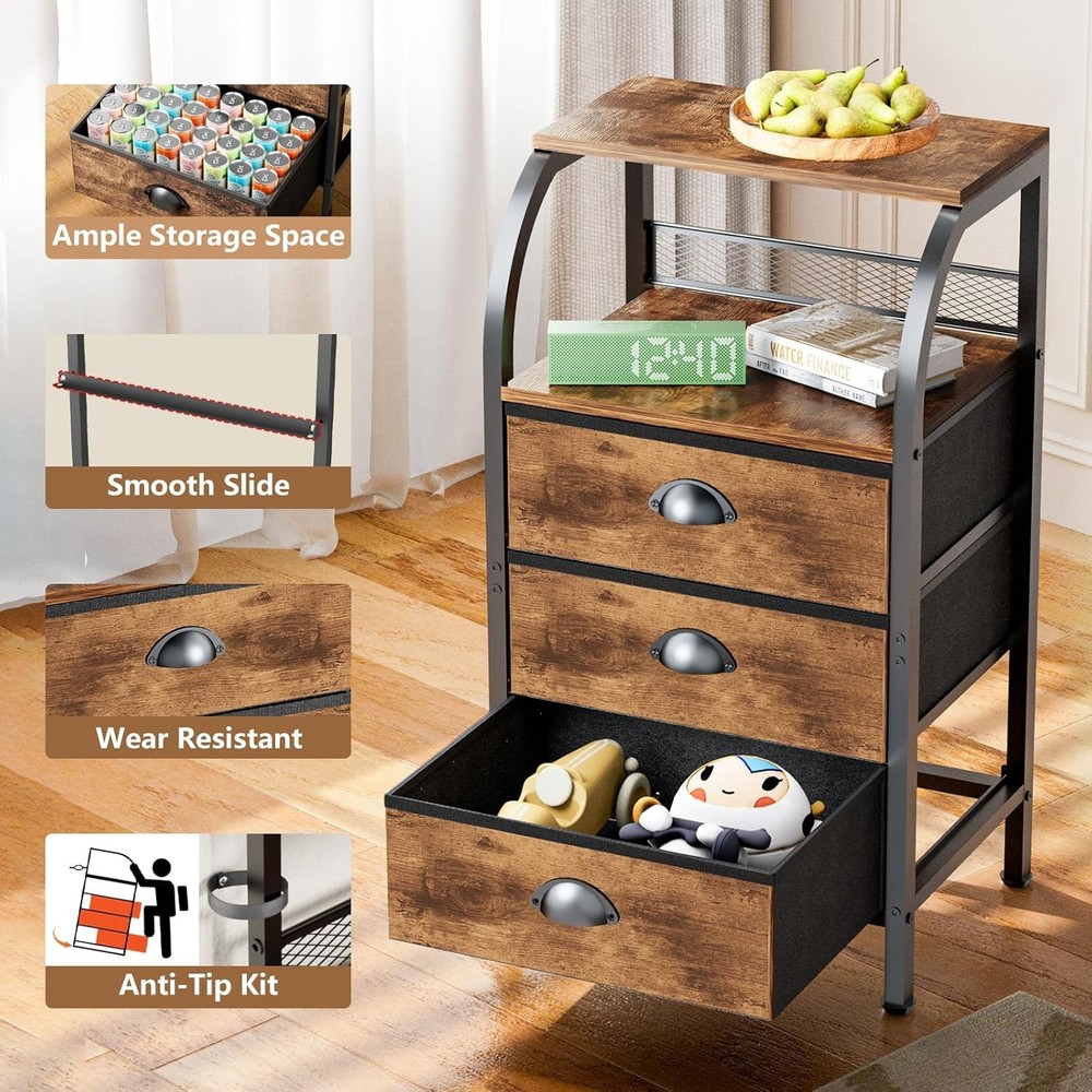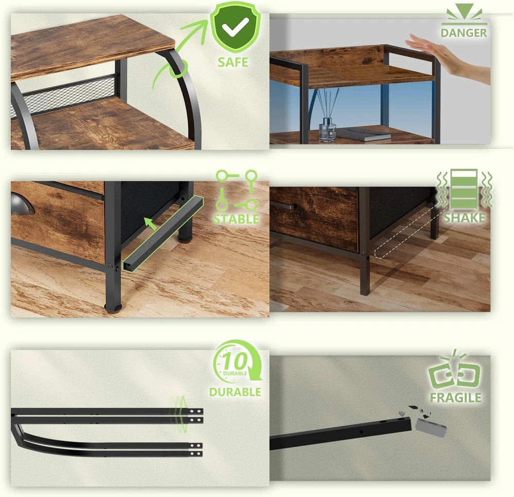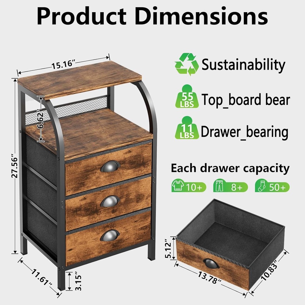 Night Stand Dresser for 11.6"D x 15.2"W x 27.6"H (3 Drawers), Rustic Brown Product Details Brand: Jixlantuc Product Dimensions: 11.61"D x 15.16"W x 27.56"H Color: Rustic Brown Mounting Type: Floor Mount Room Type: Kids Room, Bedroom, Living Room, Home Office, Study Room Special Feature: Storage, Space Saving, Adjustable Feet, Easy Assembly, Foot Rest Furniture Finish: Grain Wood Drawer Type: Under Mounted Slide Assembly Required: Yes Model Name: Night Stand Bedside Table Bedroom Item Weight: 5.3 Kilograms Size: 11.6"D x 15.2"W x 27.6"H (3 Drawers) Number of Pieces: 1 Target Audience: Kid, Adult, Baby Manufacturer: JIX Item Weight: 11.66 pounds Country of Origin: China Item model number: 168 MaterialFinish Type: Engineered Wood, Alloy Steel, IronUnfinished Number of DrawersStyle: 3Mid-Century Modern, Modern, Farmhouse, Rustic Nightstands with Drawers: The fabric drawers are of high-quality fabric, being lightweight and sturdy, not pinching hands and safe for children. The drawer of the side tables bedroom, having a wooden board as an interlayer, are durable and non-deformed Various Use Occasions: The end table are suitable for any home room easily. It can act as a bedroom storage dresser, a sofa table with drawer organizer, and is also great for closet organizer, storage cabinet, entryways, hallways, playrooms Double Display Shelf: The side table with storage shelf in living room, display photo frames, lamps, decorations,etc. The night stands has a rounded design to prevent bumps and bruises. Plus: Back baffle design stops small items from dropping Sturdy and Durable: The bedside table with drawers is made of a sturdy metal frame. The details of bedside tables are handled with one-piece molding and have fixed beams added to the bottom.The chest of drawers is made of high grade fabric, textured and water-resistant. The frame of Jixlantuc nightstand is more stable and durable Easy Assembly: Assembling these bed side end tables is a breeze. Coming with detailed instructions, provided tools, and numbered components, along with helpful videos available on the Jixlantuc nightstand details page