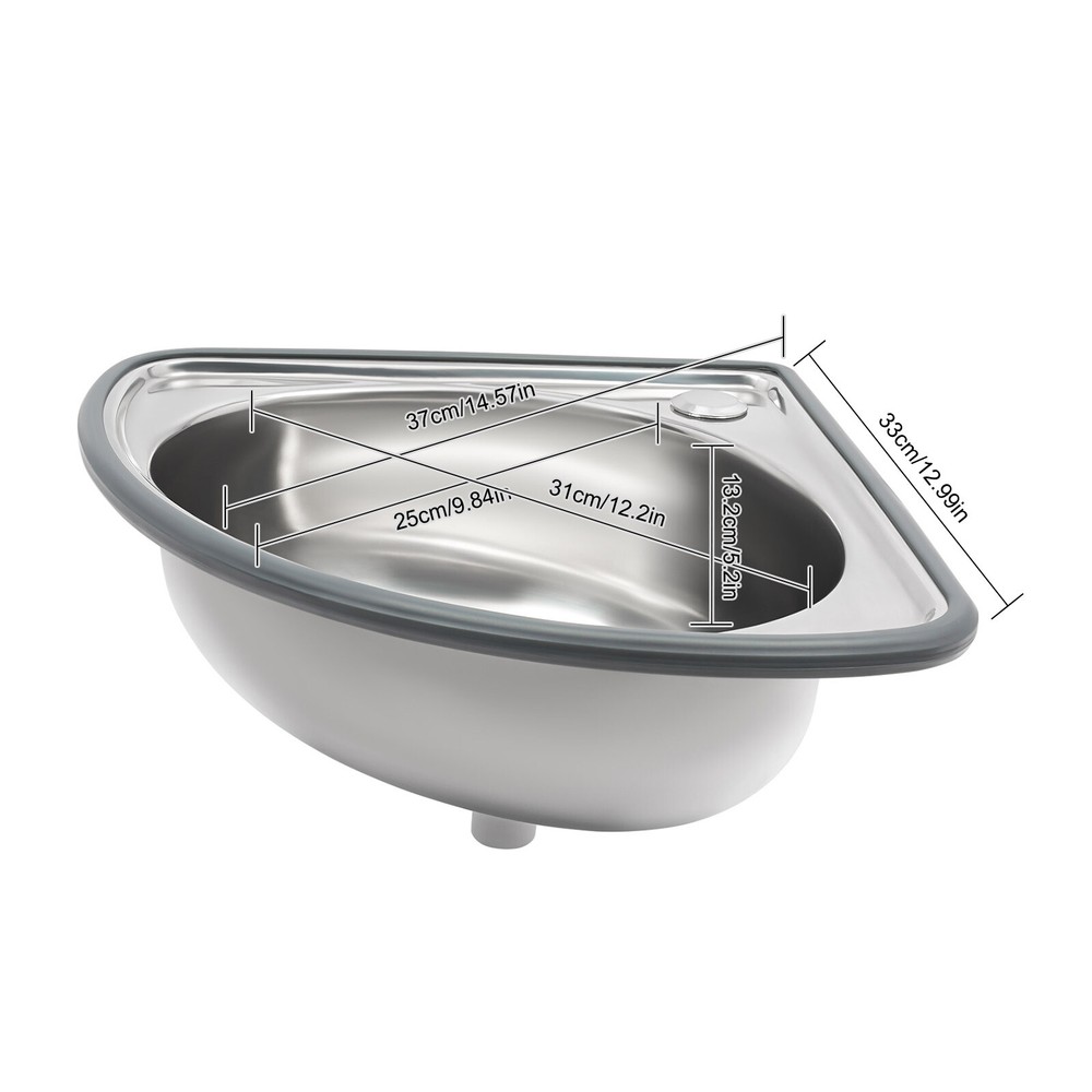 Stainless Steel Small Wall Mount Corner Bathroom Sink With Overflow Triangle Description This basin is made of stainless steel and plastic through the polishing process, which is strong and durable. Its special triangular design makes it fit the corner of the wall beautifully, which greatly improves the utilization of space. The unique shape is both beautiful and practical. It is ideal for bathrooms and toilets in small homes. Come and bring it home. Details Rounded Corners and Edges The corners are rounded and smooth to reduce collisions and improve safety. Plastic Ring It has a good seal performance and can prevent the drain pipe from leaking. 2 Nailless Adhesives They can help you bond the brackets for easy installation and without damaging the walls. Small Pads They can cover the screws on the bracket, making it more aesthetically pleasing by preventing rust. Filter It filters food debris, prevents odors and avoids clogging the drain. Key Features Build to Last: It is made of high-quality plastic and stainless steel materials after the polishing process, which can effectively protect the product from rust and abrasion, and make the product have high hardness and long service life. High Load-bearing Capacity: The sturdy triangular construction and strong bracket allow it to hold approximately 55.12lbs, so you can use it with confidence. User-friendly Design: The bottom of the product comes with a pad that can reduce the sound of water hitting the bottom of the basin, providing a quiet living space for you and your family. The wrapped smooth edge can take care of your skin and protect your hands from getting scratched during daily use. Excellent Drainage: The practical drainer and 31.5in long drain pipe make it easy and convenient to drain sewage after use, avoiding stagnant water and keeping the basin clean. Suitable Size: The product with a inner size of 12.2*9.84*5.2in can accommodate enough dishes and fruits(not included) for convenient washing without water splashing. Space-saving: The compact size of 17.32*14.57in and special triangular design can make full use of corner space and greatly improve space utilization, which is ideal for narrow bathrooms, kitchens and RVs, etc. Good-looking Appearance: The sleek silver surface and triangular design give it a modern and stylish look that blends with different decorative styles and adds a touch of decor to your space. Simple Installation: With a simple structure, right-angle design and complete accessories, you can easily install the product in the corner of your kitchen or bathroom, saving you more time and space. Effortless Clean: Thanks to its smooth surface and the basin bottom without clean dead angle , you are allowed to easily remove dust from the surface of the product with a towel(not included). Ideal Gift: Its practical function and glossy appearance make it an ideal housewarming gift for your friends, families, and colleagues. Application It is suitable for washing hands, food, fruits, vegetables, and dishes in restaurants, bars, cafes, kitchens, bathrooms, sweet stores, cleaning rooms, laundry rooms, garages, basements, utility rooms, backyards, gardens, homes, commercial uses or other outdoor or indoor places. Specifications Material: Stainless Steel, Plastic Process: Polishing Style: Modern Color: Silver Mount Type: Countertop Mounted, Wall-mounted Fixing Method: Screw Fixed Shape: Triangle Assembly Required: Yes Load-bearing Capacity: About 25kg/55.12lbs Drain Pipe Length: 80cm/31.5in Wall Thickness: 0.3-0.4mm/0.01-0.02in Gross Weight: 1kg/2.2lbs Product Internal Size: 31*25*13.2cm/12.2*9.84*5.2in Overall Product Size: 44*37cm/17.32*14.57in Length of Both Sides: 33cm/12.99in. Package Size: 38*38*21cm/14.96*14.96*8.27in Package Included 1*Basin 1*Mounting Bracket 1*Drain Pipe 2*Nailless Adhesives 1*Drainer All Accessories for Assembly Notes Please note that this product does not include the inlet pipe and faucet. Please check the size carefully before ordering. It is normal that the expansion screw will blow up after the force is applied. Please note that to prolong the life of the sink, do not scratch the surface with sharp objects. Please do not use strong acids or alkalis to clean items in the sink, and do not put hard objects or rusty metal in contact with the sink for a long time, keep the sink clean by cleaning the sink and drying it with a rag after each use. Please inspect the sink before installation to make sure it has not been cracked or broken during transportation. Please allow the slight color difference caused by the shooting light and 1-3cm error due to manual measurement, and make sure you do not mind before you order. Payment Delivery details Terms of sales About us Contact us Payment We accept ebay payment 。 Fees such as import duties, taxes are not included in the item price or shipping costs. These charges are the buyer's responsibility. Delivery details Shipping: 2-9 working days to: USA Terms of sales We maintain high standards of excellence and strive for hundred percent customer satisfaction. Feedback is very important to us. We hope that you contact us immediately before you give neutral or negative feedback, so that we can address your concerns. It is impossible to address issues if we do not know about them! About us Your satis faction is our ultimate goal. We work hard to earn your trust and future business. Our certified technicians have tested each item before shipping. The unit comes with 1 year limited warranty on all manufacturing defects. a) If you receive a defective item, you may return it or ask for a discount. Please contact us within 14 days after you receive the package. b) What you returned must be intact and in its original packaging as re? u. Customer is responsible for shipping costs of the returned item. c) We will cover the cost of shipping back t with the shipping rate indicated in the registration page. We will send you a new unit or refund the full payment you paid. Than