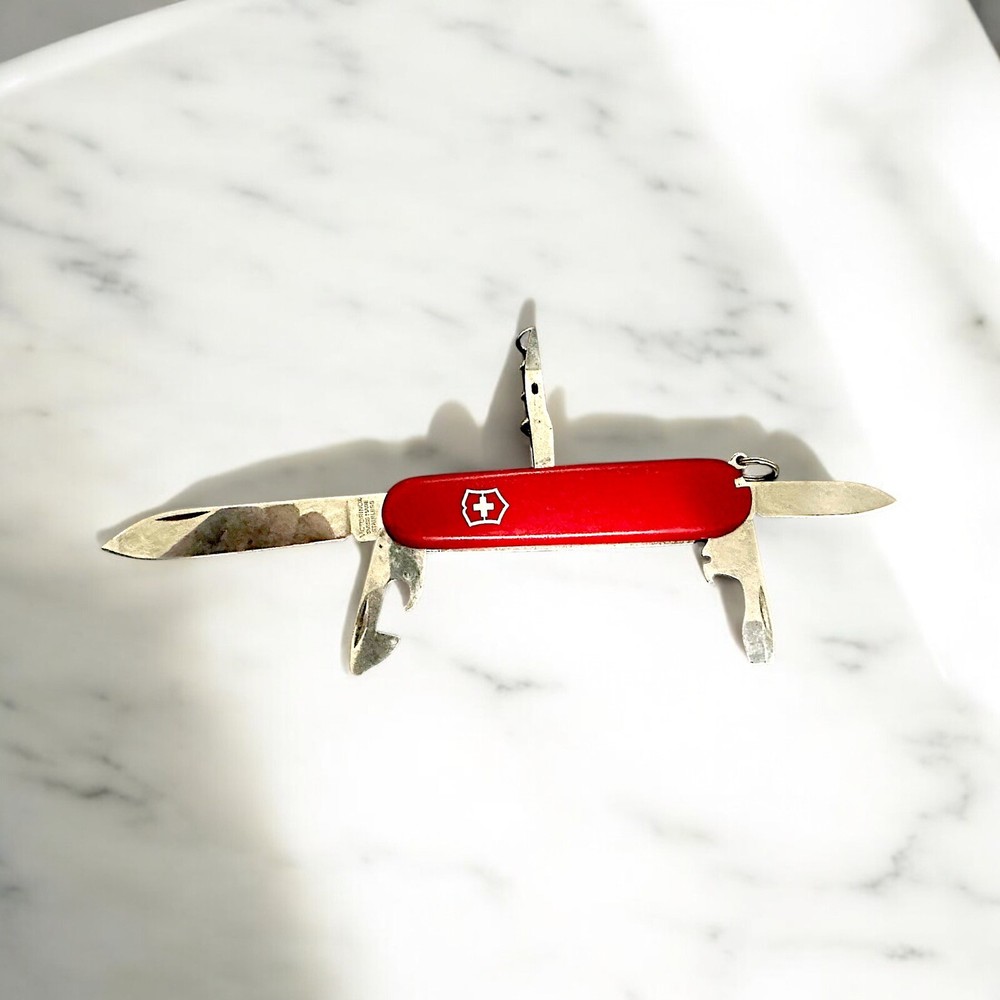 The Swiss Army Multitool is a red manual multi-tool featuring a toothpick, corkscrew, fish scaler, and bottle opener. It has a plain edge blade with two blades, making it a versatile tool for various tasks. It is a modern folding knife manufactured by Swiss Army, suitable for collectors and everyday use. Blade 1 length- 2.75” Blade 2 Length- 1.5” Weight- 2.05oz Will only ship where legal, Let me know if you have any questions.