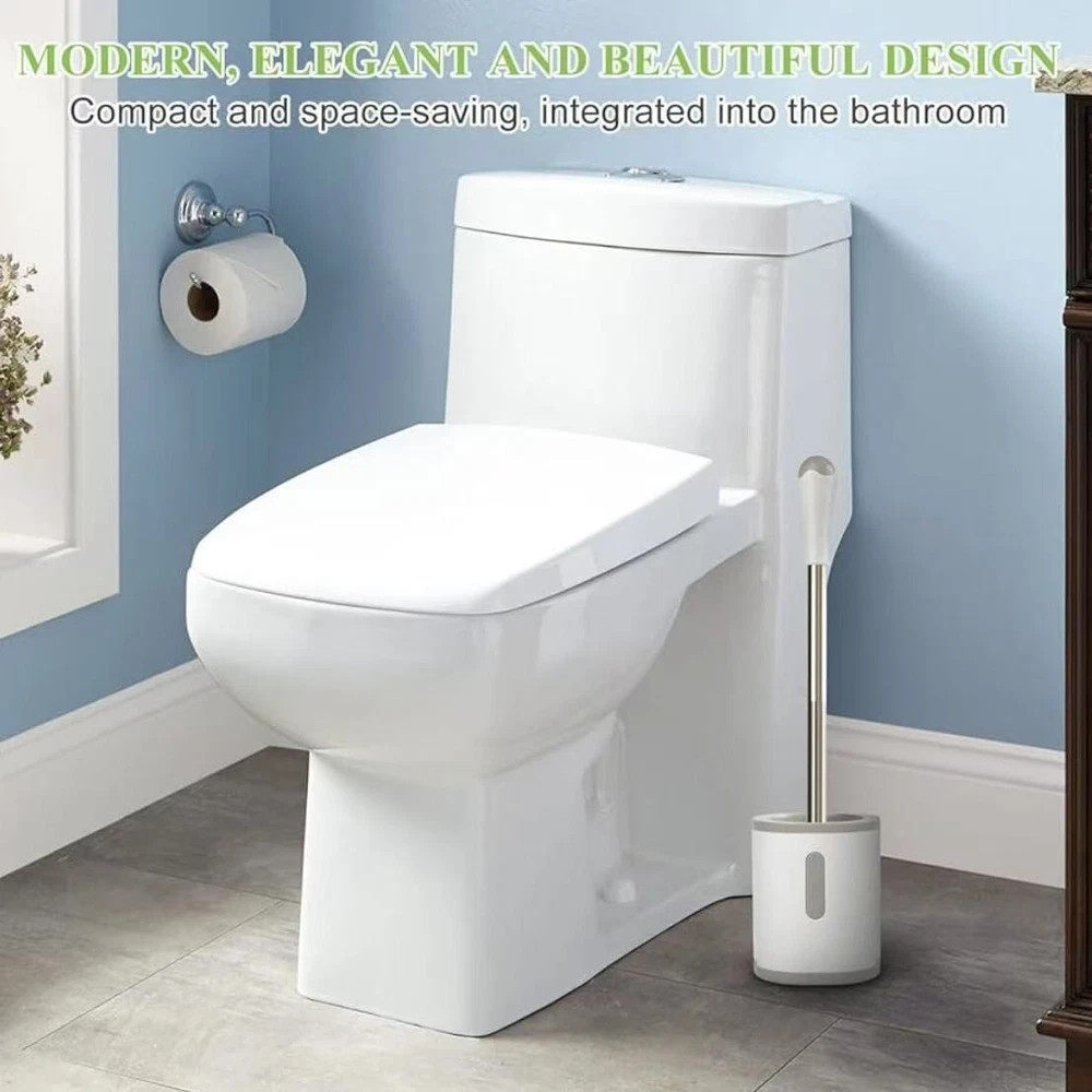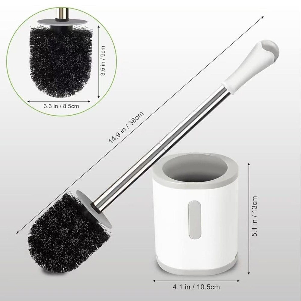 About this item Compact Size: The holder measures 4.1" x 3.3" x 5.1", Small Size holder Space Saving for Storage and Organization, Easy to hide to ensure the beauty of the bathroom. Hidden Toilet Scrubber: Toilet brush with plastic cover hides the brush head inside the base from view, keeping it beautiful. Durable Bristles: toilet bowl brush and holder with Sturdy-bristled deep clean the toilet, such as under the rim, inside the pipe. The brush sits in its own holder and easy to store. Stainless steel and plastic handle: forbidden to soak in toilet cleaner to avoid corrosion and rust. After use, rinse with clean water and dry in time for maintenance. Hollow base: High-quality ABS thickened toilet cleaner brush base. The compact size doesn't take up too much space, and the elegant design matches every bathroom style.