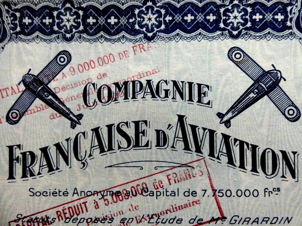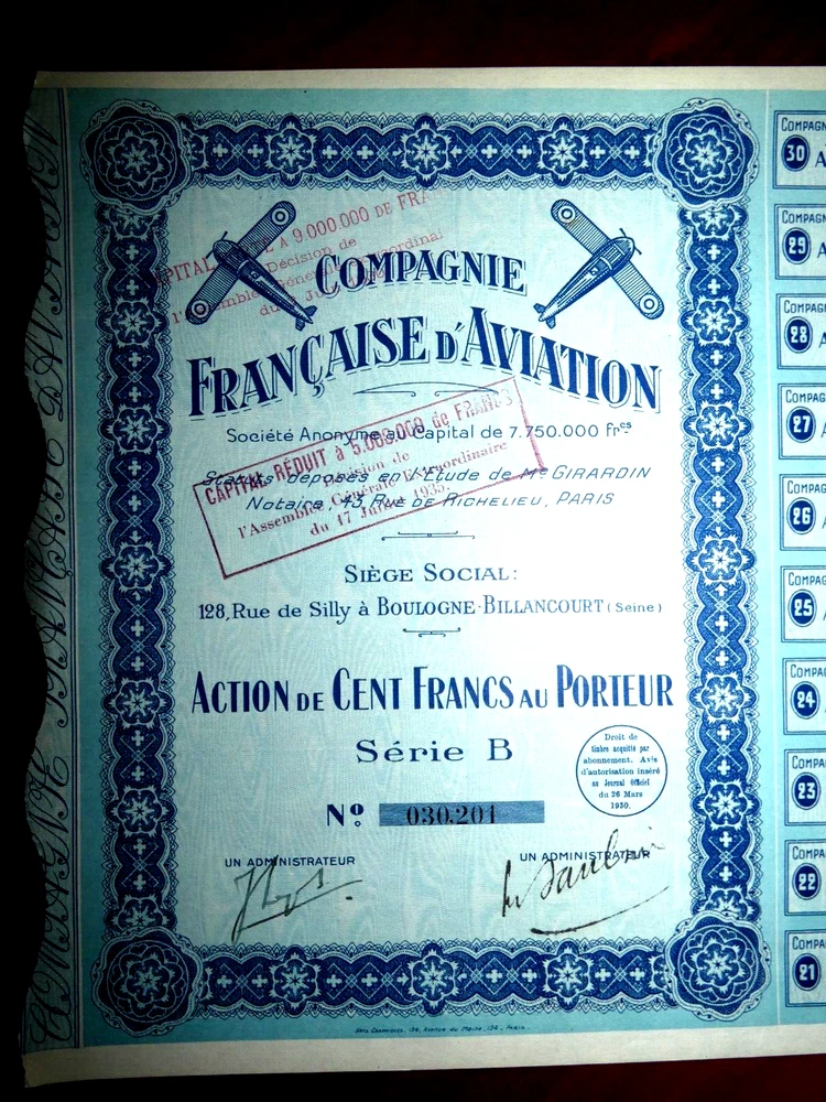 Notascript Banknotes, Bonds & Shares One bearer share certificate of the " Compagnie Française d´Aviation" ,Boulogne-Billancourt (Seine) 1930 . Office at the time: 128 Rue de Silly ,Boulogne-Billancourt (Seine).Condition (opinion) :Very Fine/Extremely Fine (VF/EF ). Uncancelled . Size: 26,2cm/20cm (small or average/small.Size of the main document ,without counting the coupons size) .One handwritten signature. Compagnie Française d'Aviation (CFA) was a French aircraft manufacturer of the 1930s and 1940s. It was established in 1936 as a division of the Salmson engine company to handle the mass production of the Cricri light aircraft. D.7 Cricri Major built by CFA in 1947 at Pontoise airfield near Paris in 1967 Manufacturing was interrupted by World War II, but was revived on a small scale thereafter. By 1951, their CFA D.7 Cricri Major design and its derivatives were thoroughly outdated, and the company was dissolved at this time. See below for related information from the web. Historical document for collectable or historical research only. Use this picture for reference only, serial number may be different. Please read carefully the sale terms ,shipping conditions and information below. The buyer accepts those terms, conditions and cost described. ---------------------------------------------------------------------------------------- Terms of sale and shippig information Postage, including packing material, handling fees : Europe: USD 9.70 / USA $ 10.70. Rest of the World: USD 12.00. FREE of postage for other items. (excluding purchases under US$70.00 with a weight greater than 100 gr. including the protection and packaging card ) . Only one shipping charge per shipment (the highest one) no matter how many items you buy (combined shipping). ----------------------------------------------------------------------------- Guaranteed genuine - One month return policy (retail sales) . Returns accepted with no questions. Customers are invited to combine purchases to save postage. As we have (or could have) more than one identical item ,the serial number may differ from those shown in the picture which is for reference only. For purchases above $70.00 we send the orders registered with tracking number without extra charge, for purchases below $70.00 we ship as regular letters at the buyer's risk. For purchases below $ 70,00 who want to register your letter with tracking number, please add an extra for : Europe $4.20 , U.S. $5.00 ,Rest of the word $5.90 .For this case ,please request or wait for our invoice before paying. Postage include packaging material and handling fees. For some destinations and purchases below $70.00 customers may be requested for this extra shipping payment in order to register the shipment with tracking number. We reserve the right to cancel transactions that require the sending of unregistered letters (without tracking number) to some destinations when this extra payment has been requested. For purchases over $70.00, the excess weight will be free. For purchases under US$70.00 with a weight greater than 100 gr. including the protection and packaging card, the buyer is asked not to make the payment until receiving the invoice or shipment note, since the cost will be calculated and the type of shipment will be assessed (registered or insured or not) and the buyer will be charged the approximate total of the costs of the Post Office rate (rates that are public and can be consulted), in this case the costs of packaging materials, handling and delivery management are free. In the event that the buyer has already made the payment, he will be asked to pay the difference that is missing for the payment of the postal rate. Likewise, we reserve the right to cancel transactions that have not been paid this extra amount when requested. If for any reason, your item did not arrive yet, or you are not 100% satisfied with the item you have received, please do not hesitate to contact , I will do all it takes to provide the best service. The buyer must notify to us of the delay in the arrival of his purchase when he meets 3 weeks ( to Europe) to 4 weeks (rest of the World) this guarantee expires two months after the shipment of his purchase if we have not previously received notice of the delay . ----------------------------------------------------------------------------------- Banknote Grading UNC AU EF VF F VG G Fair Poor Uncirculated About Uncirculated Extremely Fine Very Fine Fine Very Good Good Fair Poor Edges no counting marks light counting folds OR... light counting folds corners are not fully rounded much handling on edges rounded edges Folds no folds ...OR one light fold through center max. three light folds or one strong crease several horizontal and vertical folds many folds and creases Paper color paper is clean with bright colors paper may have minimal dirt or some color smudging, but still crisp paper is not excessively dirty, but may have some softness paper may be dirty, discolored or stained very dirty, discolored and with some writing very dirty, discolorated, with writing and some obscured portions very dirty, discolored, with writing and obscured portions Tears no tears no tears into the border minor tears in the border, but out of design tears into the design Holes no holes no center hole, but staple hole usual center hole and staple hole Integrity no pieces missing no large pieces missing piece missing piece missing or tape holding pieces together <div style="text-align:center"><a style="text-decoration:none" href="http://mostpopular.sellathon.com/?id=AC1061546"><img src="http://www.sellathon.com/Resources/Images/countercredit.gif" border="0"></a></div> Your browser does not support JavaScript. To view this page, enable JavaScript if it is disabled or upgrade your browser. See below for related information from the web: Compagnie Française d'Aviation (CFA) was a French aircraft manufacturer of the 1930s and 1940s. It was established in 1936 as a division of the