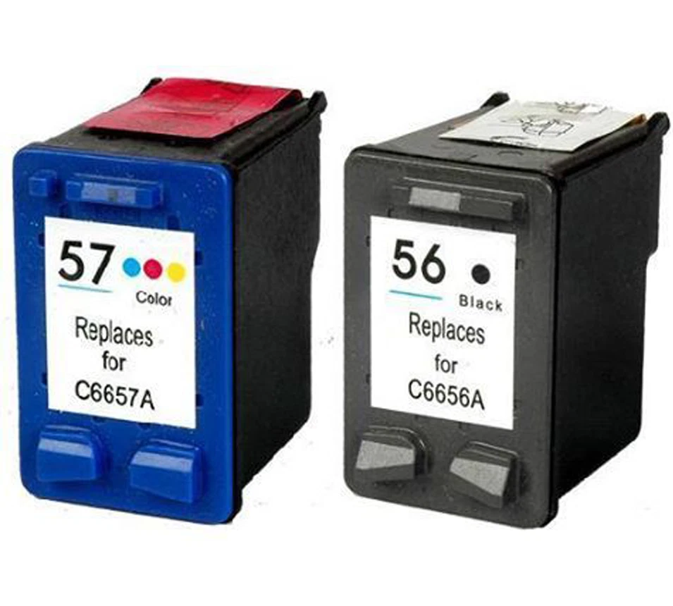 Remanufactured 2 PKS 56 BLACK ( C6656AN ) - 520 pages 57 COLOR ( C6657AN ) - 500 pages HP COLOR COPIER SERIES Color Copier 410 HP DESKJET SERIES Deskjet 450 / 450cbi / 450ci / 450wbt Deskjet 5150 / 5150w / 5150v Deskjet 5550 / 5550v Deskjet 5551 Deskjet 5560 Deskjet 5650 / 5650w / 5650v Deskjet 5655 Deskjet 5850 / 5850w Deskjet 9650 Deskjet 9670 Deskjet 9680 / 9680gp HP OFFICEJET SERIES Officejet 4110 / 4110v / 4110xi Officejet 4215 / 4215v / 4215xi Officejet 5505 Officejet 5508 Officejet 5510 / 5510v / 5510xi Officejet 5515 Officejet 6105 Officejet 6110 / 6110v / 6110xi Officejet J5508 Officejet J5520 HP PHOTOSMART SERIES Photosmart 7150 Photosmart 7260 / 7260v / 7260w Photosmart 7350 / 7350v / 7350w Photosmart 7450 / 7450v / 7450xi Photosmart 7459 Photosmart 7550 / 7550v / 7550w Photosmart 7660 / 7660v / 7660w Photosmart 7755 Photosmart 7760 / 7760v / 7760w Photosmart 7762 Photosmart 7960 / 7960v / 7960w HP PSC SERIES PSC 1100 / 1110v PSC 1205 PSC 1209 PSC 1210 / 1210L / 1210xi / 1210v PSC 1310 PSC 1311 PSC 1312 PSC 1315 / 1315v / 1315xi PSC 1317 PSC 1318 PSC 1340 PSC 1350 / 1350v / 1350xi PSC 1355 PSC 2100 PSC 2108 PSC 2110 / 2110v / 2110xi PSC 2115 PSC 2150 PSC 2170 PSC 2171 PSC 2175 / 2175v / 2175xi PSC 2200 PSC 2210 / 2210v / 2210xi PSC 2410 / 2410v / 2410xi PSC 2510 / 2510xi 100% Satisfaction Guaranteed: We stand behind every product we sell and offer a 100% satisfaction guarantee for a full refund (excluding shipping costs) of the purchase price within 30 days. We import these cartridges from a certified factory and since we import these cartridges ourselves, we can pass the savings on to you, The use of compatible replacement printing supplies does not void your printer warranty.