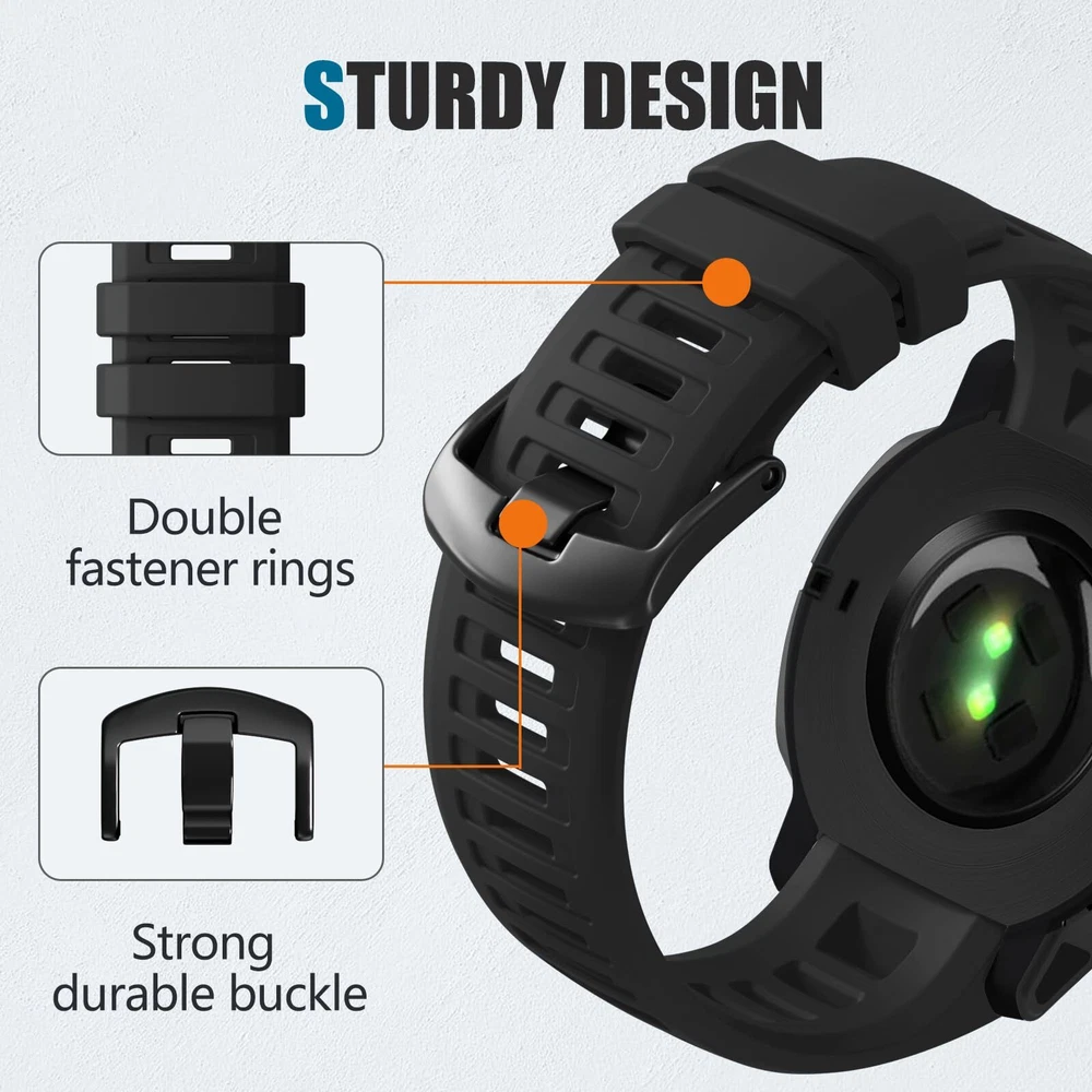 ✅【Wildly Compatible】22mm watch band replacement personalized for your Garmin Instinct/Instinct Solar/Instinct Tactical/Instinct Esports/Instinct Tide/Instinct 2/Instinct 2 Solar/Instinct 2 SolarTactical/Instinct Crossover ▶Please check the model on the watch back before buying!!(NOTE: The watch is not included) ✅【Comfortable Size& Soft Material】Our Garmin instinct watch bands is made of high-quality, eco-friendly silicone, this band is soft, flexible, light and harmless with no peculiar smell. It fits comfortably on wrist sizes from 6.30"-8.66", so the garmin instinct band replacement Great for running, fitness, yoga and other sports, you can wear it all day without discomfort ✅【More Safe Clasp Design】Our replacement watch bands is equipped with two strap holders to better secure the garmin instinct watch to your wrist. No worry for falling off.. Choose a Garmin watch band to make your workout more enjoyable. ✅【Easy to Install】The garmin watch band Replacement can be installed to your watch effortlessly. With the tools in the packages, you can finish the installation smoothly. ✅【New for This Season for Sport】Our 22mm Garmin watch band come in a variety of colors and can be matched as you like, which can fully display the watch's new color change and casual appearance, and it is more in line with your own wear, so that you can have a happy mood all day. It's also the best choice as gifts. Multi row ventilation holes design makes it more breathable,it's also suitable for some high intensity exercise occasions in summer