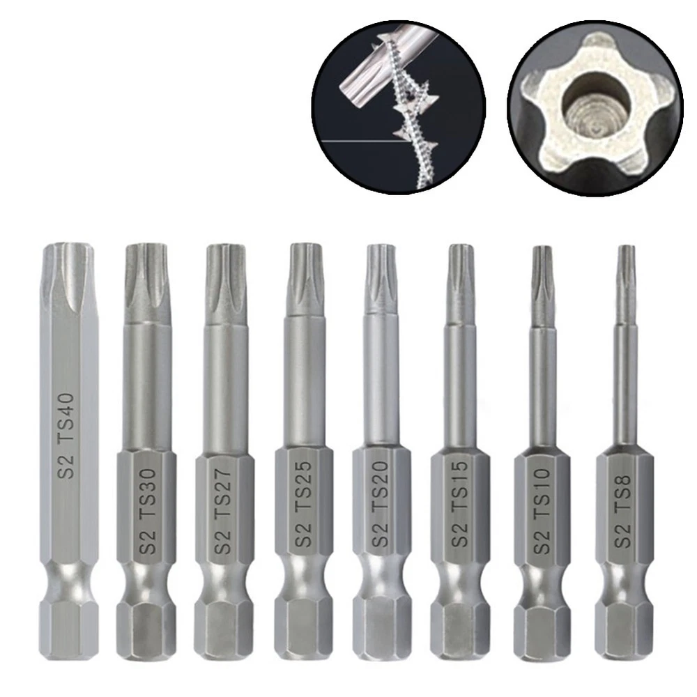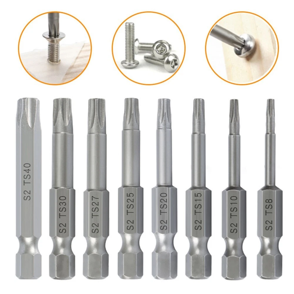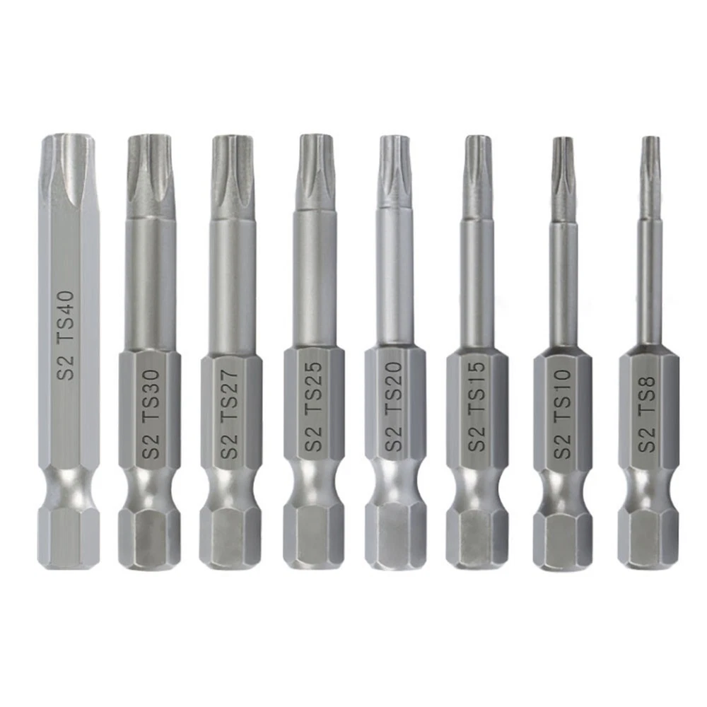 Complete 50mm For Torx Bit Set Including Sizes T8 to T40 for Power Tools DESCRIPTION Features: *High-Quality Material: Made of tough,-resistant material with extremely high abrasion resistance, durability and longevity. *Effortless Screwdriving: With the right screwdriver bar, screws can be easily unscrewed with minimal effort. The bit securely locks onto each edge, damage to both the screw and the screwdriver head. *Versatile Applications: Widely used in manual electric screwdrivers, screwdrivers, drills, and other tools. Suitable for electronics, automotive parts, furniture, and various commercial and industrial applications. *Wide Range of for Torx Sizes: This set includes five-pointed star for Torx head sizes T8, for T10, for T15, for T20, for T25, T27, for T30 and T40, providing a comprehensive solution for various screw sizes. *Convenient Design: The bits have a /4 inch hex shank, compatibility with different screwdriver models. Each bit has a length of 50mm(.96 inches), offering ease of use and maneuverability. Specifications: Product name: for Torx Screwdriver Bit Set Material: Alloy Steel Color: Silver Bit Type: five-pointed star, with Hole Length:(Approx.) 50mm/1.96'' Size: T8, for T10, for T15, for T20, for T25, T27, for T30, T40( of each) Suitable for: electric screwdrivers, screwdrivers, drills, and other tools. Quantity: 8pcs/Set Package Content: 8*Screwdriver Bits Note: .Transition: 1cm=10mm=0.39inch. 2. The real color of the item may be slightly different from the pictures shown on website caused by many factors such as brightness of your monitor and light brightness. 3. Please allow slight manual measurement deviation for the data. POLICES Shipping Payment WARRANTY We only ship to confirmed ebay Order addresses. Please comfirm that your Order address is in line with your shipping address. Please kindly note that the c ombined shipping is not provided because the shipping fee is calculated by weight. Also, the each additional item means exactly the the same color and size. It takes about 7 -15 working days to US; about 10-30 working days to other countries. Transit time may be a little delayed because of the bad weather and customs inspection . If you do not receive your item within 30 working days since payment finished, please contact us immediately for further assistance. Payment must be completed within 5 days. If you have any problems about payment, please contact us via ebay message. We strive for 100% customer satisfaction! Positive Feedback is very important to us. If you have any questions, p lease feel free to contact us via "Ask seller a question" . We will reply your email within 24 working hours.