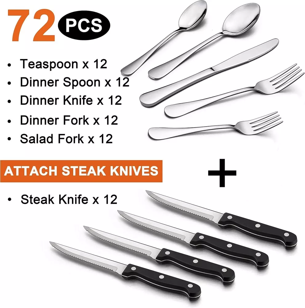 Complete 72-Piece Silverware Set with Ergonomic Steak Knives - Ideal for Gifting ‹ › ‹ › ‹ › ‹ › ‹ › ‹ › ‹ › ‹ › ‹ › Complete 72-Piece Silverware Set with Ergonomic Steak Knives Ideal for Gifting Set Includes: 12 Dinner Spoons 12 Teaspoons 12 Dinner Knives 12 Steak Knives 12 Dinner Forks 12 Salad Forks This exquisite 72-piece flatware set is designed for 12 people and is perfect for daily family use, catering, parties, gatherings, banquets, weddings, restaurants, hotels, and any occasion where elegance is essential. Features: Ergonomic steak knives with sharp serrated blades for smooth slicing, ensuring your dining experience is effortless. Ergonomically designed handles provide a firm grasp, triple-riveted for durability and safety. Made of high-quality stainless steel, rust-resistant and corrosion-resistant for long-lasting use. Solid, sturdy structure ensures utensils won’t bend during heavy use and are dishwasher safe for easy cleaning. Highly mirror polished surface maintains a shining appearance, adding a touch of elegance to any table setting. Exquisite craftsmanship ensures smooth surfaces that prioritize safety for your lips and skin. Perfect weight for comfort, suited for both adults and older children. Benefits: Transforms everyday meals into fine dining experiences. Elegant design elevates your table’s aesthetic. Perfect gift option for weddings, housewarmings, birthdays, Christmas, and Thanksgiving. Designed for versatility across various dining occasions. Why Choose Our Silverware Set? Experience the perfect blend of style and functionality with our Complete 72-Piece Silverware Set. With its elegant design, durable construction, and ergonomic features, this set not only serves as an essential dining tool but also a remarkable addition to your table decor. Enhance your dining experience and impress your guests with the elegance this beautiful set brings. Make a meaningful gift that will be cherished for years - order your Complete 72-Piece Silverware Set today! Shipping Free & Fast Shipping - We offer free shipping to most of the USA with a normal delivery time of 3-7 days. However, due to the current situation, additional delivery time (up to 3 weeks) may be required for some items. Alternative Carriers - We may use alternative carriers (e.g. USPS, FedEx, UPS, etc.) to ensure your package arrives safely and on time. Due to the use of multiple carriers, we are unable to provide a tracking number automatically. Handling Time - Orders are processed and shipped within 1-2 business days of receiving cleared payment. Shipping Restrictions - Shipping to Alaska, Hawaii, Puerto Rico, Guam, and other US territories may incur shipping charges or delivery restrictions. Please contact us before ordering, or your order can be refunded/cancelled. State Restrictions - There may be restrictions based on your state of purchase. For example, certain items may not be shipped to California due to state regulations. Contact for Tracking Updates - If you require tracking updates or have any concerns about the delivery of your order, please feel free to contact us, and we will be happy to assist you. Return 30-Day Hassle-Free Returns - We want you to be completely satisfied with your purchase. If you are not, you can return the item within 30 days of receiving it for a full refund or exchange. Easy Return Process - To start a return, simply contact us and we will provide you with a prepaid return shipping label and detailed instructions. Restocking Fee - There are no restocking fees for returns. However, the buyer is responsible for return shipping costs if the return is not due to a seller's error. Refund Processing Time - Refunds will be processed within 5 business days of receiving the returned item in its original condition. Payment We accept all major credit cards, PayPal, and Apple Pay for your convenience. Your payment information is secure and encrypted to ensure a safe and seamless transaction. Please complete your payment within 3 days of purchase to avoid any delays in shipping. Feedback Your feedback is extremely important to us. We strive to provide the best products and customer service possible. If you are satisfied with your purchase, please take a moment to leave us a positive review. If you have any concerns or issues with your order, please contact us before leaving negative feedback. We are committed to resolving any problems and ensuring your satisfaction. Contact Us If you have any questions or concerns, please feel free to reach out to our customer support team. You can contact us through the eBay messaging system. We are available Monday to Friday, 9:00 am to 5:00 pm EST, and we will do our best to respond to your inquiry within 24 hours. Buy it now and enjoy a pleasant shopping experience! UPC: Not Set Unit Quantity: 72 Material: Stainless Steel Set Includes: Serving Set,Steak Knife,Dinner Spoon,Teaspoon,Dinner Knife,Dinner Fork,Salad Fork Department: Kids,Teens,Adults,Unisex Character: Not Set Features: Dishwasher Safe,Rust Resistant,Corrosion Resistant Type: Set Brand: Unbranded Handle Material: Stainless Steel Country/Region of Manufacture: Not Set Color: Silver Finish: Polished Style: Modern Handle Pattern: Not Set MPN: Not Set Occasion: Wedding Character Family: Not Set Wood Tone: Not Set Item Length: Not Set Care Instructions: Dishwasher Safe Model: Not Set Item Weight: Not Set Manufacturer Warranty: Not Set Unit Type: Not Set