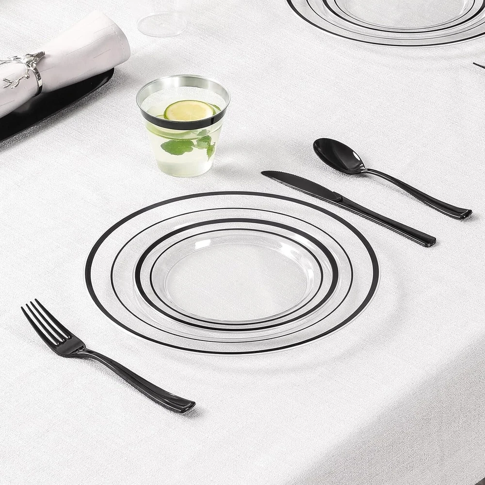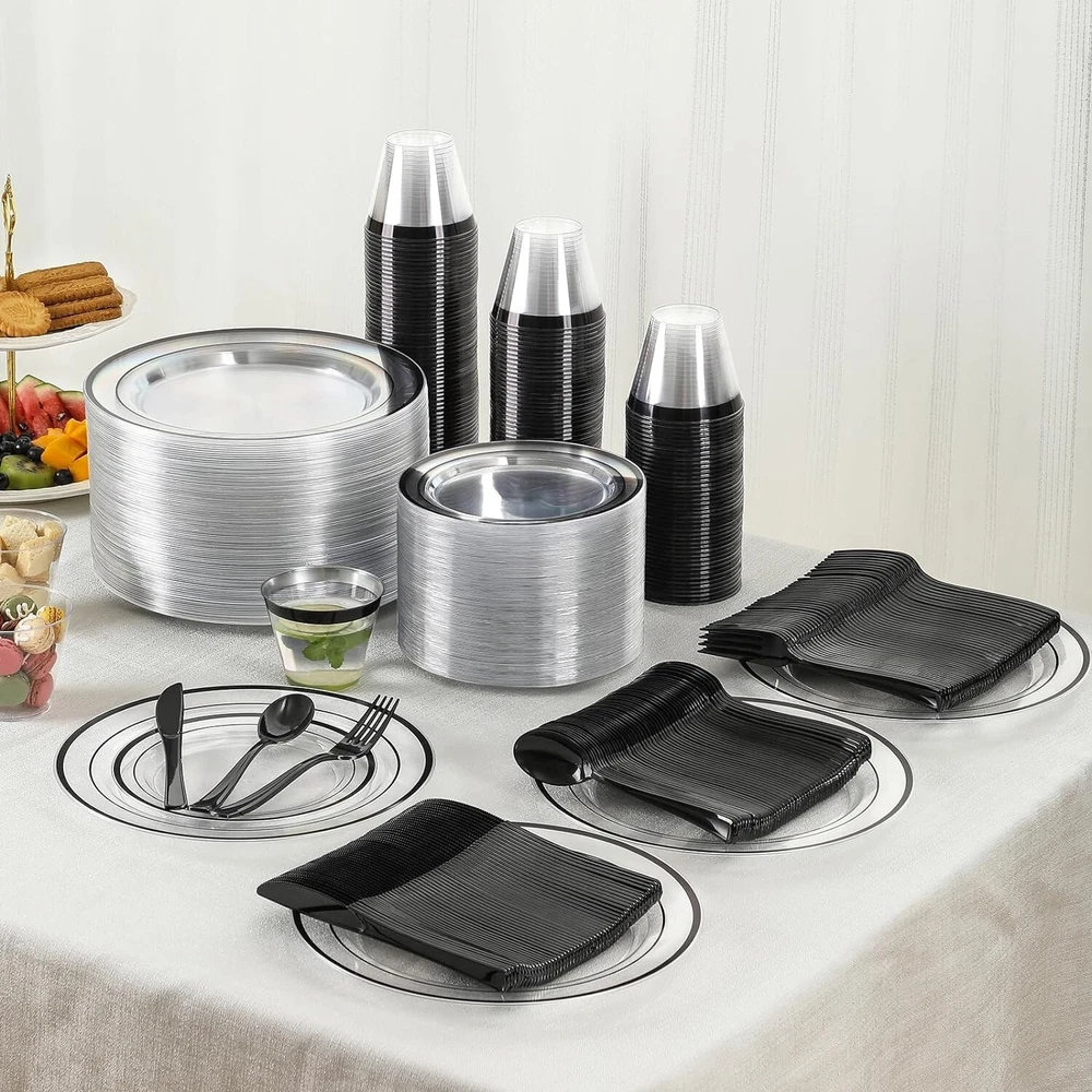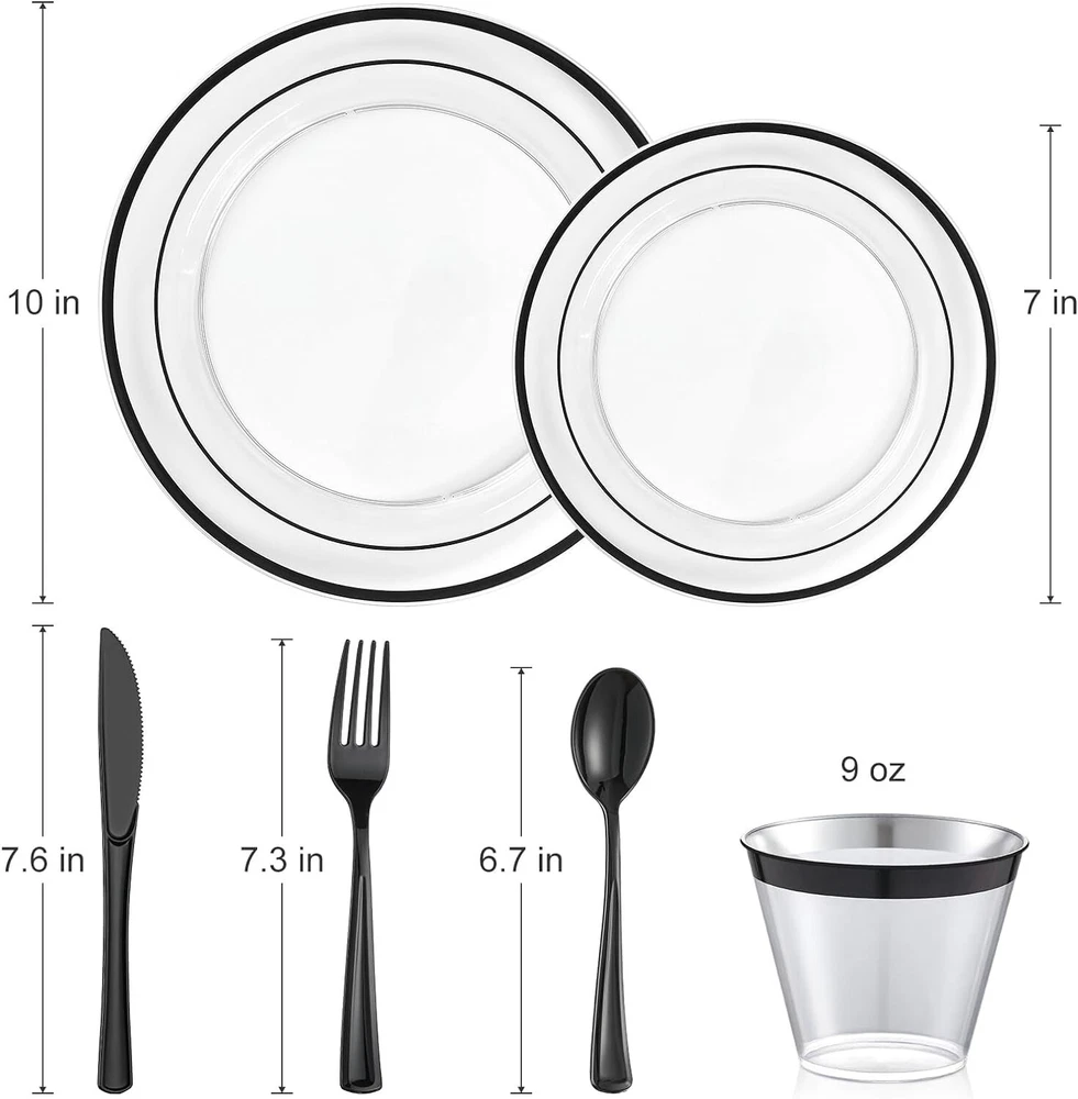 Complete Black Disposable Dinnerware Set for 100 - 600 Pieces for Every Occasion ‹ › ‹ › ‹ › ‹ › ‹ › ‹ › ‹ › ‹ › ‹ › Complete Black Disposable Dinnerware Set for 100 - 600 Pieces - High-Quality Material: Made of heavy-weight, premium-quality material, non-toxic, BPA-free, and food-safe. Resistant to cracking or breaking. - Value Package: Includes plates in two sizes, dinner knives, spoons, forks, and cups, each with 100 pieces. Convenient disposability. - Elegant Black Appearance: Transparent dinnerware with black rims and all-black cutlery for a sophisticated and modern aesthetic. - Versatile Use: Perfect for birthday parties, anniversaries, weddings, or corporate events. Blends seamlessly with any theme or decor. - Customer Satisfaction: Hassle-free dining experience guaranteed. High-quality, disposable dinnerware to make your event unforgettable. Why Choose Our Disposable Dinnerware Set? Elevate your event with our Complete Black Disposable Dinnerware Set. Made of premium-quality material, this set is not only stylish but also durable and sturdy. With 600 pieces in total and an elegant black appearance, you can create a sophisticated and modern ambiance for any occasion. From birthday parties to weddings, our versatile dinnerware set is the perfect choice for all your event needs. Enjoy the convenience of disposability without compromising on quality. Let us take care of the details while you focus on creating unforgettable memories. Shipping Free & Fast Shipping - We offer free shipping to most of the USA with a normal delivery time of 3-7 days. However, due to the current situation, additional delivery time (up to 3 weeks) may be required for some items. Alternative Carriers - We may use alternative carriers (e.g. USPS, FedEx, UPS, etc.) to ensure your package arrives safely and on time. Due to the use of multiple carriers, we are unable to provide a tracking number automatically. Handling Time - Orders are processed and shipped within 1-2 business days of receiving cleared payment. Shipping Restrictions - Shipping to Alaska, Hawaii, Puerto Rico, Guam, and other US territories may incur shipping charges or delivery restrictions. Please contact us before ordering, or your order can be refunded/cancelled. State Restrictions - There may be restrictions based on your state of purchase. For example, certain items may not be shipped to California due to state regulations. Contact for Tracking Updates - If you require tracking updates or have any concerns about the delivery of your order, please feel free to contact us, and we will be happy to assist you. Return 30-Day Hassle-Free Returns - We want you to be completely satisfied with your purchase. If you are not, you can return the item within 30 days of receiving it for a full refund or exchange. Easy Return Process - To start a return, simply contact us and we will provide you with a prepaid return shipping label and detailed instructions. Restocking Fee - There are no restocking fees for returns. However, the buyer is responsible for return shipping costs if the return is not due to a seller's error. Refund Processing Time - Refunds will be processed within 5 business days of receiving the returned item in its original condition. Payment We accept all major credit cards, PayPal, and Apple Pay for your convenience. Your payment information is secure and encrypted to ensure a safe and seamless transaction. Please complete your payment within 3 days of purchase to avoid any delays in shipping. Feedback Your feedback is extremely important to us. We strive to provide the best products and customer service possible. If you are satisfied with your purchase, please take a moment to leave us a positive review. If you have any concerns or issues with your order, please contact us before leaving negative feedback. We are committed to resolving any problems and ensuring your satisfaction. Contact Us If you have any questions or concerns, please feel free to reach out to our customer support team. You can contact us through the eBay messaging system. We are available Monday to Friday, 9:00 am to 5:00 pm EST, and we will do our best to respond to your inquiry within 24 hours. Thank you for supporting our small family business! Unit Quantity: 600 Material: Plastic,heavy-weight,premium-quality,non-toxic,BPA-free,food-safe,crack-resistant,break-resistant Set Includes: Dinner Plate,Plastic Salad Plates,Black Silverware Set,Plastic Cups,Dinner Knives,Spoons,Forks Theme: Black Dinnerware Set Occasion: Birthday,Adult,Wedding,Corporate Events,Anniversaries Features: Disposable,Elegant Design,Versatile Use,High-Quality,Durable,Sturdy,Convenient,Sophisticated,Modern Aesthetic Character: Not Set Brand: Unbranded Type: Dinner Set Color: Black Number of Place Settings: More Than 12 Number of Compartments: 1 Shape: Round Pattern: Black MPN: Not Set Style: Modern Character Family: Not Set Finish: Glossy Year Manufactured: Not Set Number of Items in Set: Seven-Piece Plate Diameter: Not Set Manufacturer Warranty: Not Set Model: Not Set Original/Reproduction: Not Set
