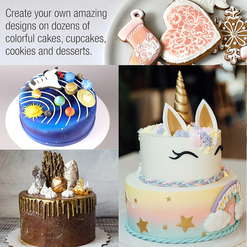 Store New Arrivals Add to Favorite View Feedback Contact Complete Cake Airbrush Decorating Kit with 24 Vibrant Food Colors - Air Brush for Cake Decoration, Cupcakes, Cookies & Desserts Description Item model number CS-24 Unit Count 16.8 Fluid Ounces Color Multiple colors (super red, sunset orange, harvest brown, etc.) Item Weight 3.45 pounds Liquid Volume 16.8 Fluid Ounces Is Discontinued By Manufacturer No Package Dimensions 8.86 x 8.43 x 4.29 inches Size 26 Piece Set Contains Everything You Need: Our kit contains everything you need to start creating edible masterpieces using your own personal touch! Kit includes a professional precision airbrush, air compressor with 3 air flow settings, 24 eye-catching vibrant U.S. Cake Supply airbrush food colors, detailed user guide manual with airbrushing tips and design techniques. To be used and enjoyed by everyone: It can be enjoyed by everyone from kids to adults and beginners to experts! Simply add a few drops of color to your airbrush, power up the compressor, pull the trigger and go! It's just that easy to start your own customized creations! Airbrushing is the Perfect Blend of Cake and Art: Unleash your imagination to create your own amazing designs on dozens of colorful cakes, cupcakes, cookies and desserts. Blend and shade colors, write script and add accents, use stencils to add detail, color fondant and other elements, plus so much more! Fun, Safe and Easy: Learning how to airbrush colors on your cakes and desserts is fun, safe and easy. The key to mastering the use of an airbrush is application practice. By following tips and techniques presented in the included users guide manual, you'll soon be comfortable using the airbrush and move on to creating edible masterpieces! Risk Free Purchase - 100% Lifetime Satisfaction Guarantee: We're so confident that you'll be delighted with our airbrush cake decoration kit that if you're not satisfied with it at anytime, contact us Product description ABOUT US We offer the best prices around on high quality products. Our E-store includes media such as books, movies, music and games while offering electronics, toys, sporting apparel, clothing, tools, general home, garden items and more. SHIPPING We are always working hard to ensure your package arrives as soon as possible. Please understand that some factors like weather, high postal traffic, and the performance of shipping companies are outside of our control. We offer free shipping to the lower 48 states and ship within 2 business days of payment, usually sooner. We do not accept P.O. Boxes. Please provide a physical address. RETURNS We offer a 30-Day Return Policy on items which you are not completely satisfied with. You have the option for a full-refund or an exchange of the item. No returns are available on items shipped outside of the USA. PAYMENT We accept PayPal. CONTACT US This page content is yet to come Please ad us to your favorite seller and visit again later Thank You CUSTOMER SATISFACTION We try our very best to make sure every customer is completely satisfied. If there's a problem, message us! We're happy to help.