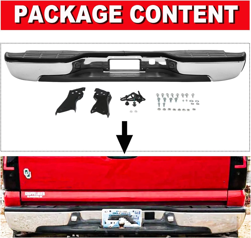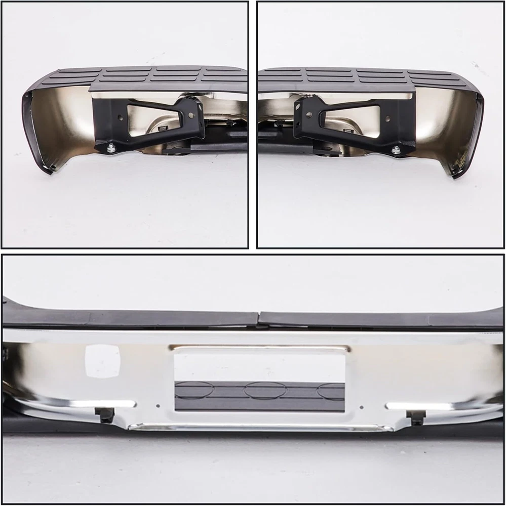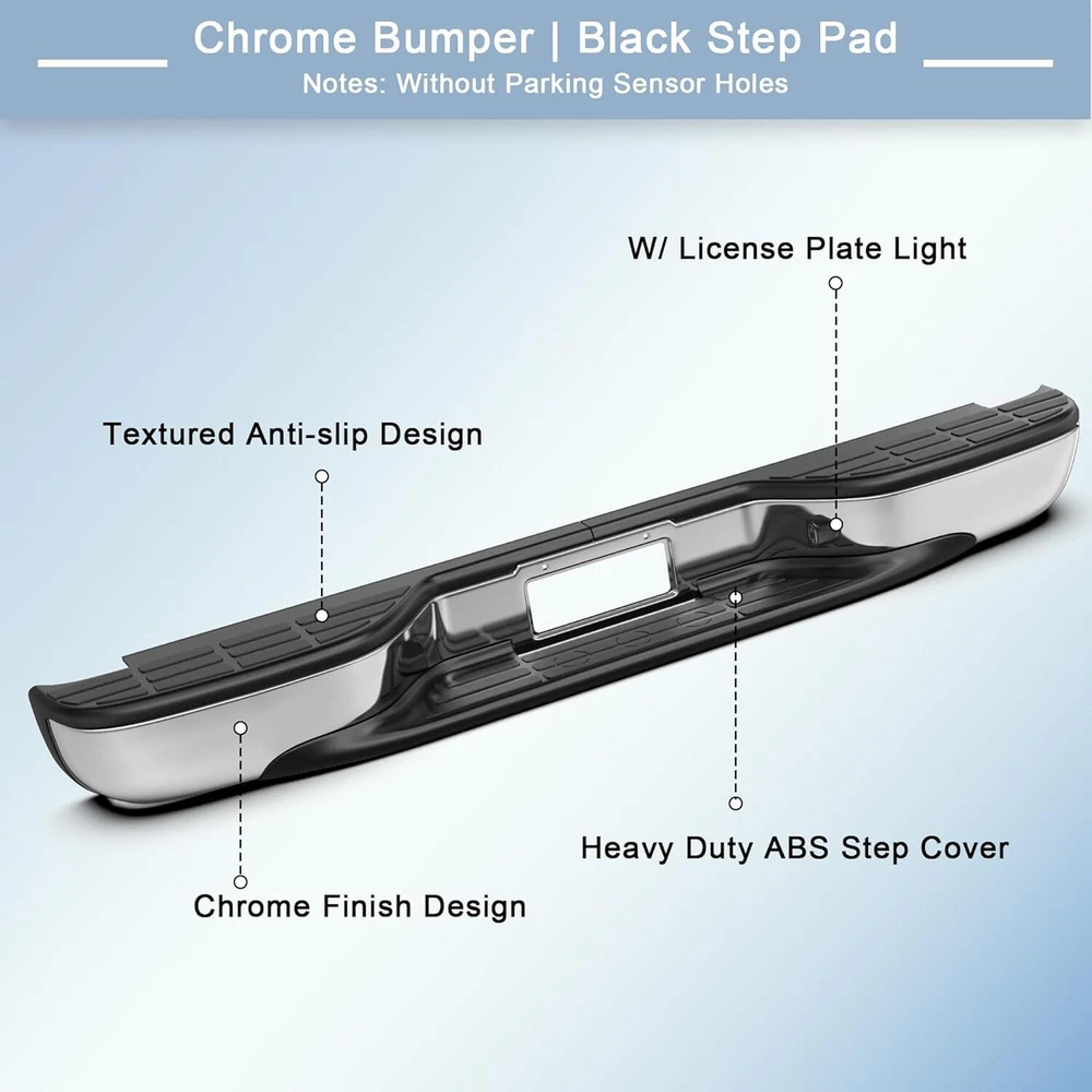 Superseded Part Number: For GM1103122, 12496085, 31006, GM1103124,88944059 Features: Durable, Easy Installation, No Drilling Required, Scratch-Resistant Feature 1: Mounting Hardware Included Fits: For 1999-2006 Chevrolet Silverado 1500, 2007 Chevrolet Silverado 1500 Classic, 1999-2004 Chevrolet Silverado 2500, 1999-2006 GMC Sierra 1500, 2007 GMC Sierra 1500 Classic, 1999-2004 GMC Sierra 2500 Bed Type: Fleetside / Styleside Bumper Cut-Outs: Without Park Assist Sensor Cut-out Attachment Type: Bolt-On Items Included: Rear Bumper, Bumper Step Pad, License Plate Lights Interchange Part Number: Replace for GM1103122 , 12496085, 31006, GM1103124,88944059 Type: Bumper Assembly Compatible Year: 1999, 2000, 2001, 2002, 2003, 2004, 2005, 2006, 2007 Shipping Notes: We have multiple warehouses in US, and will choose the nearest one for shipping, according to your address and our inventory MPN: SMT10474 UPC: Does not apply Placement on Vehicle: Rear Performance Part: No Fit for: Compatible with 2007 Classic Models Material: Steel Style: Rear Step Bumper Without Parking Aid Sensor Holes Other Part Number: Replace for, 11722355 12473000 GM1191119 GM1191120 GM1191121 Vintage Part: No Item Condition: New Manufacturer Warranty: 1 Year Brand: Unbranded Feature 2: Scratch-resistant gtin13: Does not apply Fitment Type: Direct Replacement Modified Item: No Universal Fitment: No Finish: Polished Model: For Silverado 1500, Silverado 1500 Classic, Silverado 2500, Sierra 1500, Sierra 1500 Classic, Sierra 2500 OE/OEM Part Number: 11722355, 12473000, 12496085, 15705674 Manufacturer Part Number: Yes Color: Black & Chrome Applicable Regions: US Size: Pls see the pic for reference