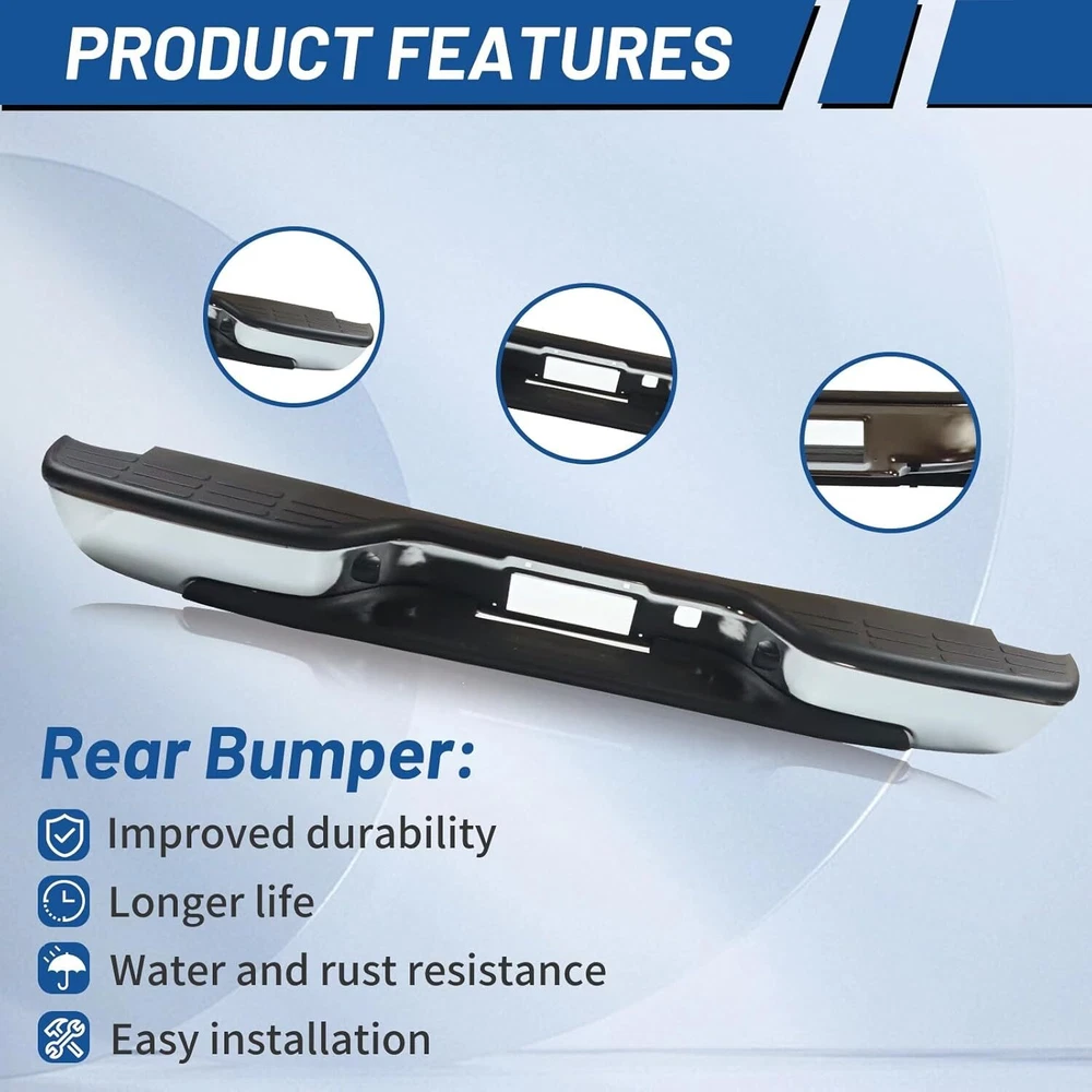 Chrome Steel Step Rear Bumper Assembly Replacement Compatible with 1999-2006 Chevy Silverado GMC Sierra 1500 2007 Chevy Silverado GMC Sierra 1500 Classic Product Description About this item Compatible with:1999 2000 2001 2002 2003 2004 2005 2006 Chevy Silverado 1500 and GMC Sierra 1500;2007 Chevy Silverado 1500 Classic and 2007 GMC Sierra 1500 Classic. Attention:Only Fits FleetSide Bed (Straight Bed) Models.Does Not Fit Stepside Beds or 2500HD/3500HD Models.Doesn't fit Sierra Denali Model. Replacement Number:GM1103122,GM1103123,GM1103124,GM1103125, 15705669, 15705670, 15705673, 15705674, Package Included:1x Pickup Rear Bumper,1 x Set of License Plate Lamp with Harness,1 x Set of Mounting Brackets, Some Bolts and Screws Lifetime Servic:Guaranteed quick response to all your questions; life-long service for each purchase,providing you with peace of mind and confidence in your purchase. Package Content: 1x Pickup Rear Bumper 1 x Set of License Plate Lamp with Harness 1 x Set of Mounting Brackets Some Bolts and Screws Item Specifications: Condition: 100% Brand New Color: Chorme Material: Carbon Steel Warranty: 5 Years Type: Bumper Assembly Placement on Vehicle: Rear Fitment Type: Direct Replacement Fitment: 1999-2006 Chevrolet Silverado 1500 2007 Chevrolet Silverado 1500 Classic 1999-2006 GMC Sierra 1500 2007 GMC Sierra 1500 Classic Only Fits FleetSide Bed (Straight Bed) Models.Does Not Fit Stepside Beds or 2500/3500 HD Models Simple Installation Process: Direct Bolt-on OE Fitment or Replacement for the Stock Unit. Designed as a direct replacement for your original step bumper. Made to factory specifications for a hassle-free installation, guaranteed. Practical and Ornamental Coexis: The rear step bumper is made from tough steel to withstand heavy use. Upgrade your vehicle with a new look. High-quality Steel Raw Materials: Manufactured from Carbon steel plating and high grade ABS, with superior efficiency and durability. Coated with corrosion resistant paint,will not receive the impact of rainwater. Integrated Step: lt features an integrated step that allows easy access to the rear of your vehicle, making loading and unloading cargo more convenient. It's textured design allows you to stand on it securely. Fits Perfectly with the Vehicle: The steel rear step bumper is designed to be a direct replacement for factory bumpers, ensuring a perfect fit and seamless integration with your vehicle. Protect the Vehicle and Reduce Damage: lt provides excellent rear-end protection for your vehicle, protecting it from bumps and scratches. Payment Delivery Details Return Feedback Contact us Payment We accept payment by any of the following methods: Delivery Details Shipping Time Your item will ship within 3 days (Mon-Fri) of your cleared payment. Items will be shipped to the shipping address you specify via Paypal only. We are NOT able to change the shipping address once payment has been made. A tracking number will be provided once your item has shipped. Domestic Buyers No shipping to PO BOX and APO addresses. No shipping to PR, AK, HI. International Buyers International buyers please note: Import duties, taxes and charges are not included in the item price or shipping charges. These charges are the buyer's responsibility. Please check with your country's customs office to determine what these additional costs will be prior to bidding/buying. Return All returns must have RMA number. Returns with no RMA number will be avoided! 1. Changed your mind and don't want the item anymore? We back our products with a 30-DAY SATISFACTION GUARANTEE! (Item must be in the original condition as it was received. 30 Days Refund, 30 Day Replacement.). Brand New items will have 30 days warranty or replacement policy. 2. Restocking fees will be charged ONLY on Brand New items. 3. Defective/Dead items will be fully refunded or replaced after matching the serial number with the one in our records. 4. Mobile phones and tablets MUST be restored to factory setting. 5. If your order arrives incorrect or the package is damaged in result of a carrier company, you must notify us within 4 days of receipt. Defective items will be credited only after matching the serial number with the one in our records. We are aware of all fraud cases and have all the items details in our records. 6. If there is a quality issue or malfunction with the product, we strongly suggest you to contact the original manufacturer. 7. Any item needed to be returned must be securely packaged, insured and shipped with tracking for safety. We cannot be responsible for lost damaged packages. We carefully inspect returned items upon receipt before any possible refunds, credits, or exchanges. Feedback Customer satisfaction is our top priority. Please give us a chance to resolve any issues before posting a feedback. If you have any problem with your order, please contact us and we will do our best to make you satisfied. Contact us Business Hours: Monday - Friday : 9:30AM – 5:30PM Eastern Standard Time. Saturday, Sunday Closed. For any questions or concerns, please feel free to contact us!