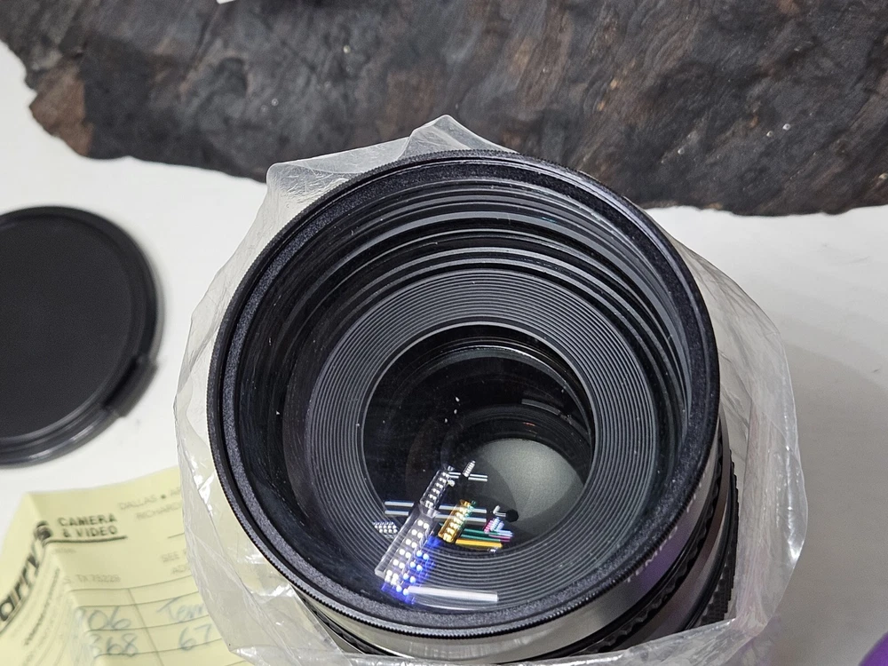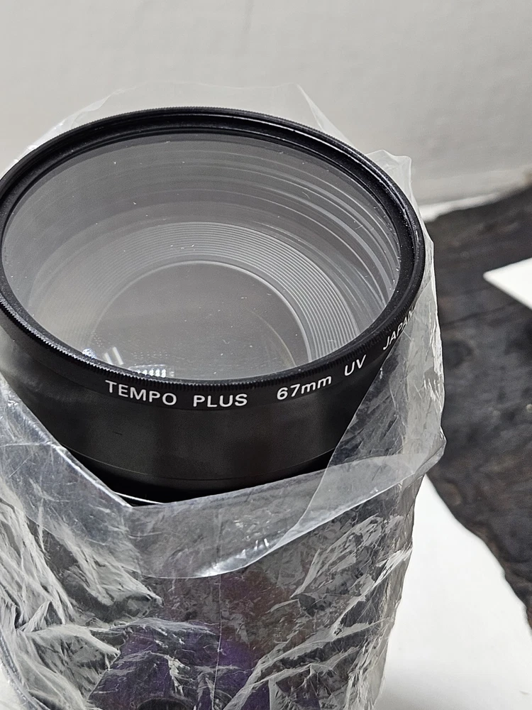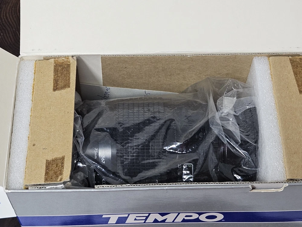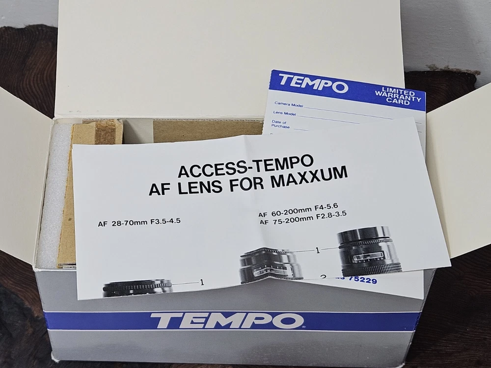 This is a Tempo zoom lens with a focal length of 75-200mm and a maximum aperture of f/3.5. It has auto focus and is mountable on a Maxxum AF camera. The lens comes complete in its original box with a 67mm UV filter included.