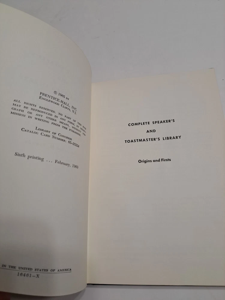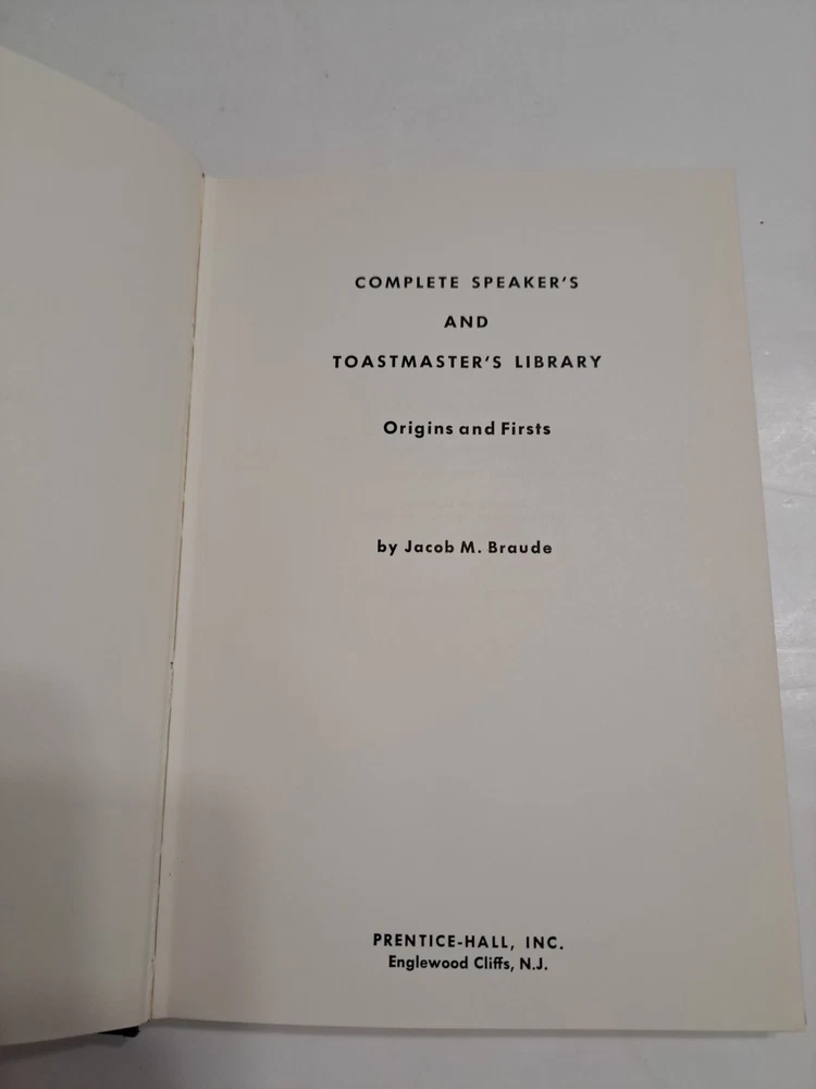 "Complete Speaker's & ToastMaster's Library ORIGINS & FIRSTS By Jacob M. Braude" is a book published in 1969 in the United States. Written in English, it covers a comprehensive collection of speeches, toasts, and presentations by renowned authors and speakers. With a focus on origins and firsts, this book serves as a valuable resource for those interested in public speaking and communication skills. Jacob M. Braude, the author, brings his expertise and knowledge to provide insights. Sold as found in estate! We sell items as found in estate We don’t wash or clean the items We are estate liquidators Please don't hesitate to make us an offer We stay in business to help people liquidate and to help you make smart purchases Inv 81825 LZ