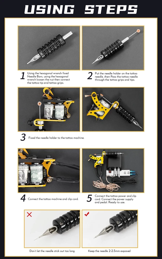 Feature: 1 - Tattoo machine 10 wrap coils, made of high quality iron.Lightweight and low vibrations. 2 - Fit for all kinds of grips and needles. 3 - Tattoo power supply with foot pedal and clip cord, Provide quick and accurate activation/voltage adjustments. 4 - 316 stainless steel tattoo needles. Individual Packaging. 5 - Made of aluminium alloy tattoo grips, knurling non-slip design. Package List: As shown in the picture