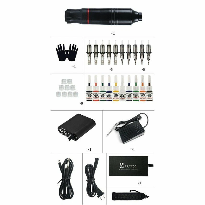 Description: Safe to be used for tattoo beginners. A good helper for your tattoo practice. Why not have a try? Features: Great for lining and shading. Highly efficient, scientific handle design. Lightweight. low-noise. Made of aluminum alloy material, durable for use. Stable performance, suitable for any tattoo artist. No noise, no thermal vibration motor audio interface. All in one kit, there are tattoo motor pen, gloves, tattoo needles (5M1 & 5RL), tattoo inks, tattoo ink cups, tattoo foot pedal, clip cord, storage bag, power cable and power supply. Safer, more stable and powerful power supply system, its frequency can reach to 10,000rpm, performs well in your tattoo art DIY. Low noise and low heat, giving your clients a comfortable tattoo experience. Adjustable voltage, you can control the voltage easily, meeting your needs. 10 Bottles of tattoo ink are included, their colors are great. Easy to use, nice for tattoo salon. Specifications: Item Type: Tattoo Machine Kit Material: ABS, Alloy Color: Black, Red (Optional) Package Weight: Approx. 787g Package Size: Approx. 17.5 * 14 * 8.5cm Package List: ( as you choose ) 1 * Tattoo Motor Pen 1 Pair * Gloves 5 * Tattoo Needles (5M1) 5 * Tattoo Needles (5RL) 9 * Tattoo Ink Cups with Base(L) 1 * Power Cable (AU Plug) 1 * Tattoo Power Supply 1 * 5ML Tattoo Ink (10 Colors)
