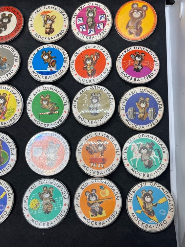 Complete set of 25 USSR badges, symbol of the 1980 Olympics "Olympic Bear" Значки в хорошем состоянии, застежки целые. Диаметр значка - 55 мм / 2 дюйма