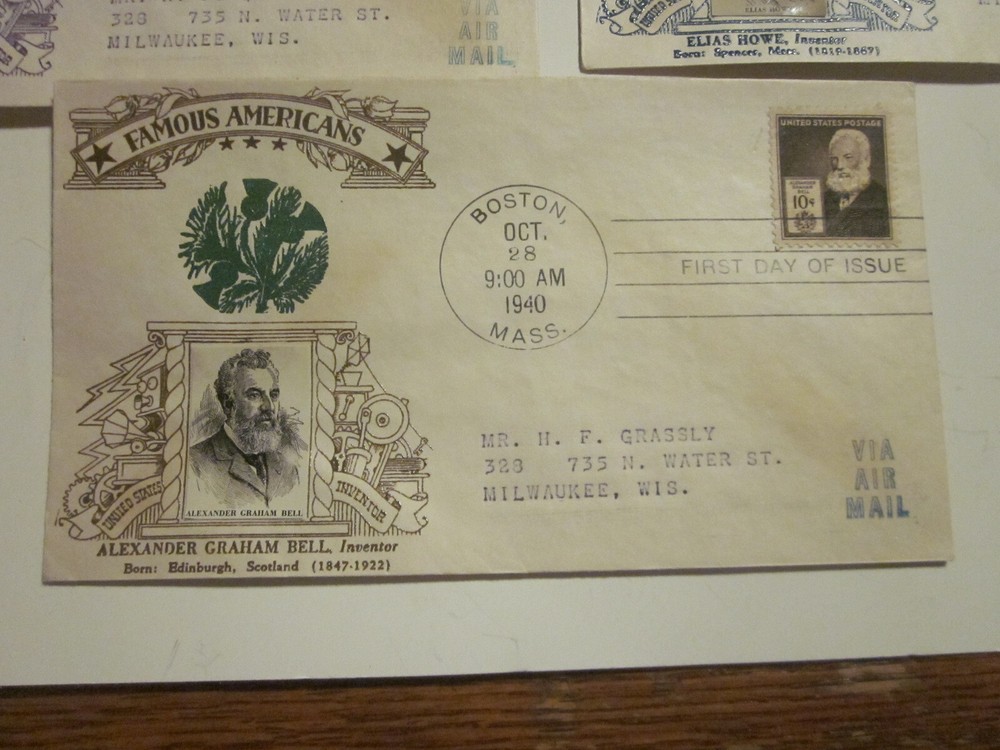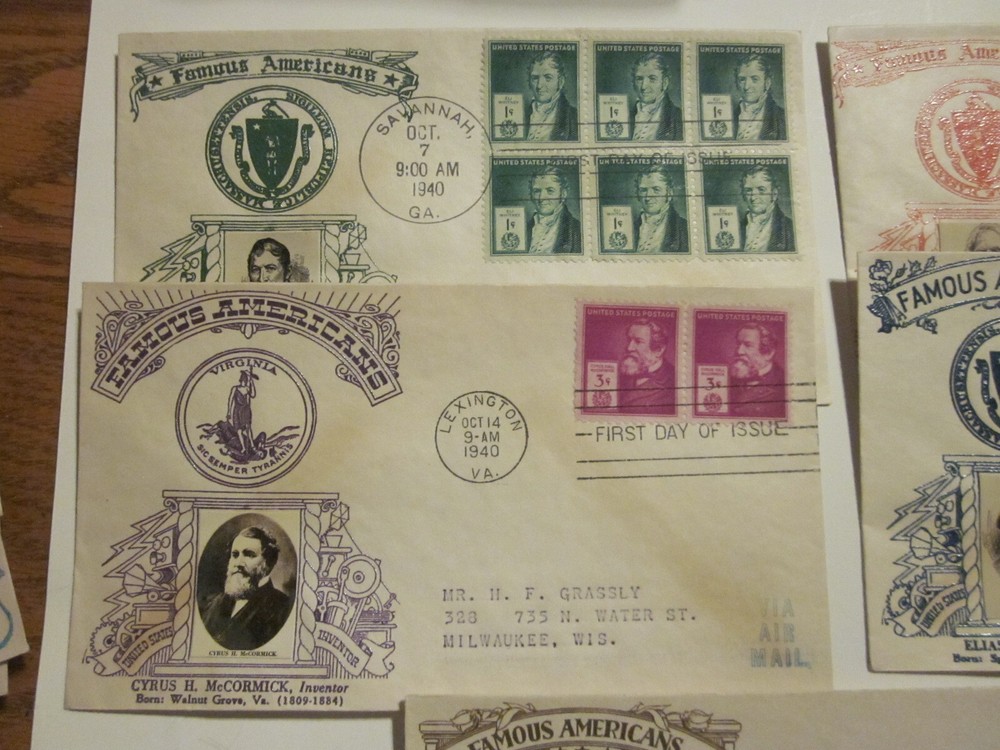 Explore the fascinating world of early American innovation with this complete set of five First Day Cover envelopes, each celebrating a prominent inventor with a Crosby PHOTO Cachet. These envelopes, issued between 1931 and 1940, are a tangible piece of history, showcasing the airmail journey across the United States and honoring the legacy of historical figures who have shaped our nation. Each cover is a unique piece of postal history, ungraded and uncertified, originating from the United States and featuring cancellation marks from their first day of issue. The collection offers a rare glimpse into the past, making it an ideal find for enthusiasts of stamps, postal history, and the American spirit of innovation.