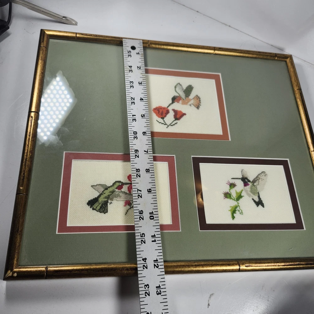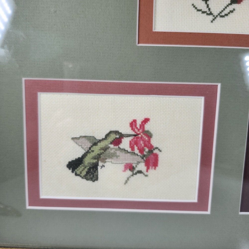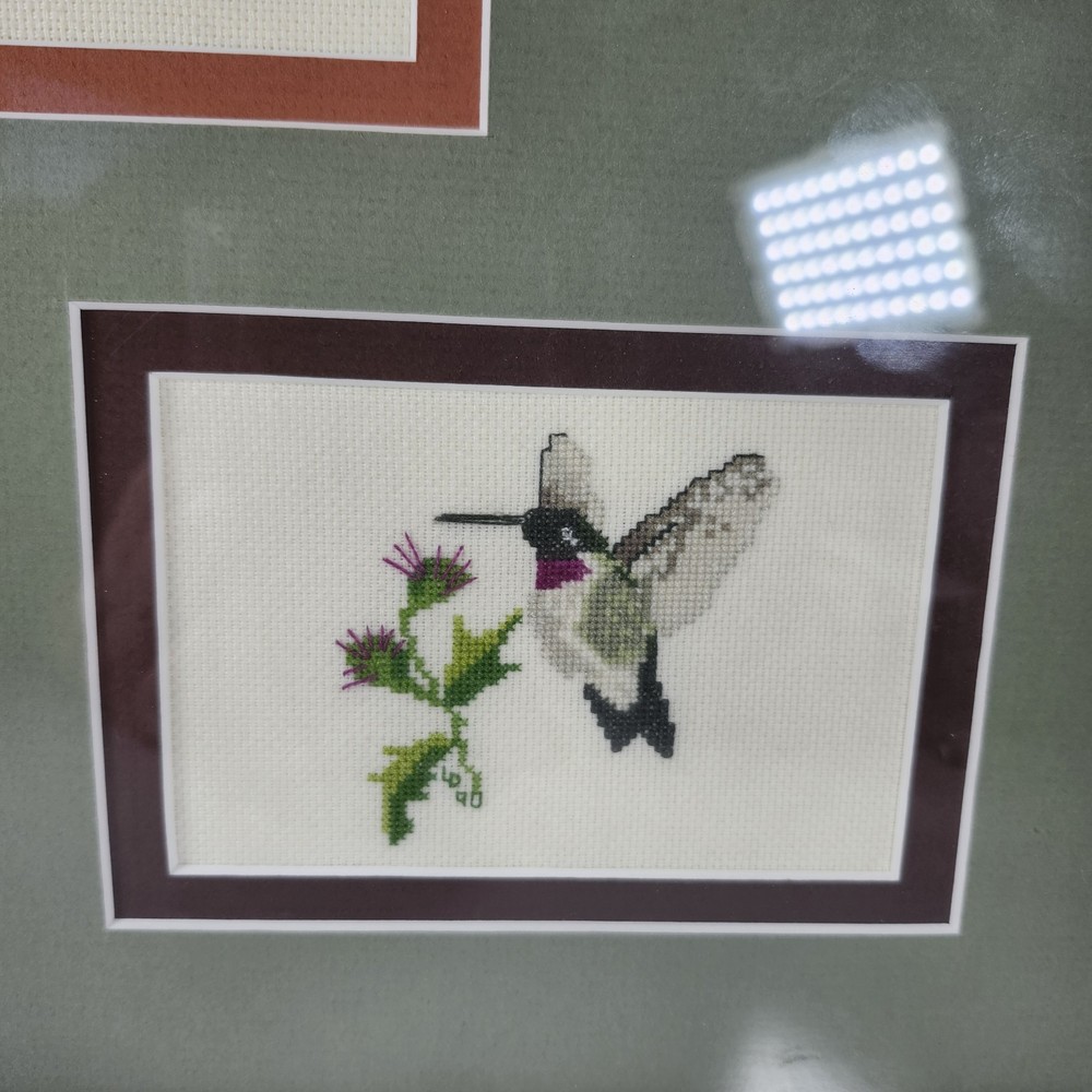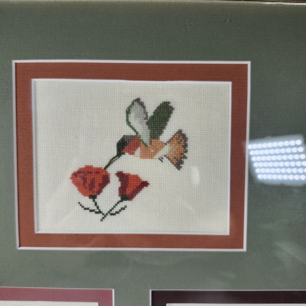 Completed Cross Stitch Artwork - 3 Humming Birds and Flowers Framed Matted. Super colorful and just gorgeous!! EUC. Professionally Matted and Framed. Frame measures about 15" x 12" with each displayed cross stitch measuring at 3.5" x 4.5". This is gift signed on the back with a date of July 18, 2015. PLEASE SEE ALL PHOTOS PRIOR TO PURCHASING!!