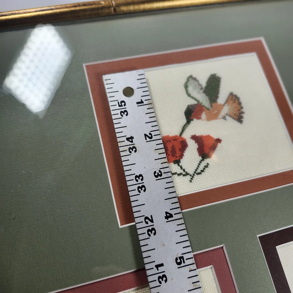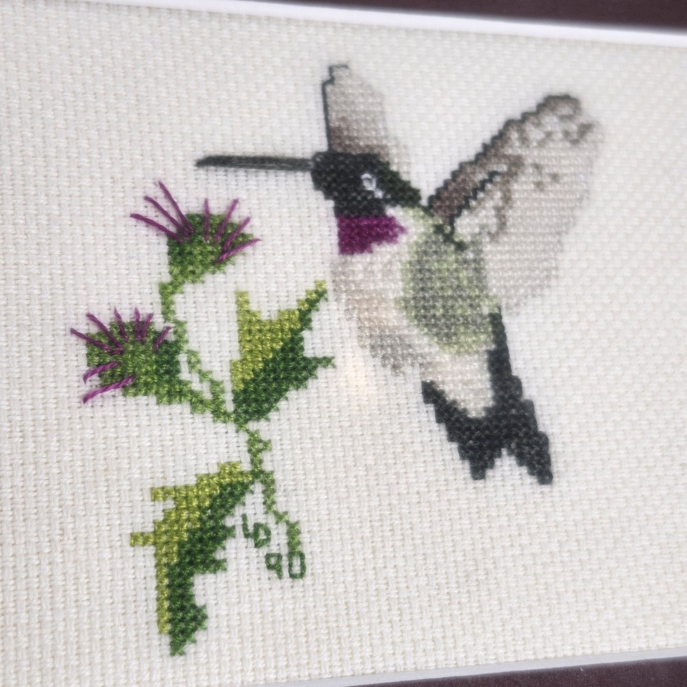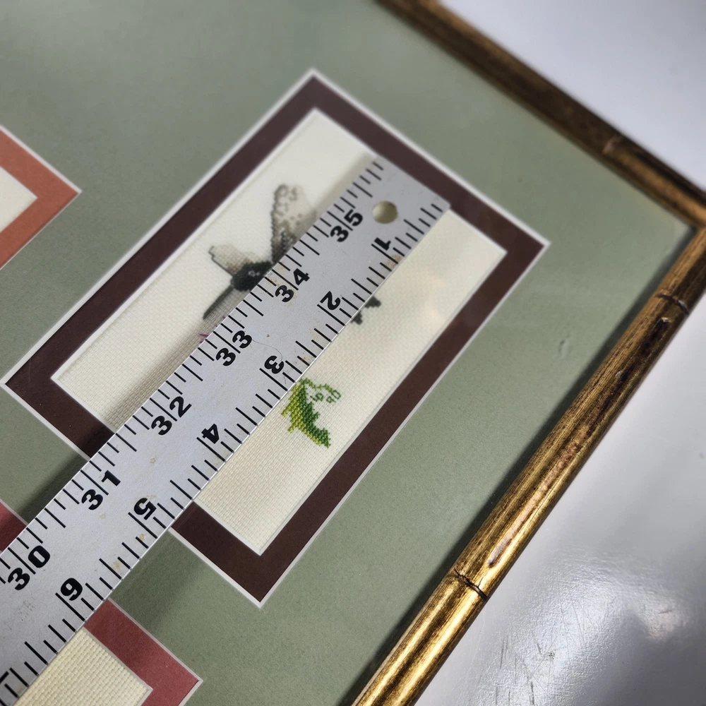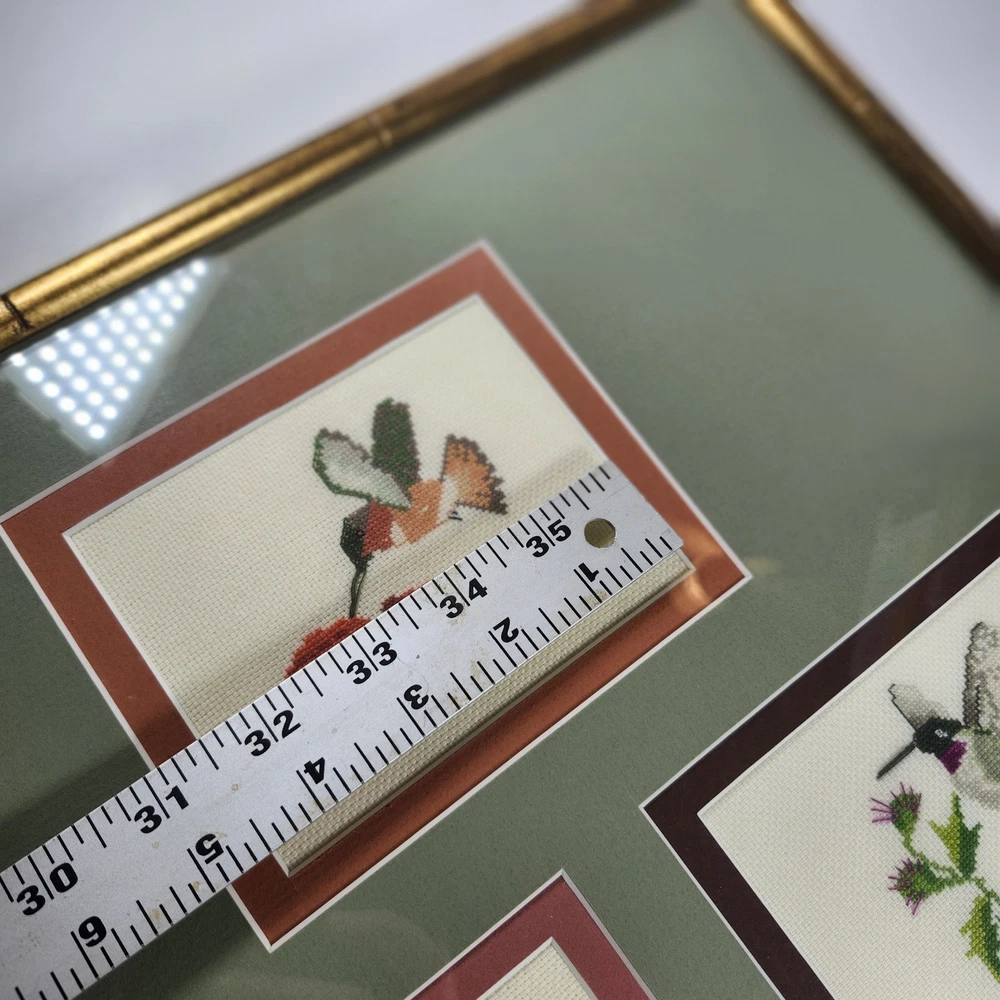 Completed Cross Stitch Artwork - 3 Humming Birds and Flowers Framed Matted. Super colorful and just gorgeous!! EUC. Professionally Matted and Framed. Frame measures about 15" x 12" with each displayed cross stitch measuring at 3.5" x 4.5". This is gift signed on the back with a date of July 18, 2015. PLEASE SEE ALL PHOTOS PRIOR TO PURCHASING!!