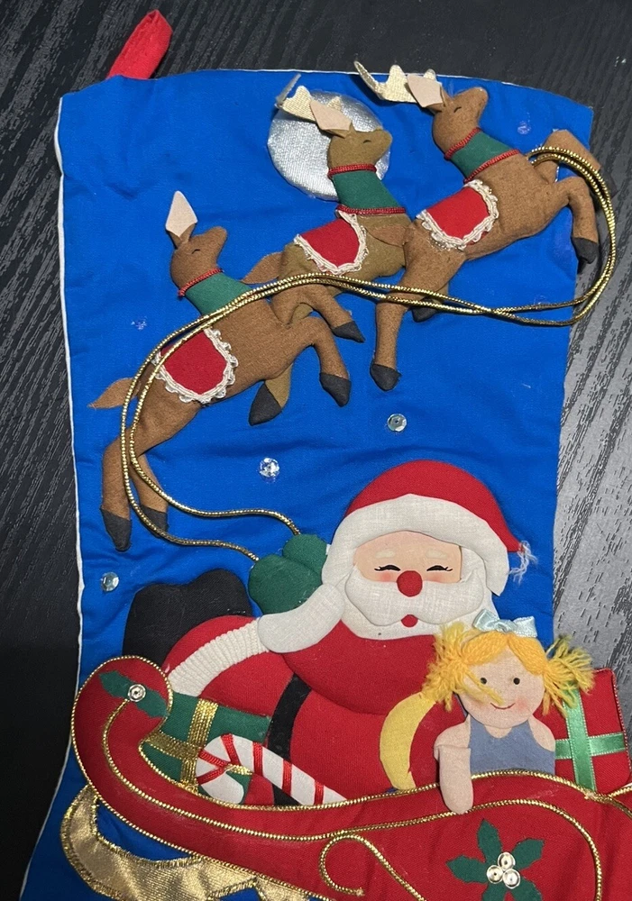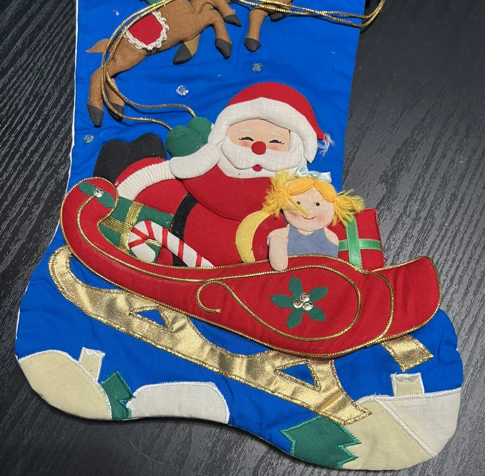Completed VTG Bucilla Christmas Stocking Santa Flying Sleigh Reindeer Doll 3D