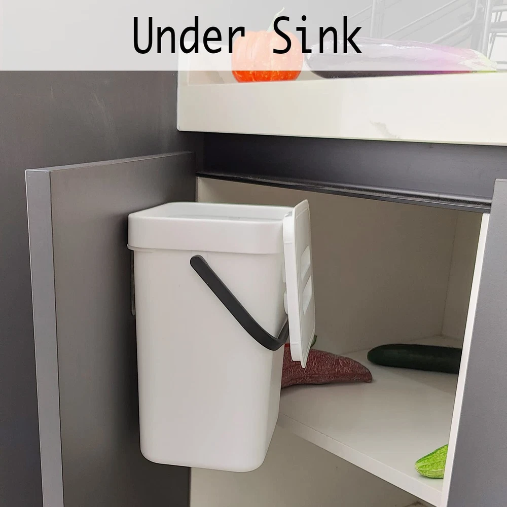 Odor-Blocking & Fruit Fly Free: Say goodbye to the smelly decomposing waste. Our compost bin for kitchen counter comes with a precisely-fit lid, you can let the scraps build up for several days without worrying about attracting fruit flies or terrible smells into your kitchen. Multi-purpose: This indoor compost bin can be put on the kitchen countertop; mounted on the wall in the kitchen/bathroom/laundry room with adhesive tape; hung over the cabinet doors, pantry doors, cupboard, under sink with over-the-door-hook. Convenient: Use this plastic compost bucket to fruit scraps, vegetable peelings and other compostable materials for several days, and save your trips to your outdoor compost piles or bins. Compact Size: 1.3 Gallons / 5 Liter. 9.6” x 7.5” x 5.7”. The kitchen compost container with lid doesn't take up too much countertop space. Perfectly fits on a countertop, under the sink, or in the pantry. Dishwasher Safe & BPA Free: The compost pail is made of high-quality, BPA-free plastic that is stain and odor resistant, easy to wash. The retention ring of the comosting bin helps keep the garbage bags from sliding down.
