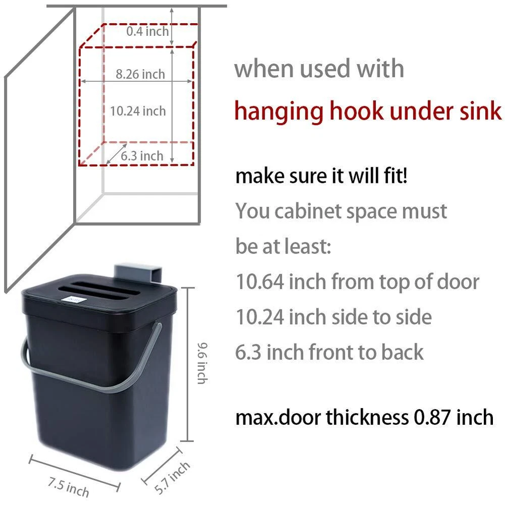 MULTI-PURPOSE - The design of the hand-held, hook and clipboard allows our black garbage cans to be used with reusable shopping bags.The clipboard design allows the small garbage bin to be suspended on any smooth surface suitable for office,kitchen,bathroom,bedroom,laundry room,collecting dog poopetc. QUICK& EASY INSTALLATION - We are equipped with hook and clipboard for this composting bucket,you can use one of the accessories according to where you need to hang it. When using the clipboard, you need to clean the place where you want to paste. Please note that this kitchen composting bucket can't hold more than 13 pounds or 1.5 gallons. NO FRUIT FLIES & EASY CLEAN - The waste bin is made of high quality and non-toxic .There is a hook on the lid, which can be hung over the trash can when you open it. The lid design effectively prevents the odor from escaping, which is a good anti-dog garbage bin. Indoor Plastic Compost Bucket - Measures 7.5 × 5.7 × 9.6" high, 1.3 gallon capacity. The hanging trash can is durable,It's easy to clean with soap and water. STUNNING DESIGN - Counter top Compost Container - Stylish,sturdy and simple colors and designs make this garbage bin complements any decor so that this small kitchen compost bin can sit conveniently on your counter-top or wherever you need it. SATISFACTION - Our dustbin is made of high quality material, you will like it. If you are not satisfied with the purchase, with our 30-day return privilege. If you have any quality problem, pls contact us,our team will give you a satisfactory answer.